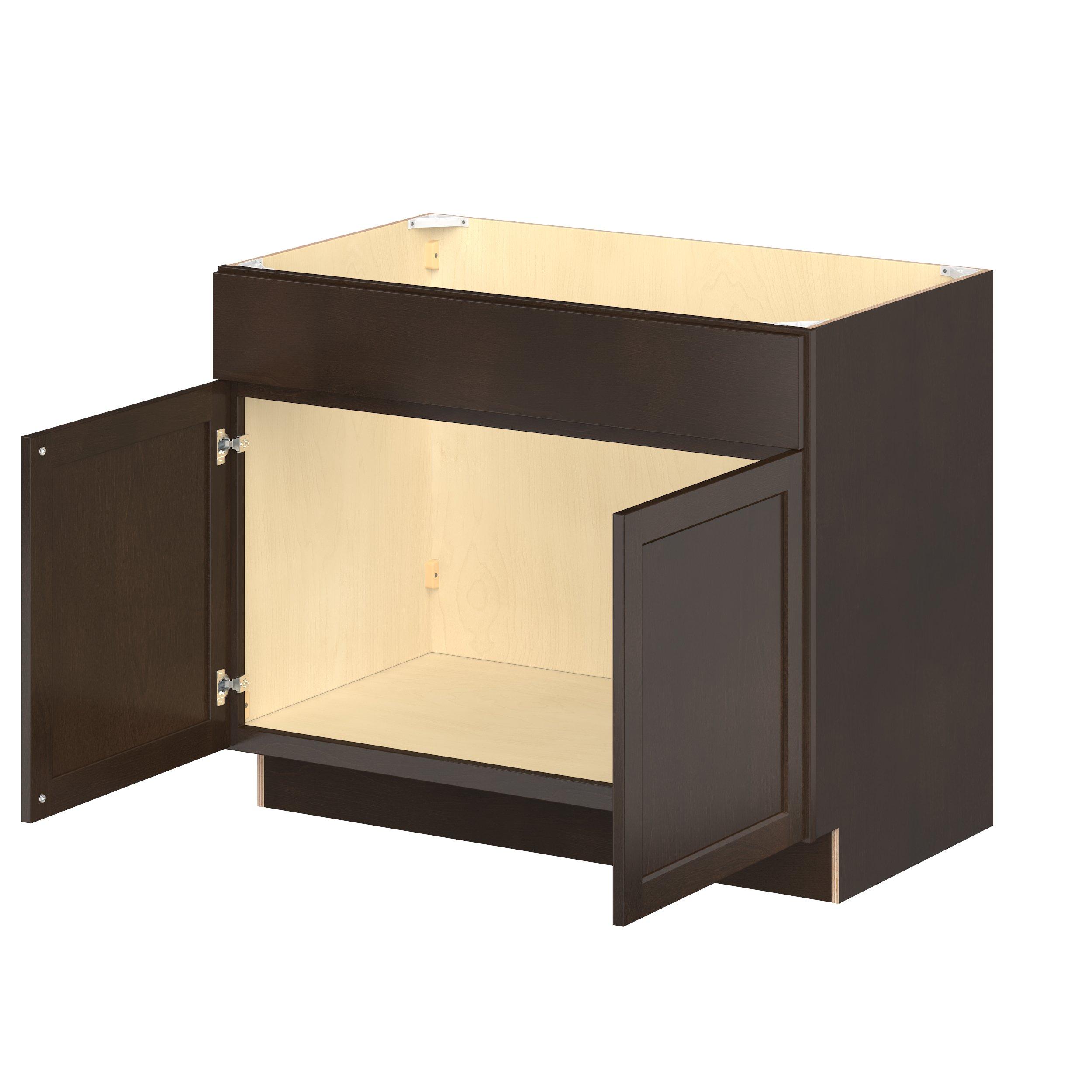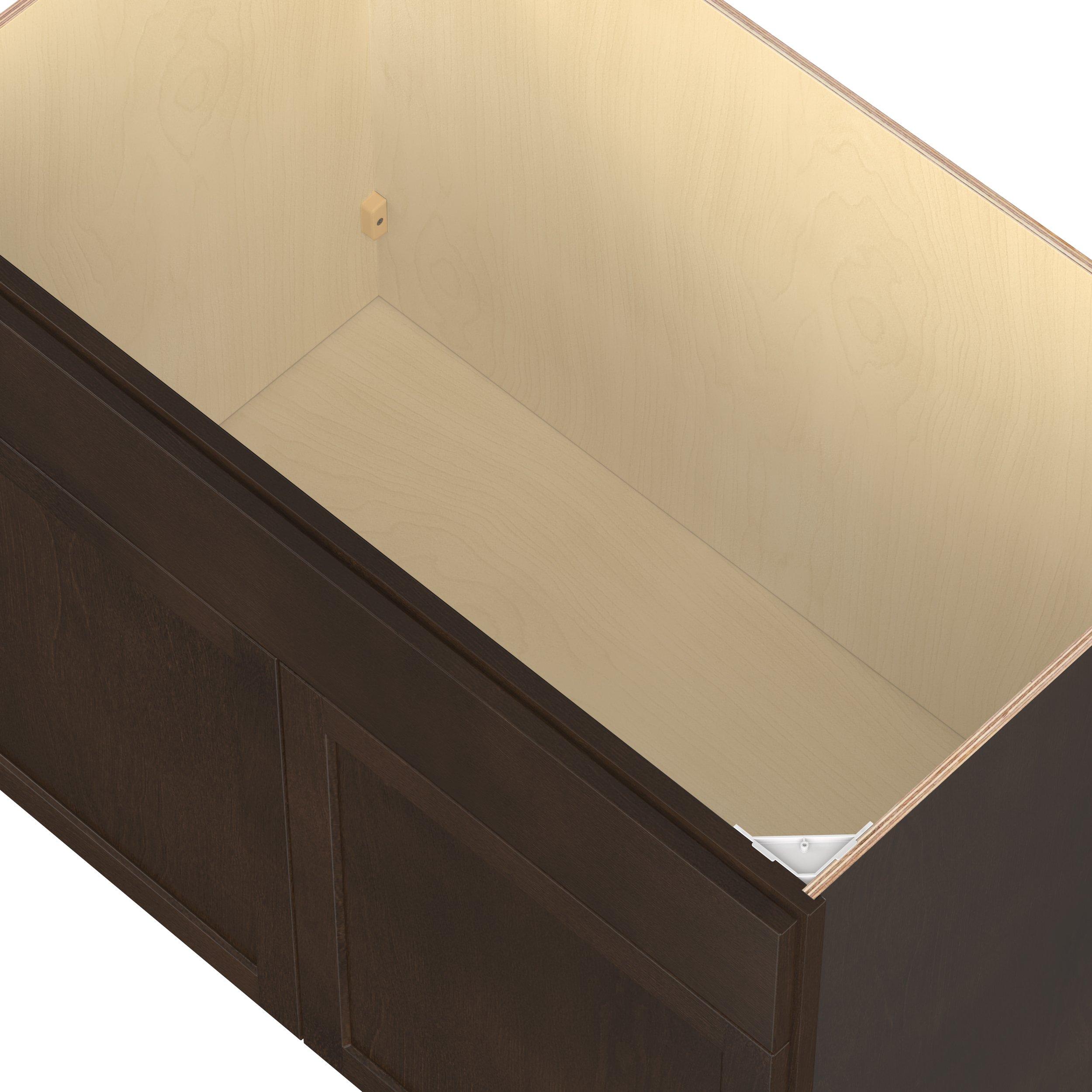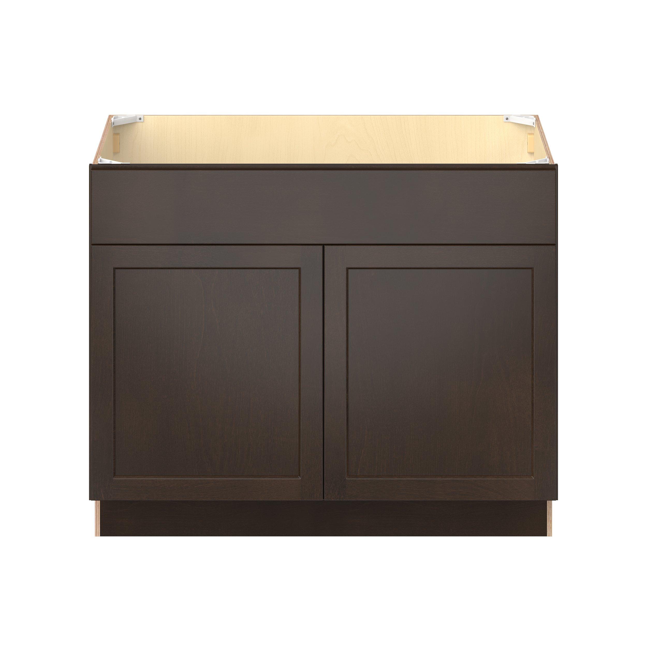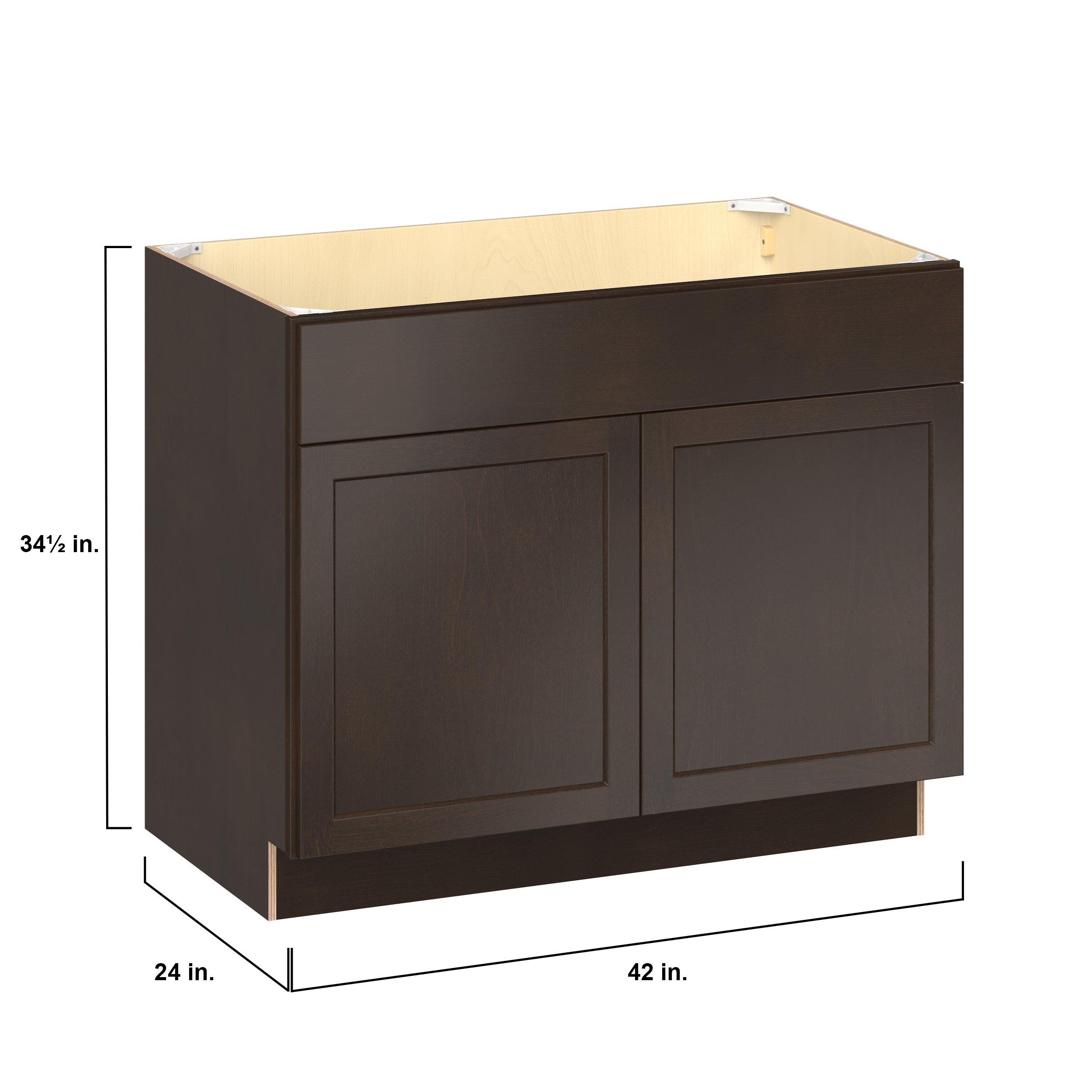Embrace the timeless charm of the Baxley classic shaker door style. Studio Design Collection Baxley 42 in. Stained Cocoa Sink Base Cabinet with False Front features all plywood construction, offering both superior strength and sophistication to your space. Featuring 5-piece solid wood doors and dovetail drawer joints, these cabinets offer durability and elegance. Baxley classic shaker door style is designed to retain its stunning appearance and withstand the test of time.