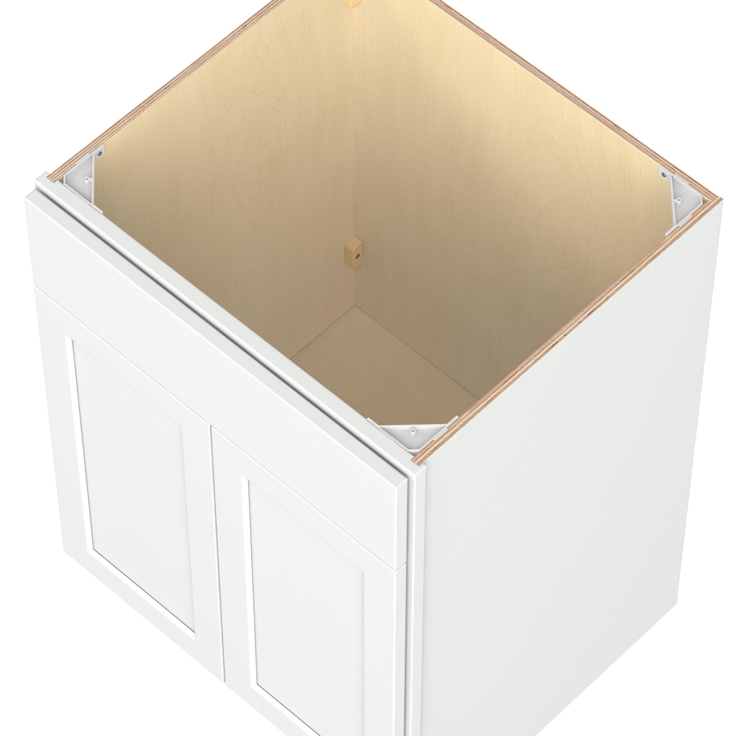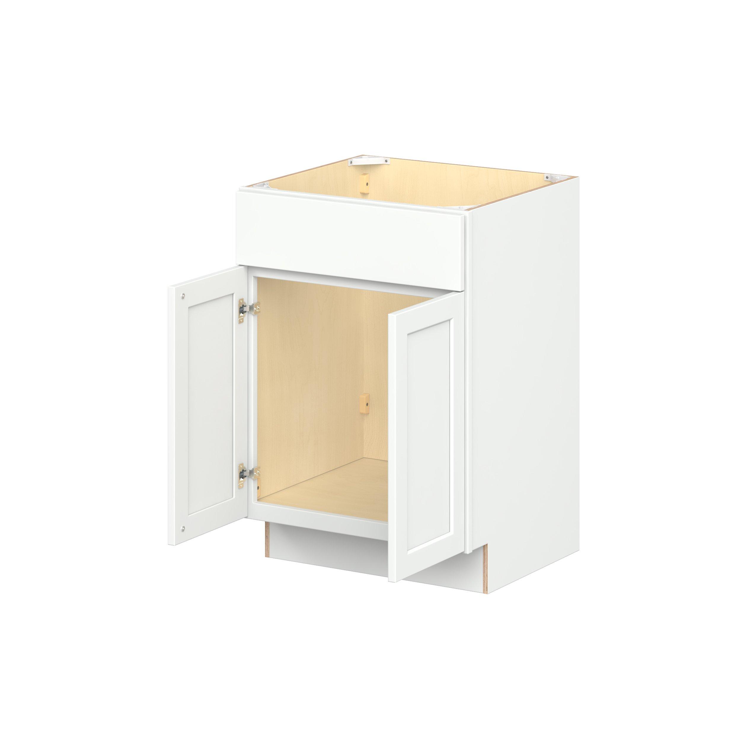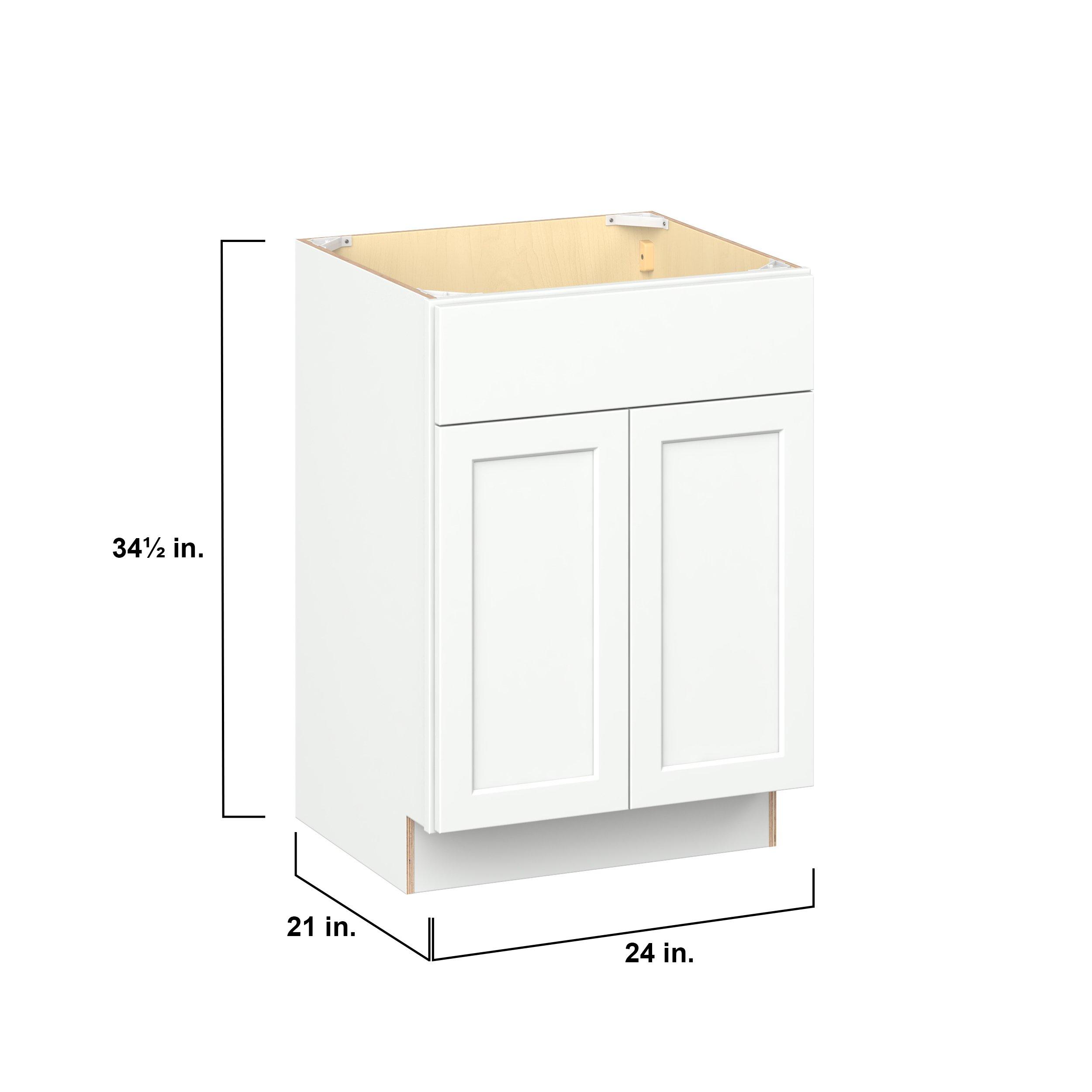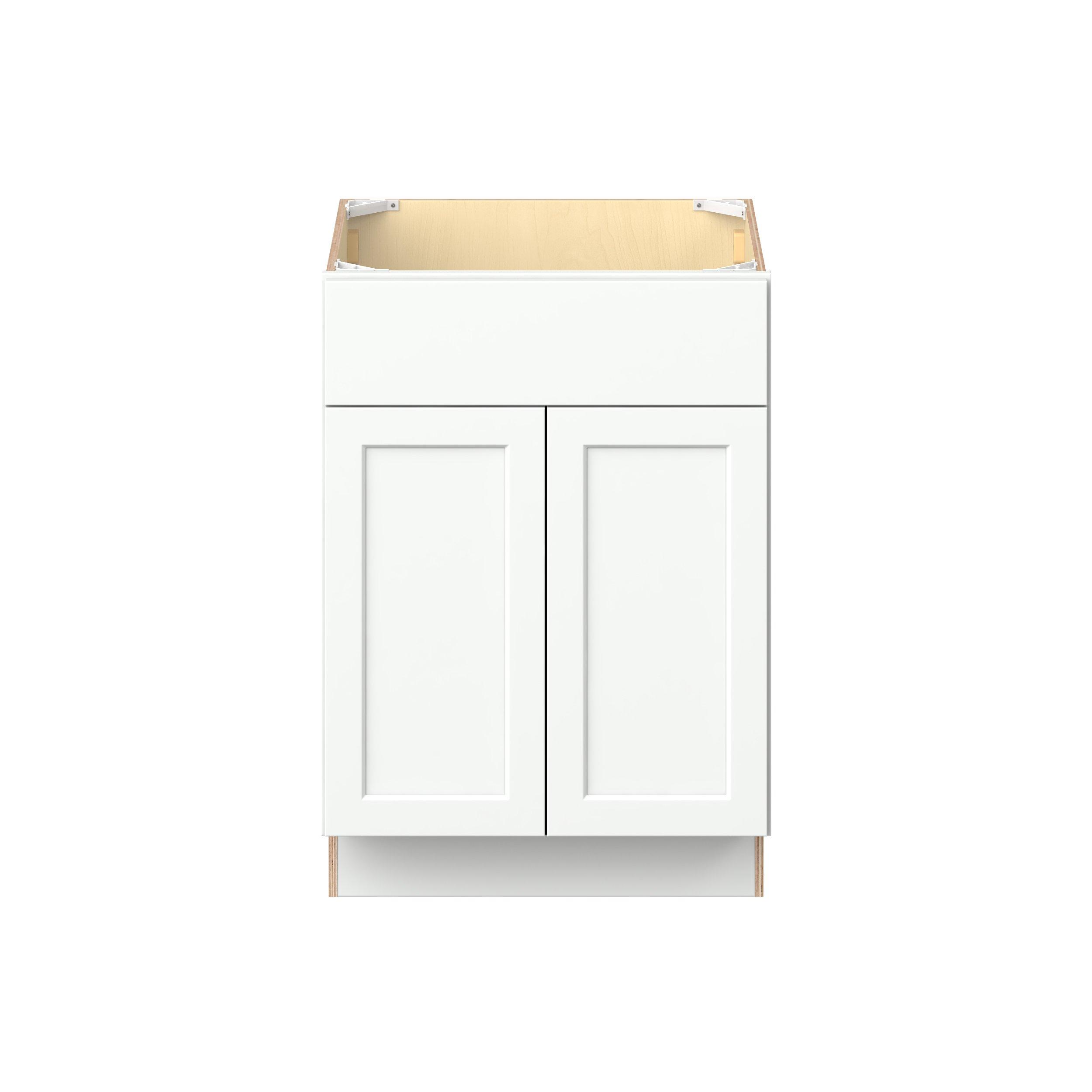 Embrace the timeless charm of the Baxley classic shaker door style. Studio Design Collection Baxley 24 in. Painted Pure White Vanity Sink Base Cabinet features all plywood construction, offering both superior strength and sophistication to your space. Featuring 5-piece MDF doors and dovetail drawer joints, these cabinets offer durability and elegance. Baxley classic shaker door style is designed to retain its stunning appearance and withstand the test of time.