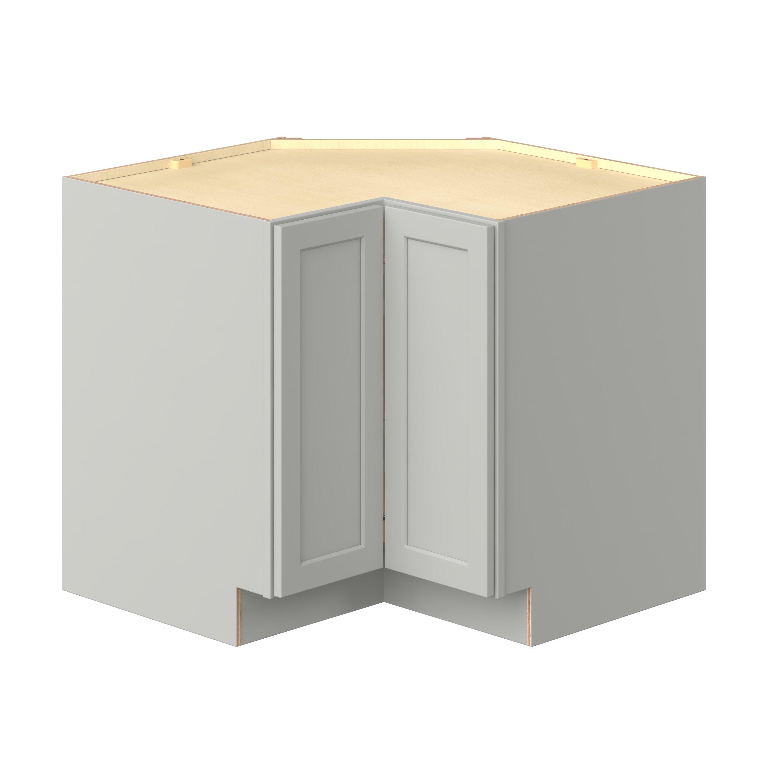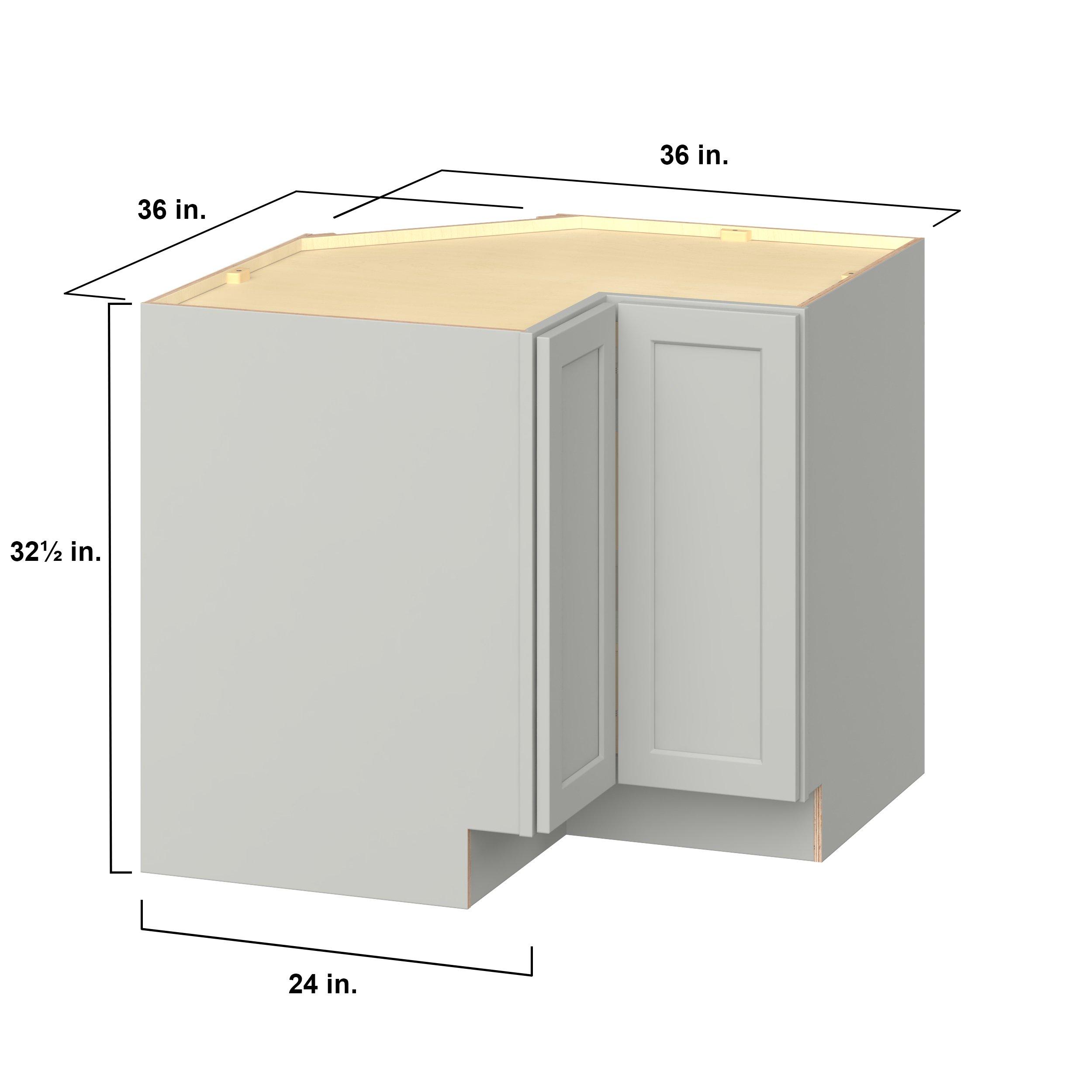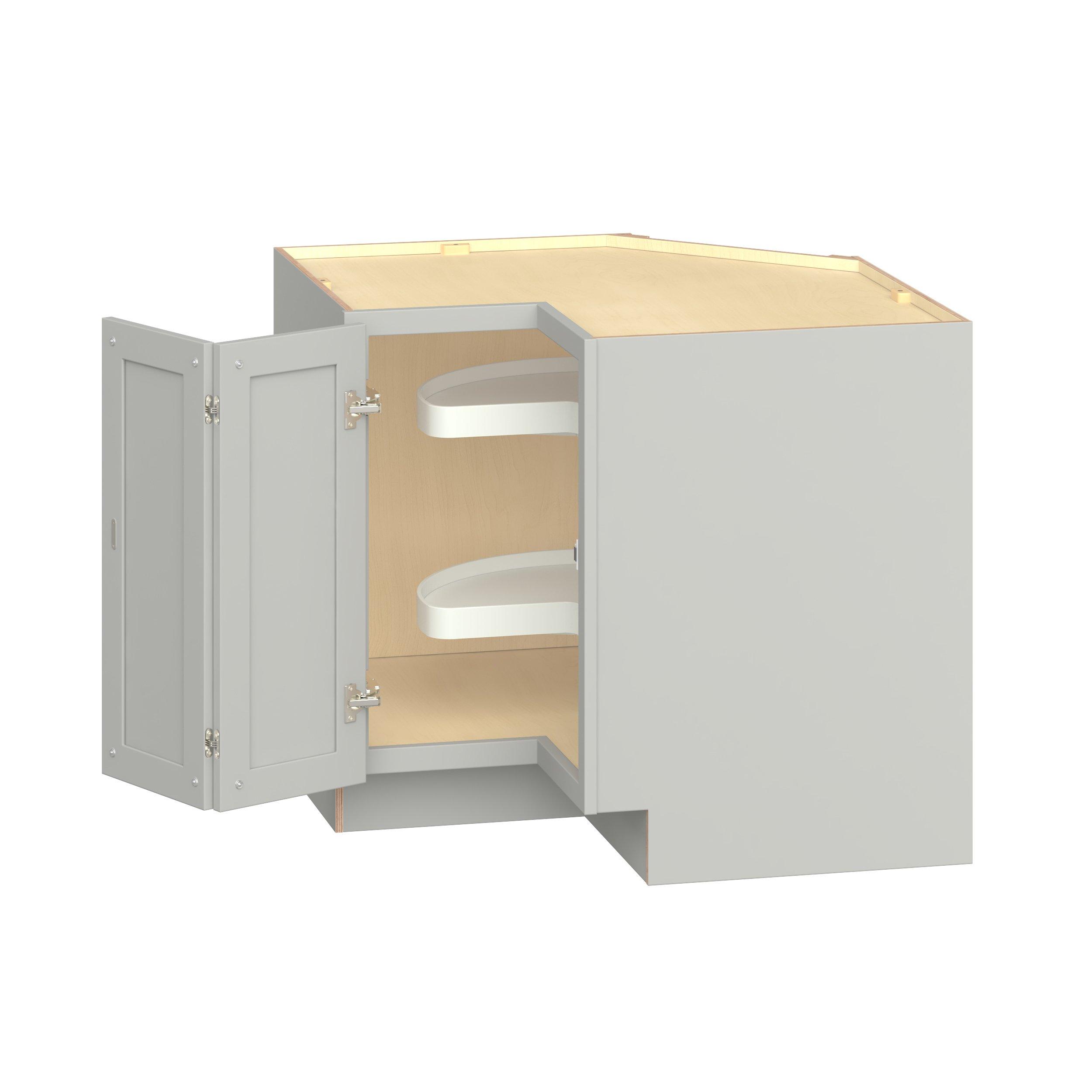 Embrace the timeless charm of the Baxley classic shaker door style. Studio Design Collection Baxley 30 in. Painted Whisper Gray Lazy Susan Corner Base Cabinet - ADA features all plywood construction, offering both superior strength and sophistication to your space. Featuring 5-piece MDF doors and dovetail drawer joints, these cabinets offer durability and elegance. Baxley classic shaker door style is designed to retain its stunning appearance and withstand the test of time.