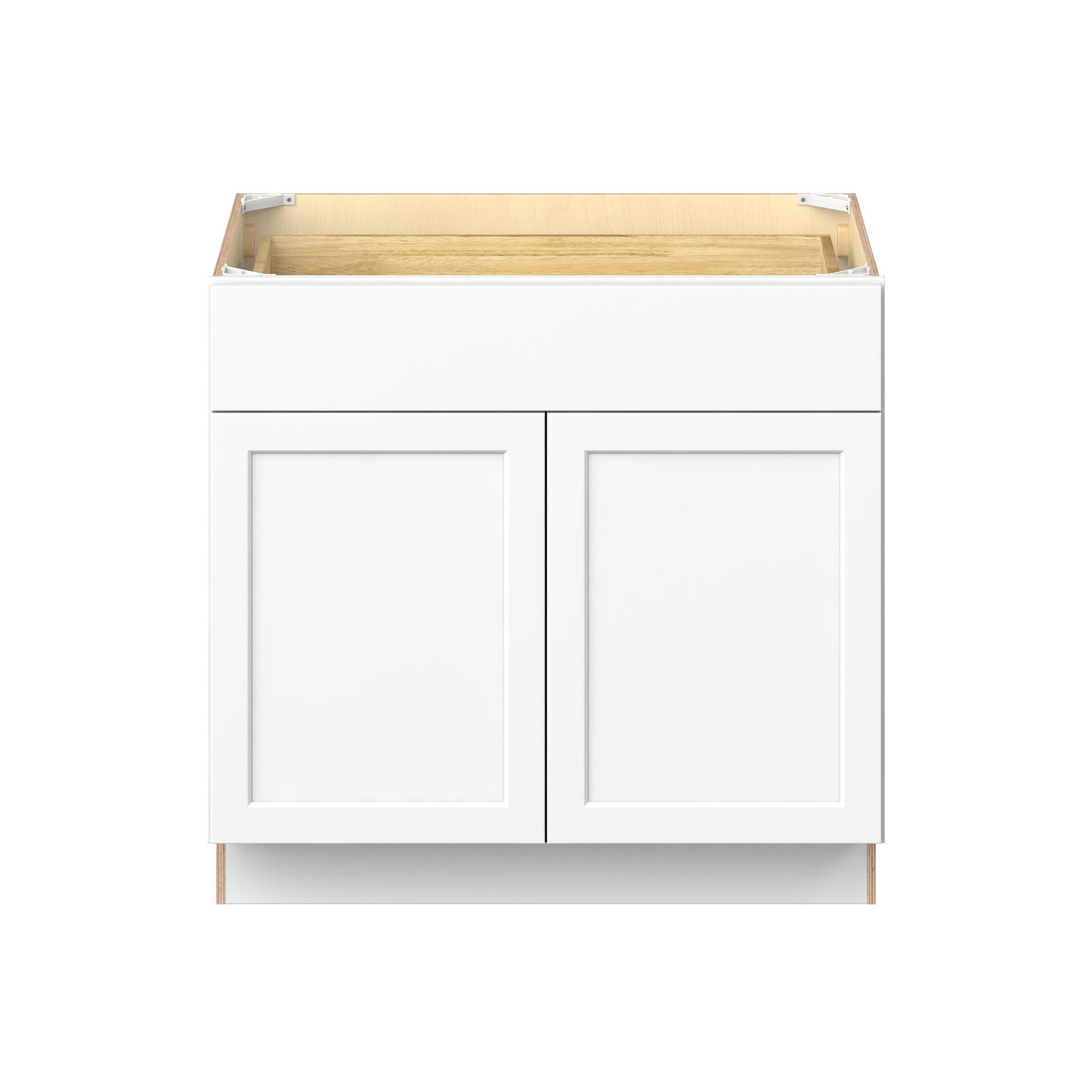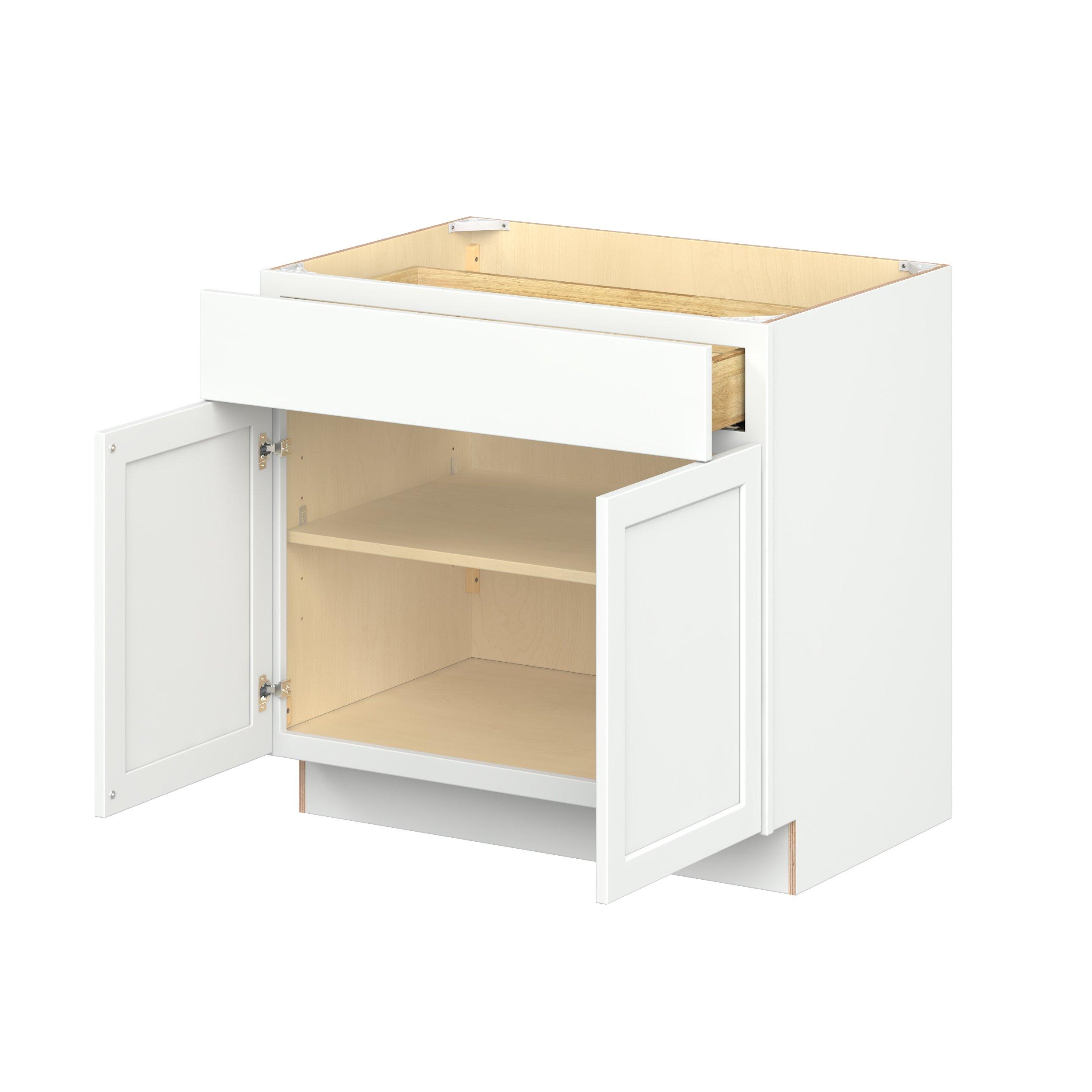 Embrace the timeless charm of the Baxley classic shaker door style. Studio Design Collection Baxley 36 in. Painted Pure White Door and Drawer Base Cabinet features all plywood construction, offering both superior strength and sophistication to your space. Featuring 5-piece MDF doors and dovetail drawer joints, these cabinets offer durability and elegance. Baxley classic shaker door style is designed to retain its stunning appearance and withstand the test of time.