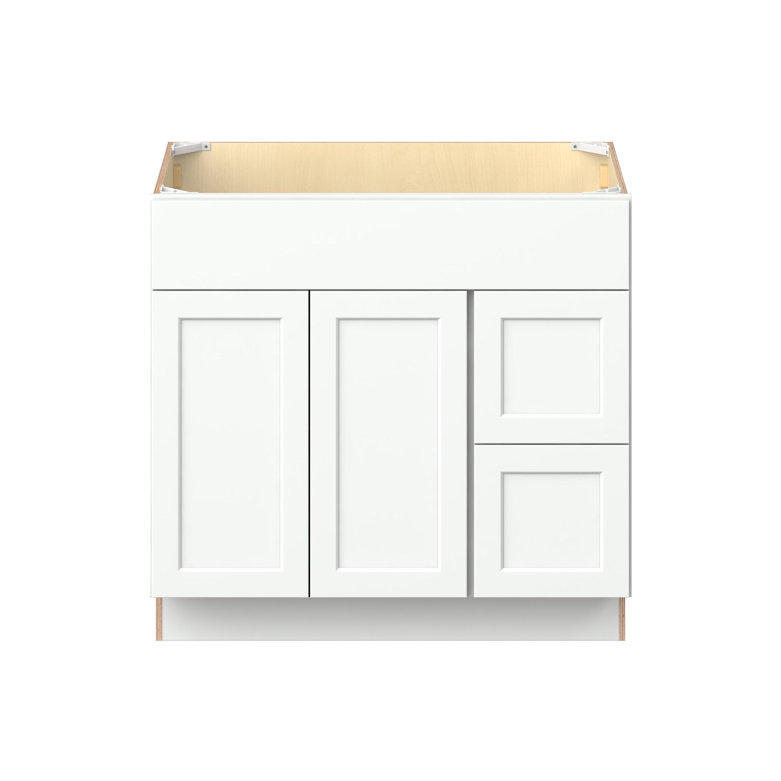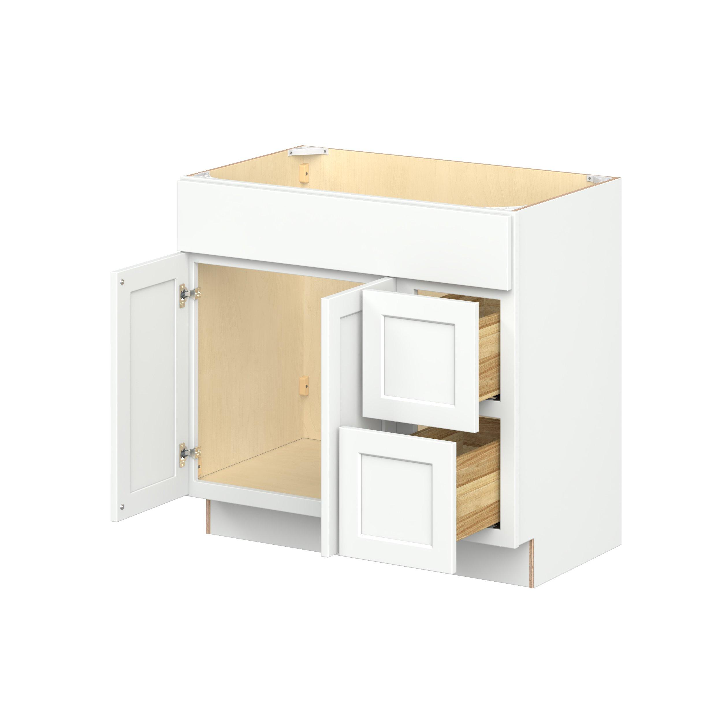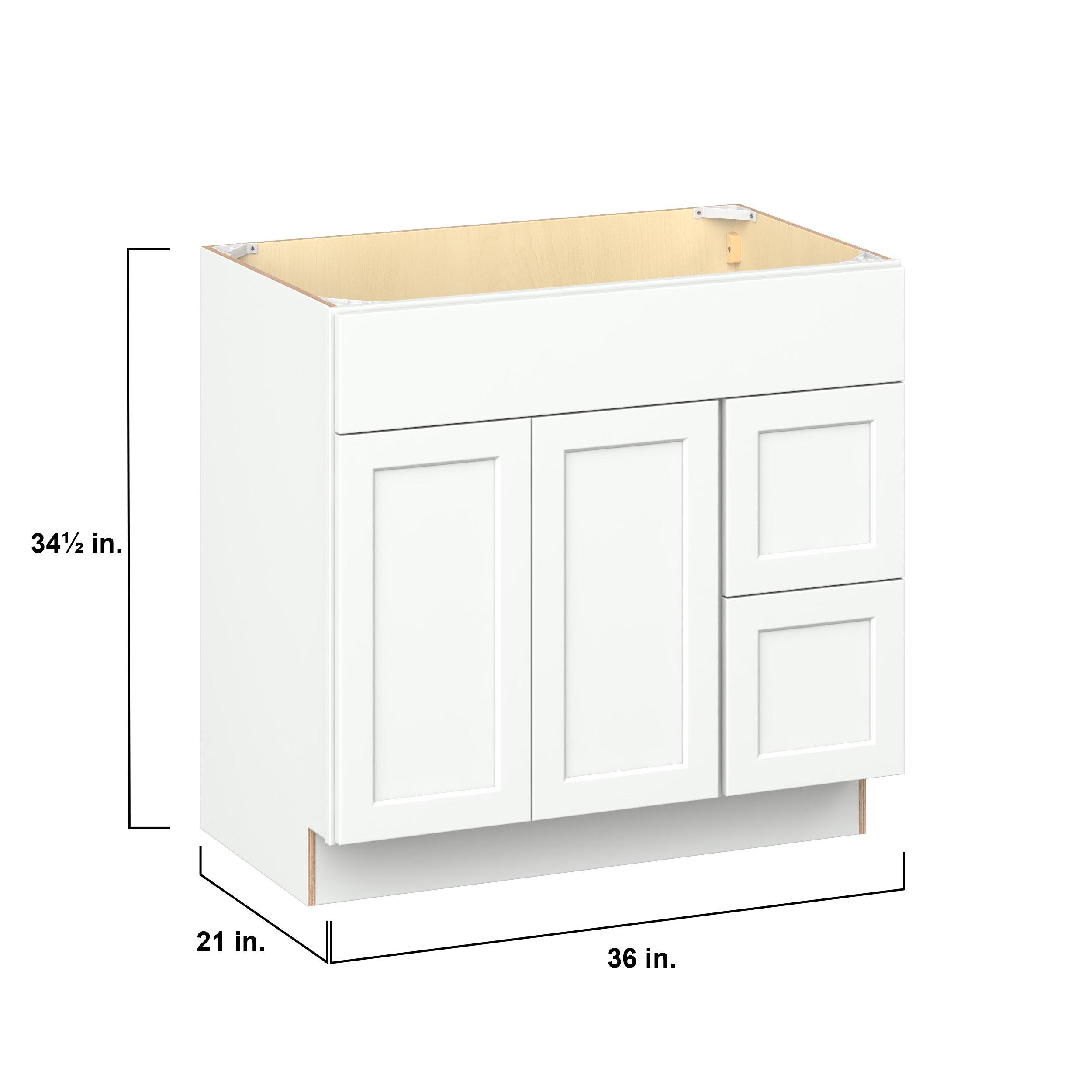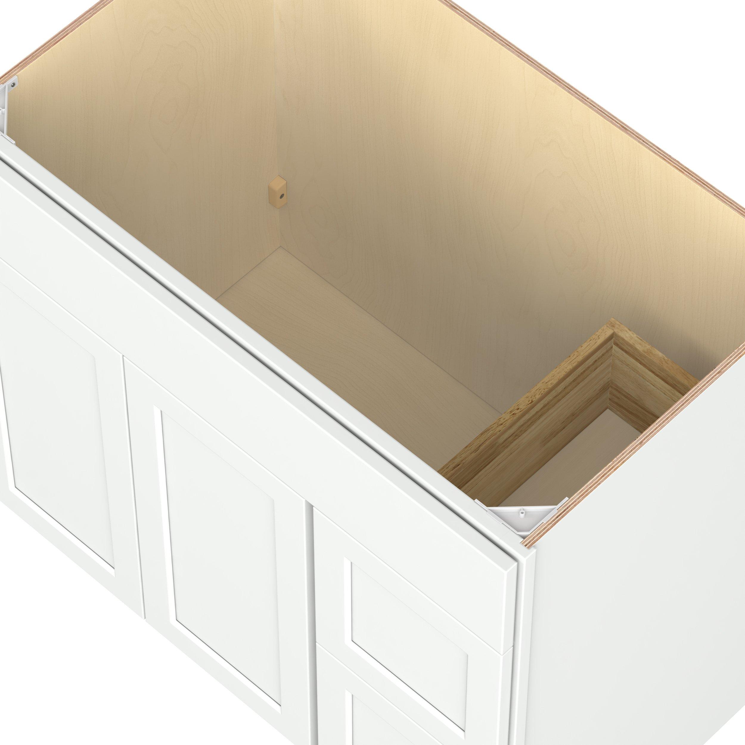 Embrace the timeless charm of the Baxley classic shaker door style. Studio Design Collection Baxley 36 in. Painted Pure White Vanity Sink Door and Drawer Base Cabinet features all plywood construction, offering both superior strength and sophistication to your space. Featuring 5-piece MDF doors and dovetail drawer joints, these cabinets offer durability and elegance. Baxley classic shaker door style is designed to retain its stunning appearance and withstand the test of time.