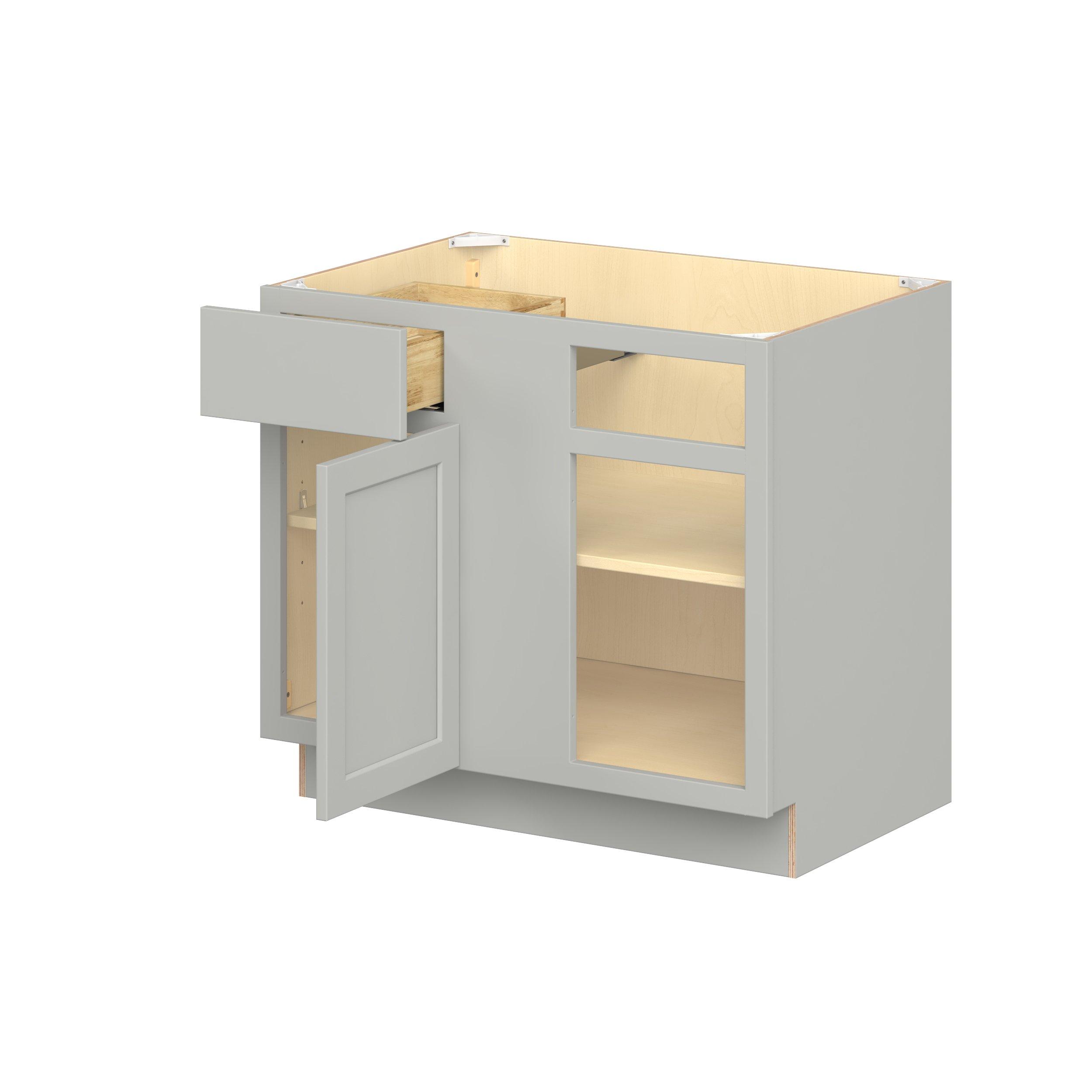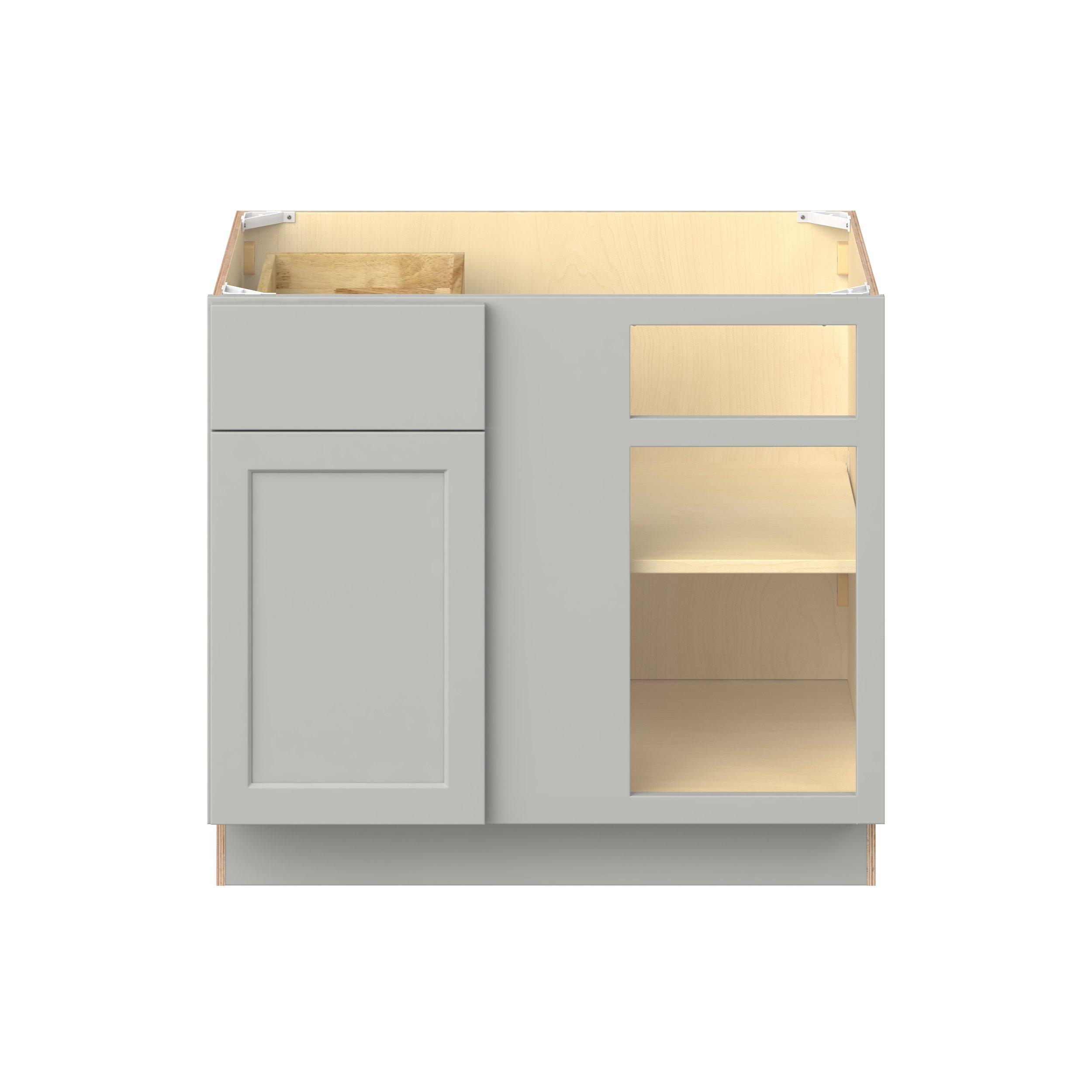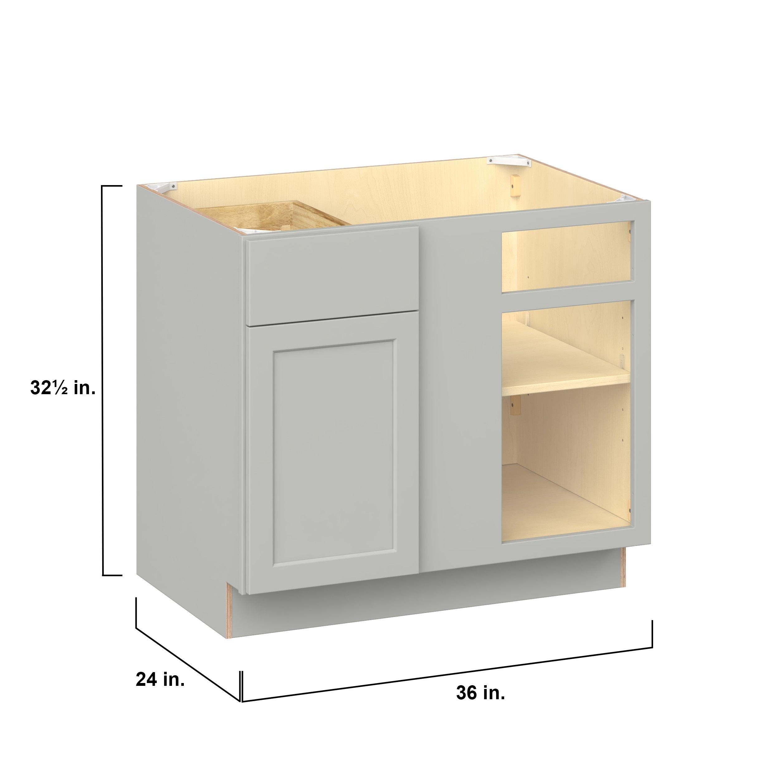 Embrace the timeless charm of the Baxley classic shaker door style. Studio Design Collection Baxley 36 in. Painted Whisper Gray Blind Corner Base Cabinet - ADA features all plywood construction, offering both superior strength and sophistication to your space. Featuring 5-piece MDF doors and dovetail drawer joints, these cabinets offer durability and elegance. Baxley classic shaker door style is designed to retain its stunning appearance and withstand the test of time.