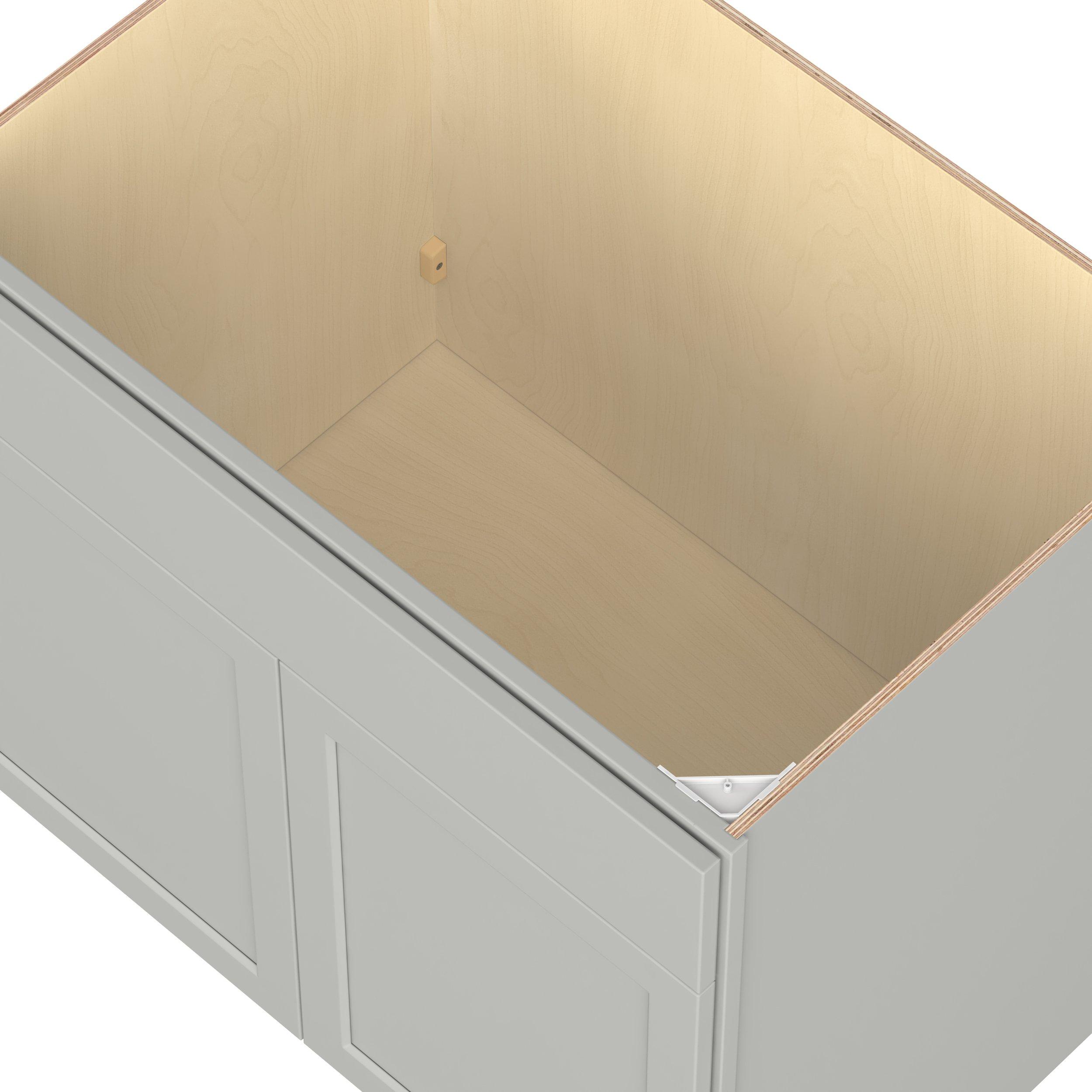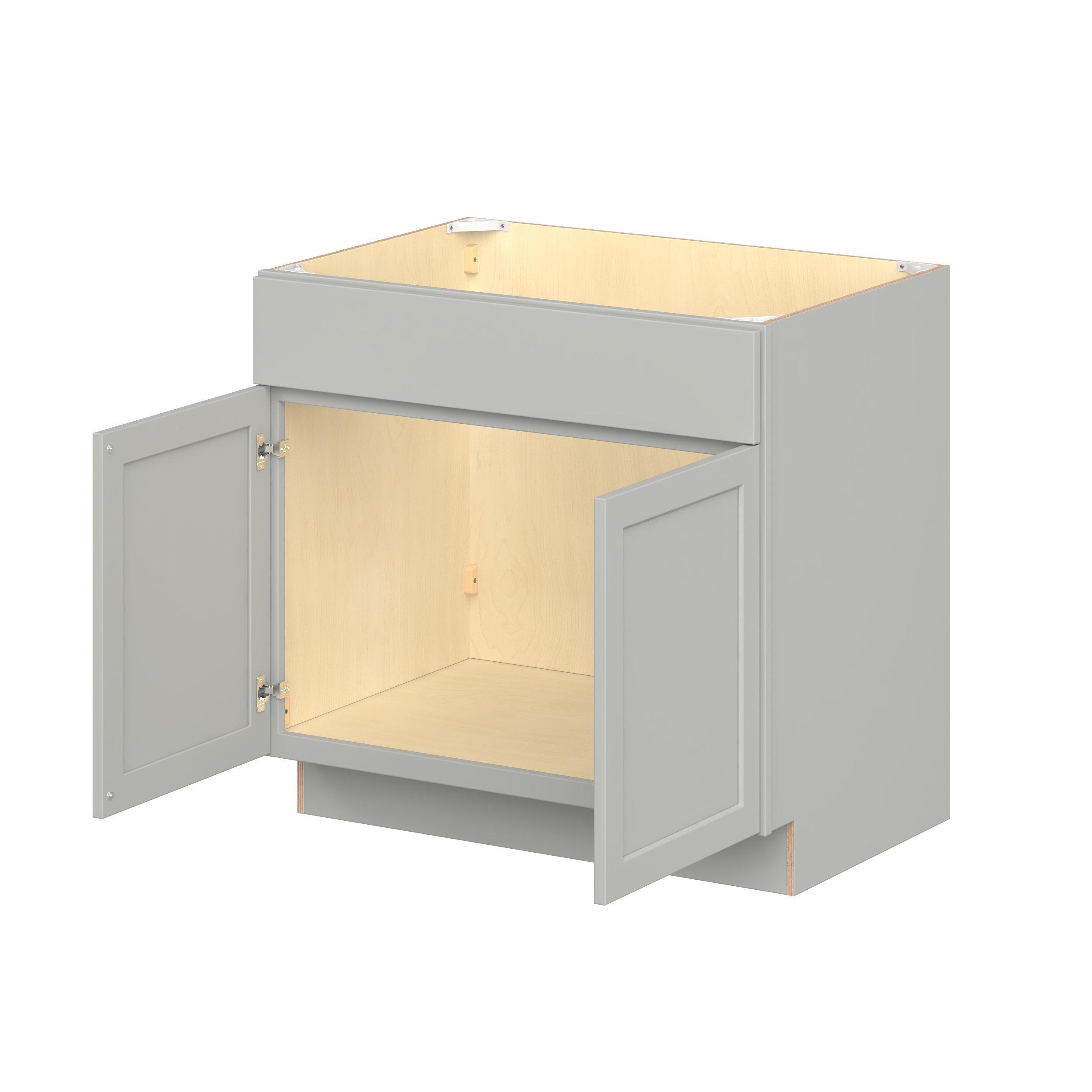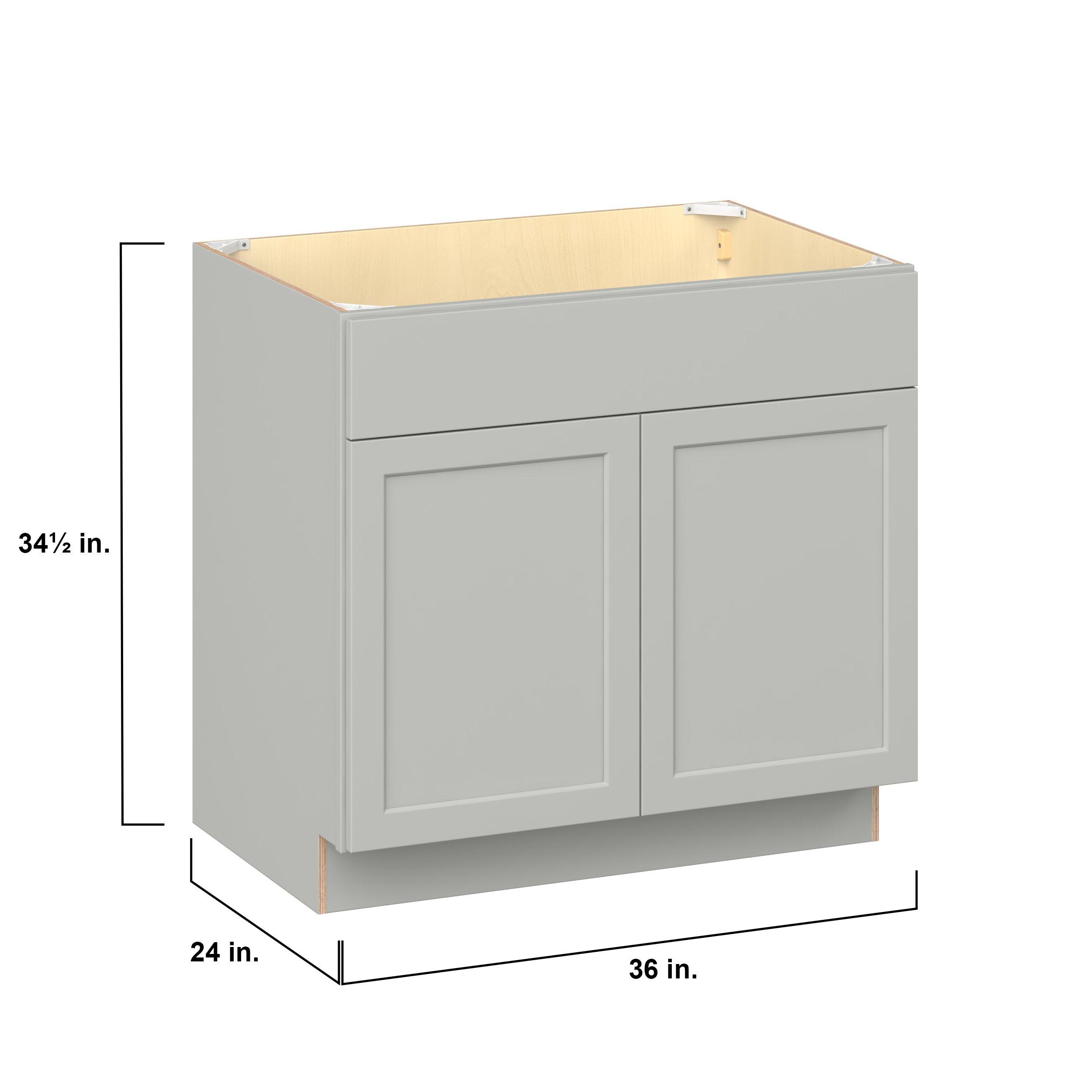 Embrace the timeless charm of the Baxley classic shaker door style. Studio Design Collection Baxley 36 in. Painted Whisper Gray Sink Base Cabinet with False Front features all plywood construction, offering both superior strength and sophistication to your space. Featuring 5-piece MDF doors and dovetail drawer joints, these cabinets offer durability and elegance. Baxley classic shaker door style is designed to retain its stunning appearance and withstand the test of time.