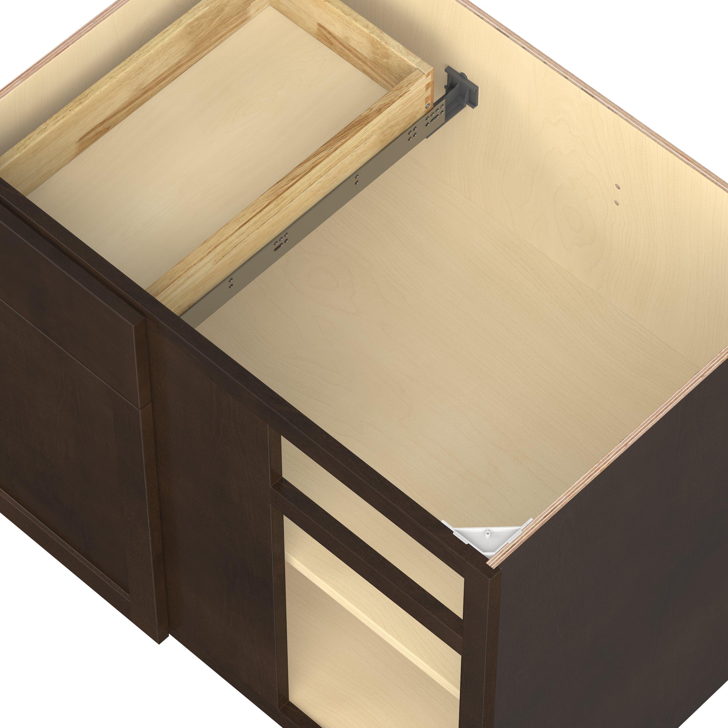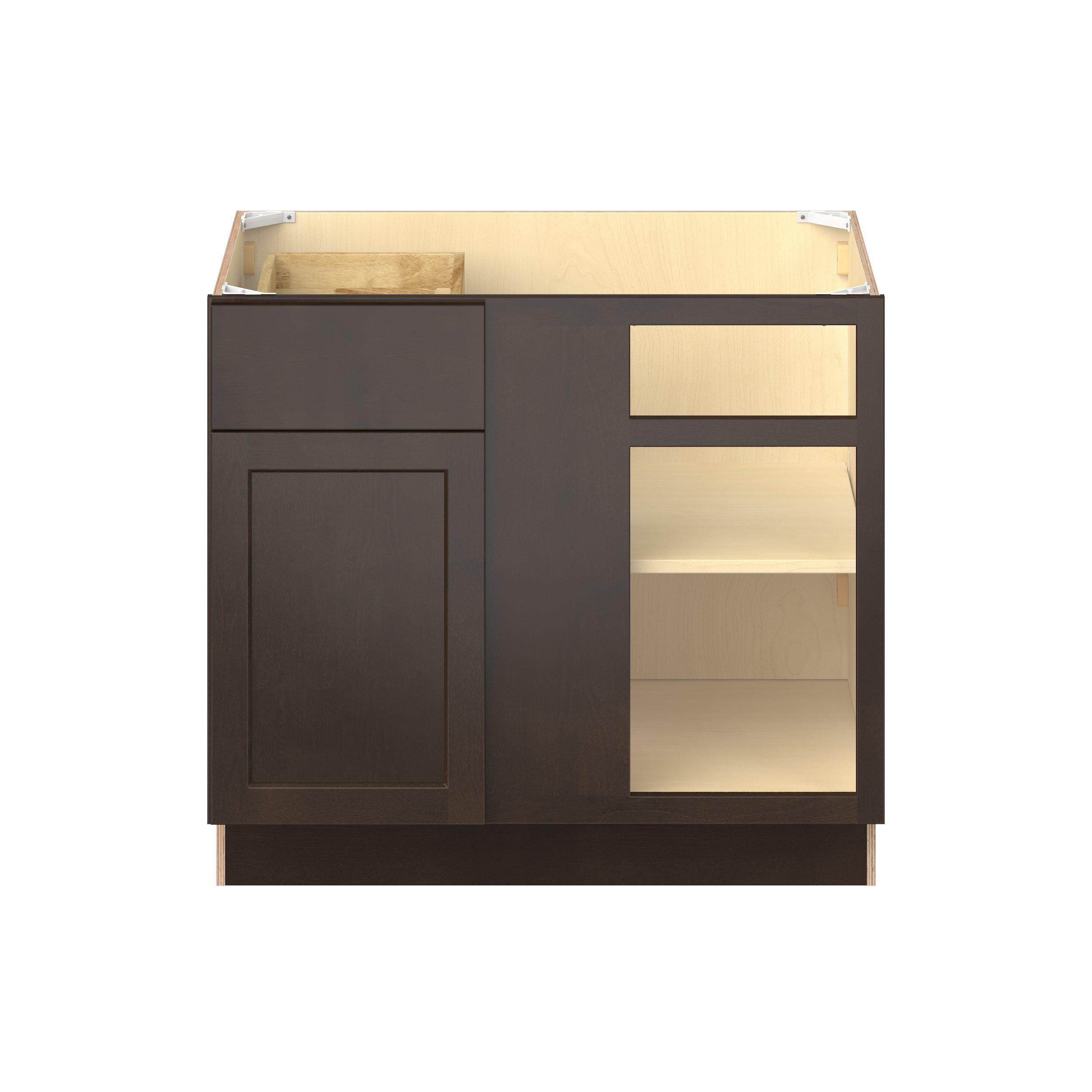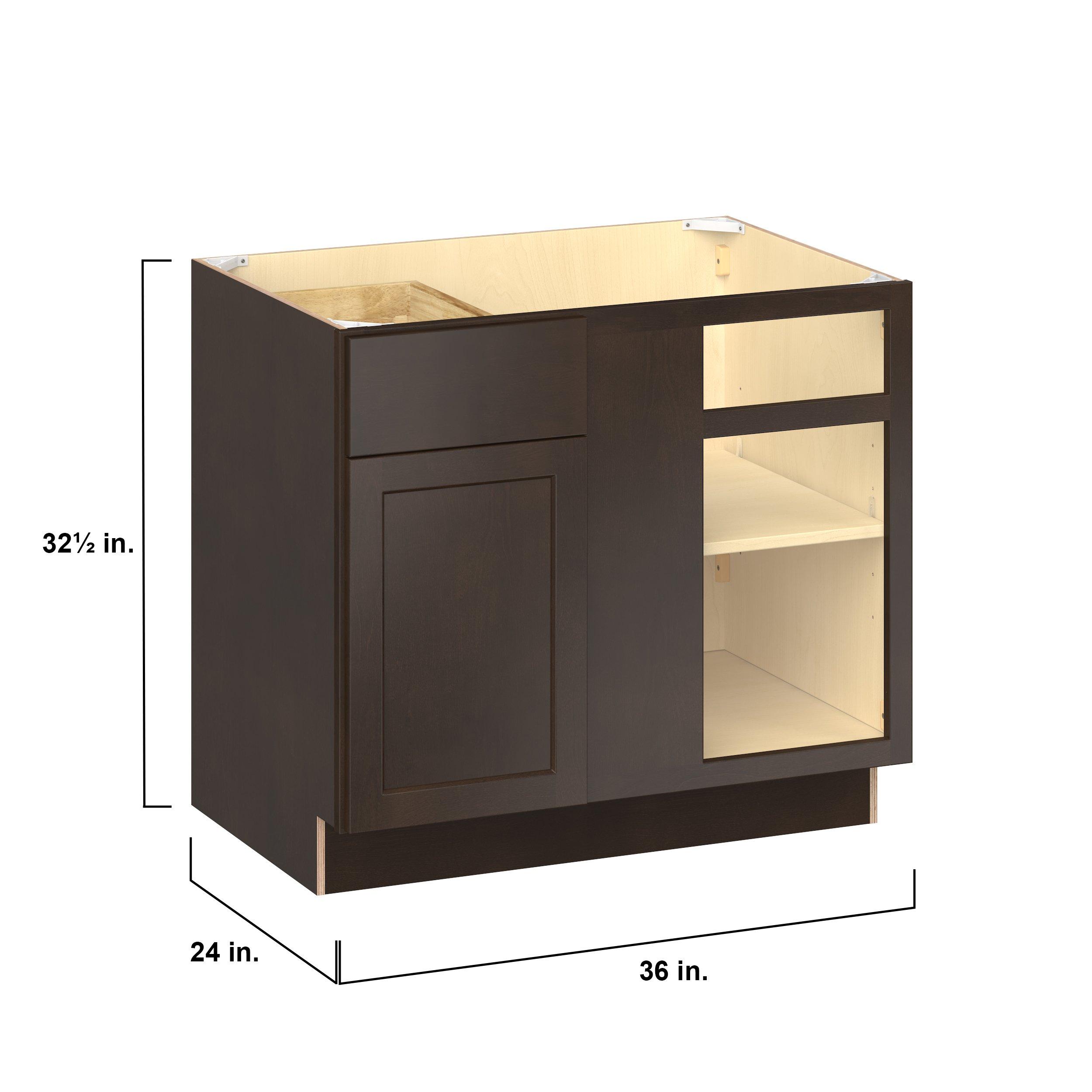 Embrace the timeless charm of the Baxley classic shaker door style. Studio Design Collection Baxley 36 in. Stained Cocoa Blind Corner Base Cabinet - ADA features all plywood construction, offering both superior strength and sophistication to your space. Featuring 5-piece solid wood doors and dovetail drawer joints, these cabinets offer durability and elegance. Baxley classic shaker door style is designed to retain its stunning appearance and withstand the test of time.