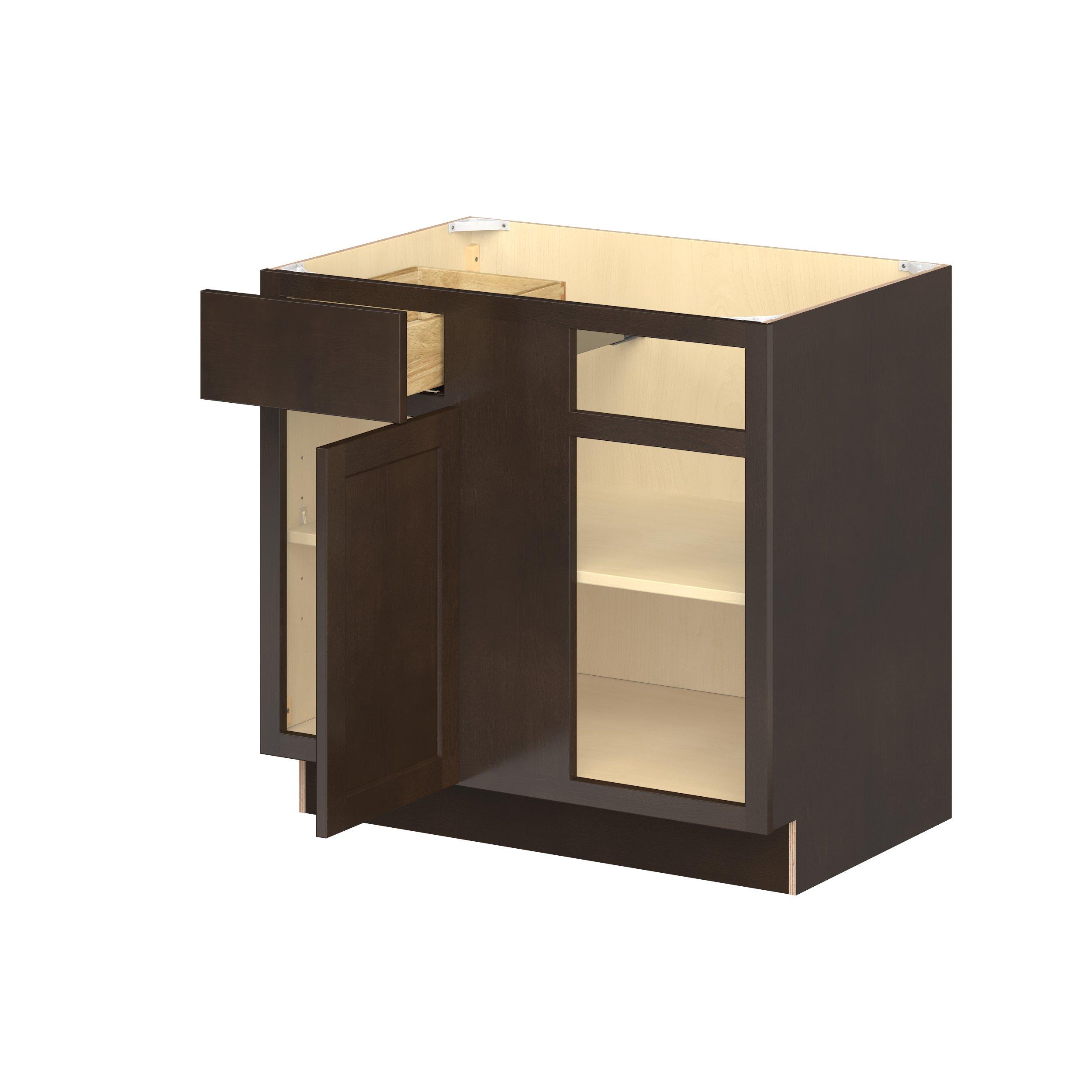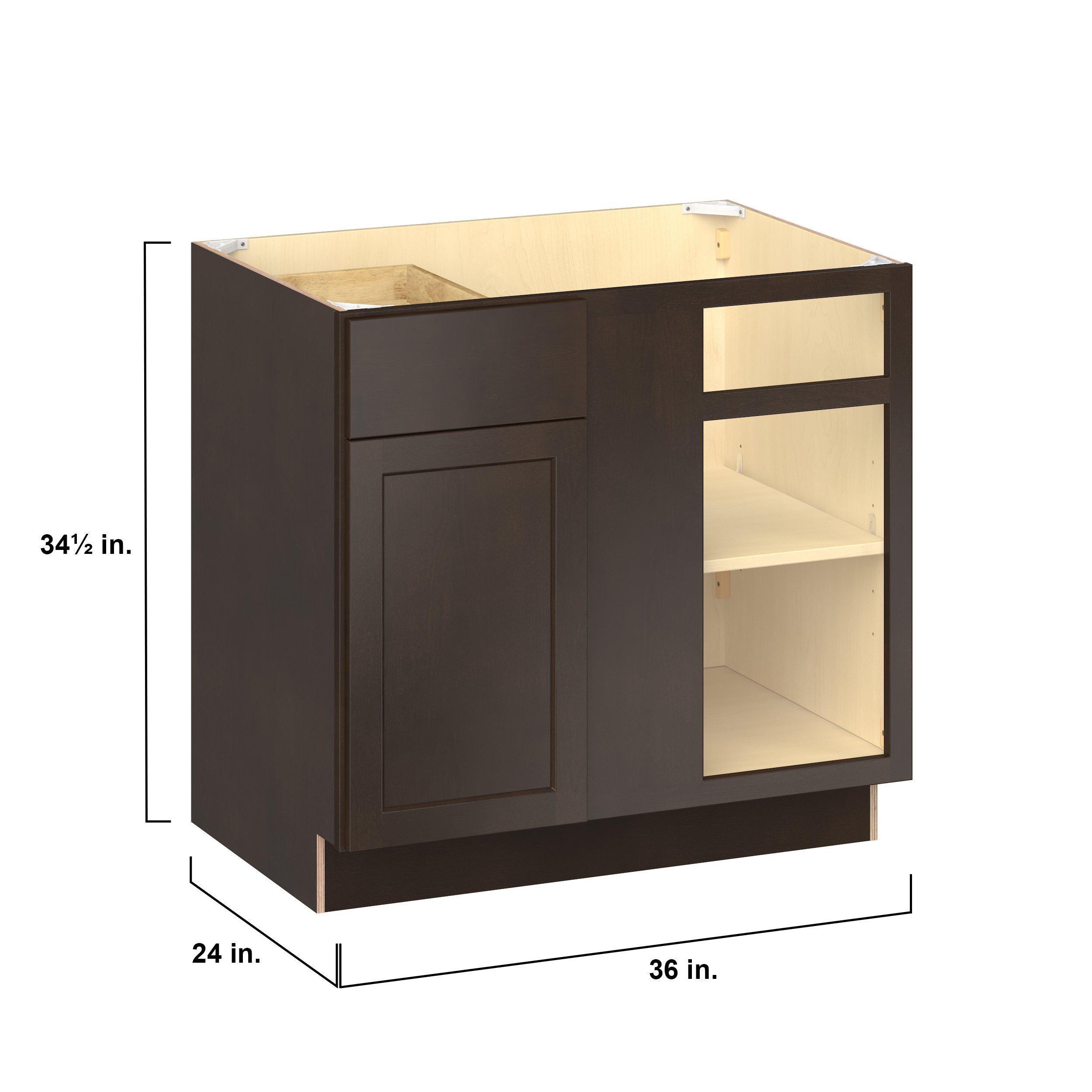 Embrace the timeless charm of the Baxley classic shaker door style. Studio Design Collection Baxley 36 in. Stained Cocoa Blind Corner Base Cabinet features all plywood construction, offering both superior strength and sophistication to your space. Featuring 5-piece solid wood doors and dovetail drawer joints, these cabinets offer durability and elegance. Baxley classic shaker door style is designed to retain its stunning appearance and withstand the test of time.
