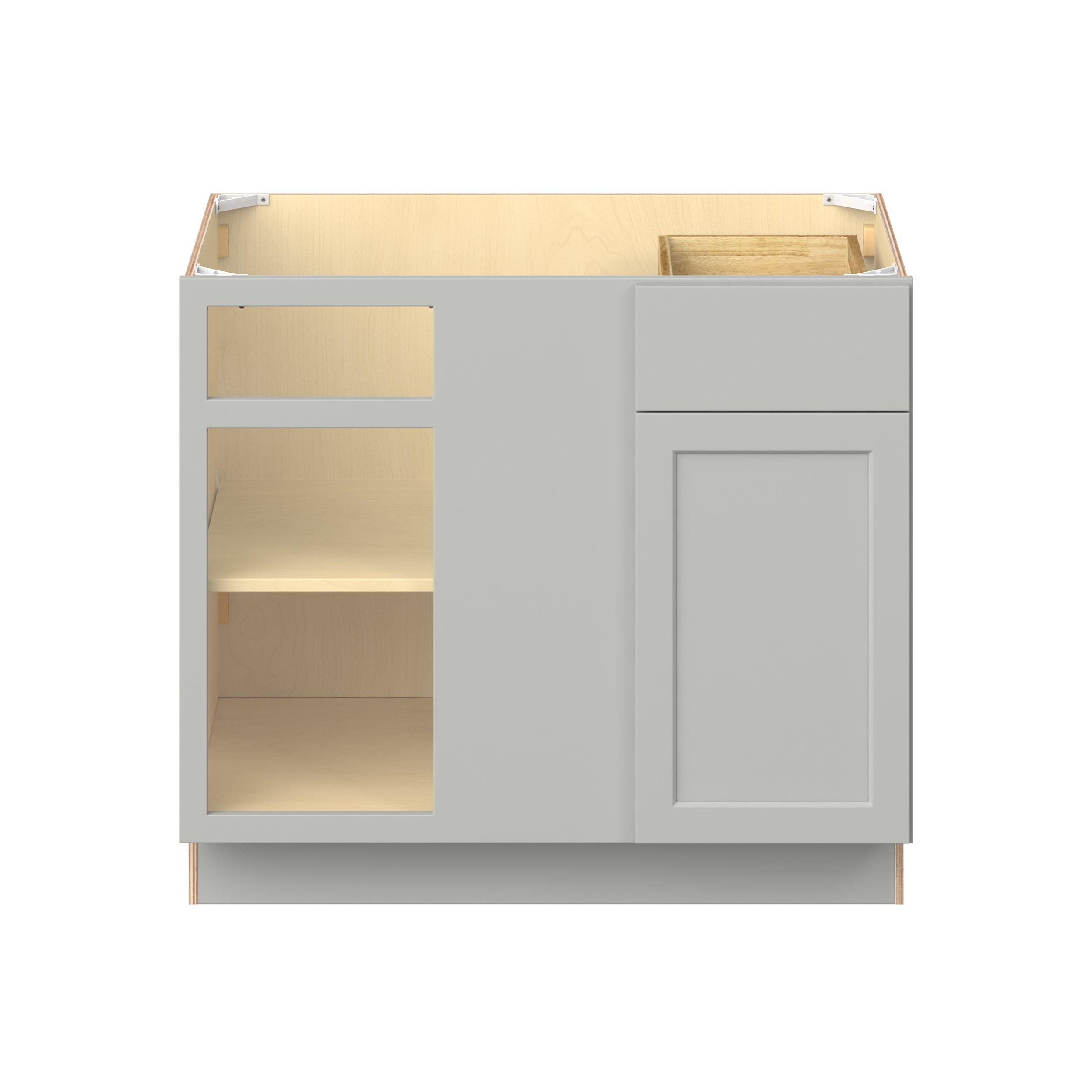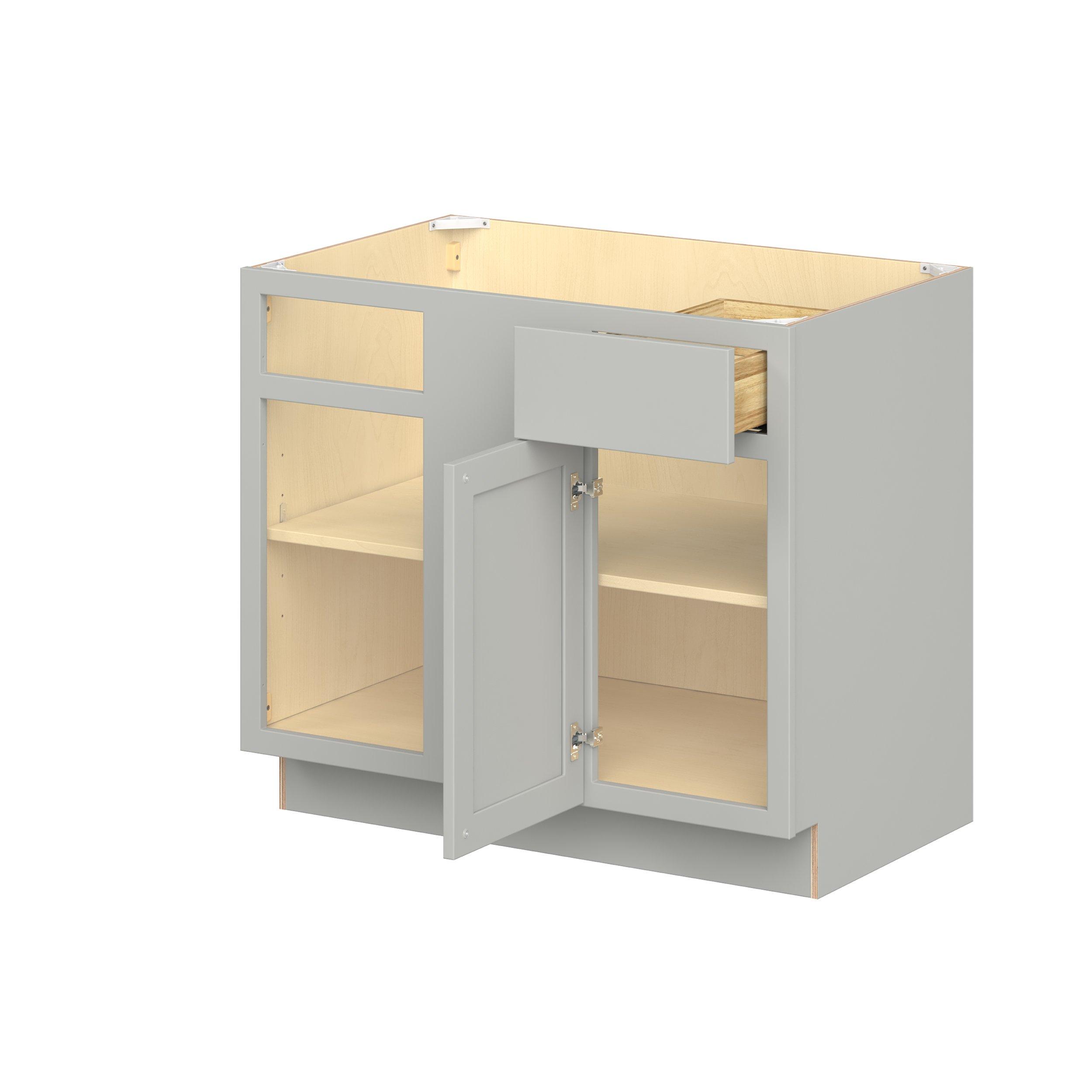 Embrace the timeless charm of the Baxley classic shaker door style. Studio Design Collection Baxley 39 in. Painted Whisper Gray Left Blind Corner Base Cabinet features all plywood construction, offering both superior strength and sophistication to your space. Featuring 5-piece MDF doors and dovetail drawer joints, these cabinets offer durability and elegance. Baxley classic shaker door style is designed to retain its stunning appearance and withstand the test of time.