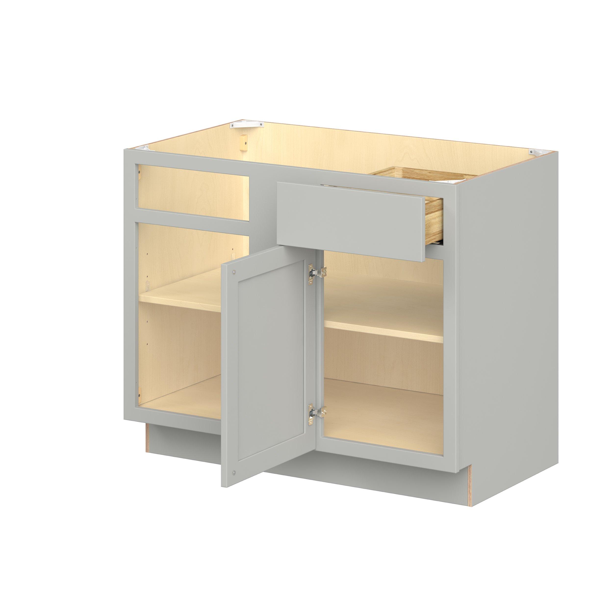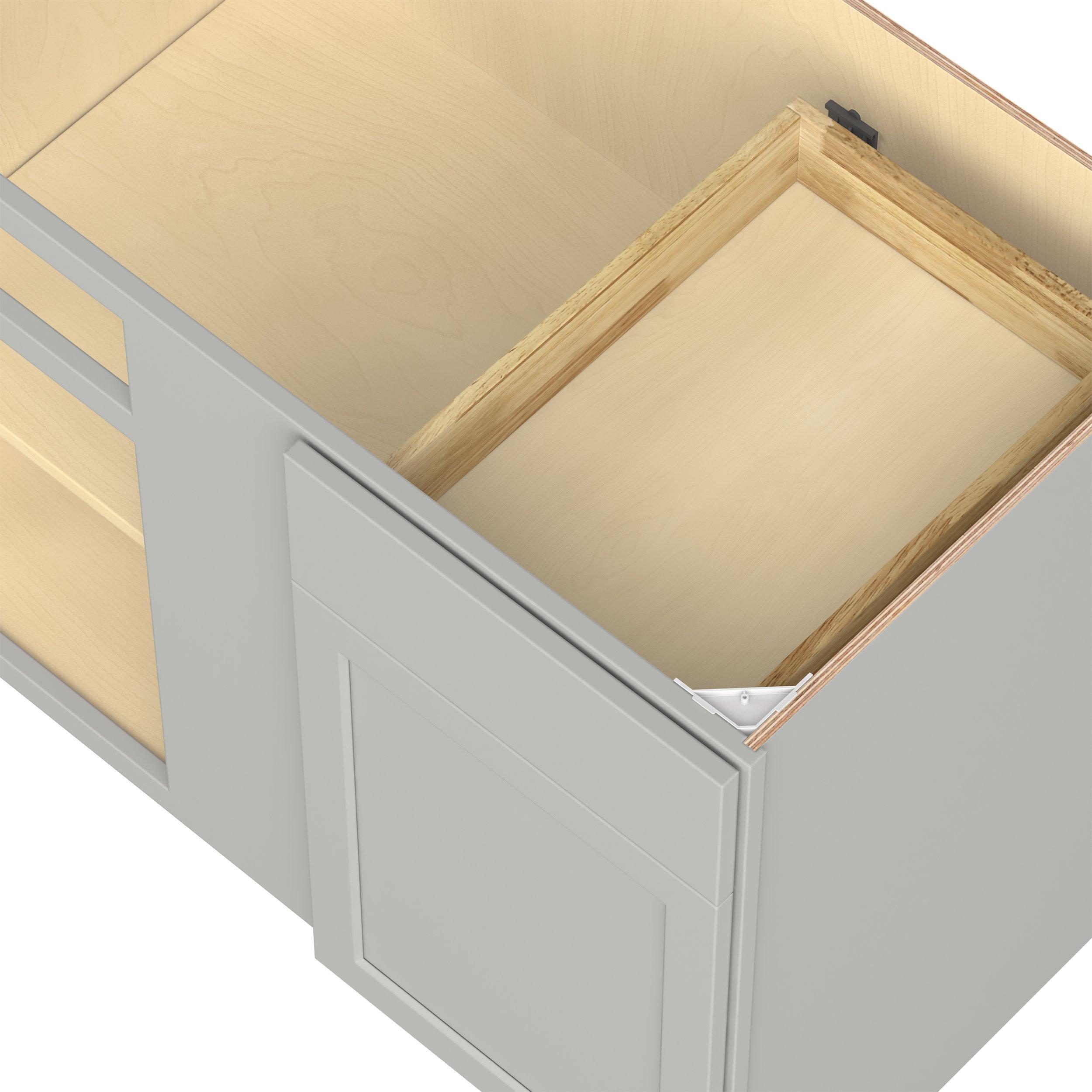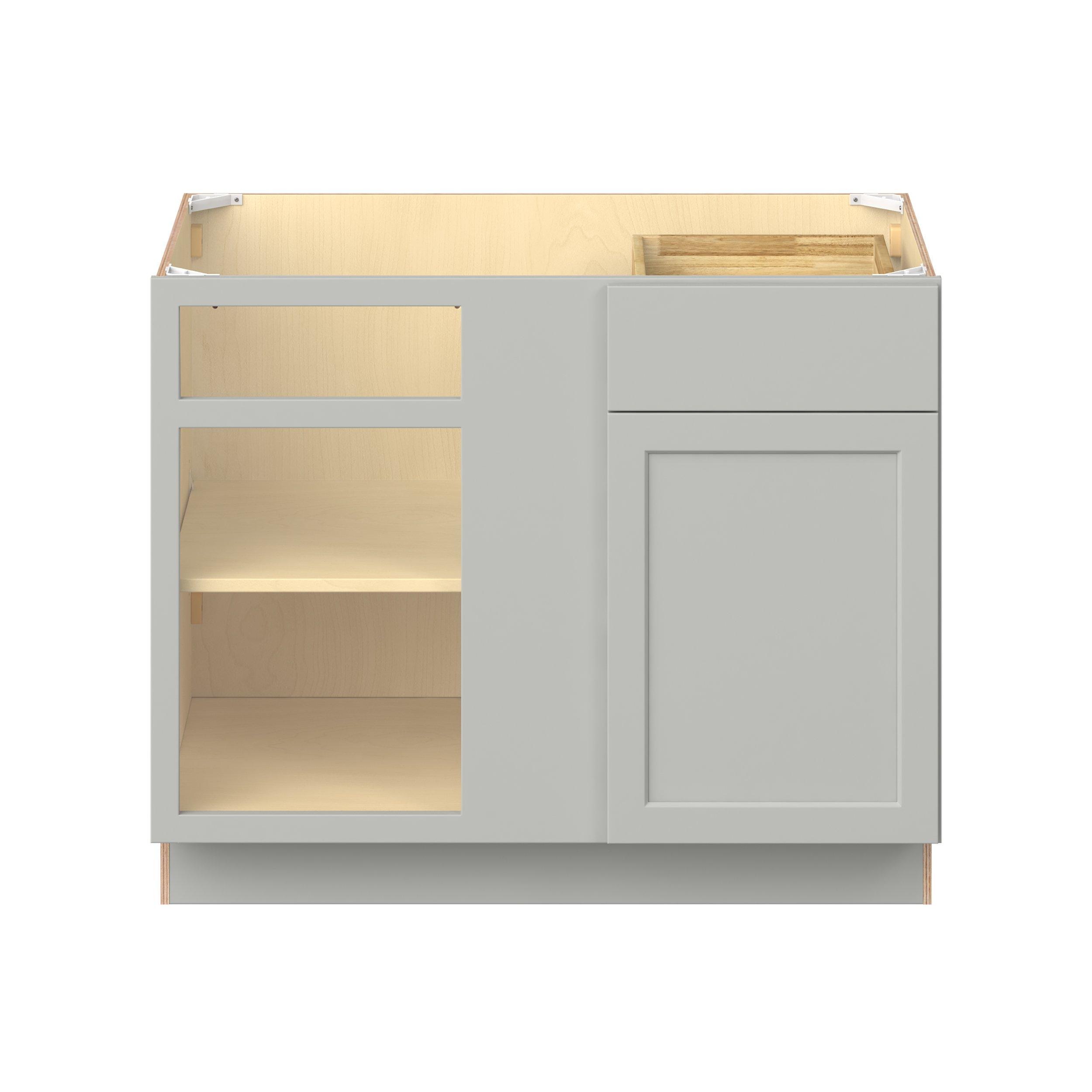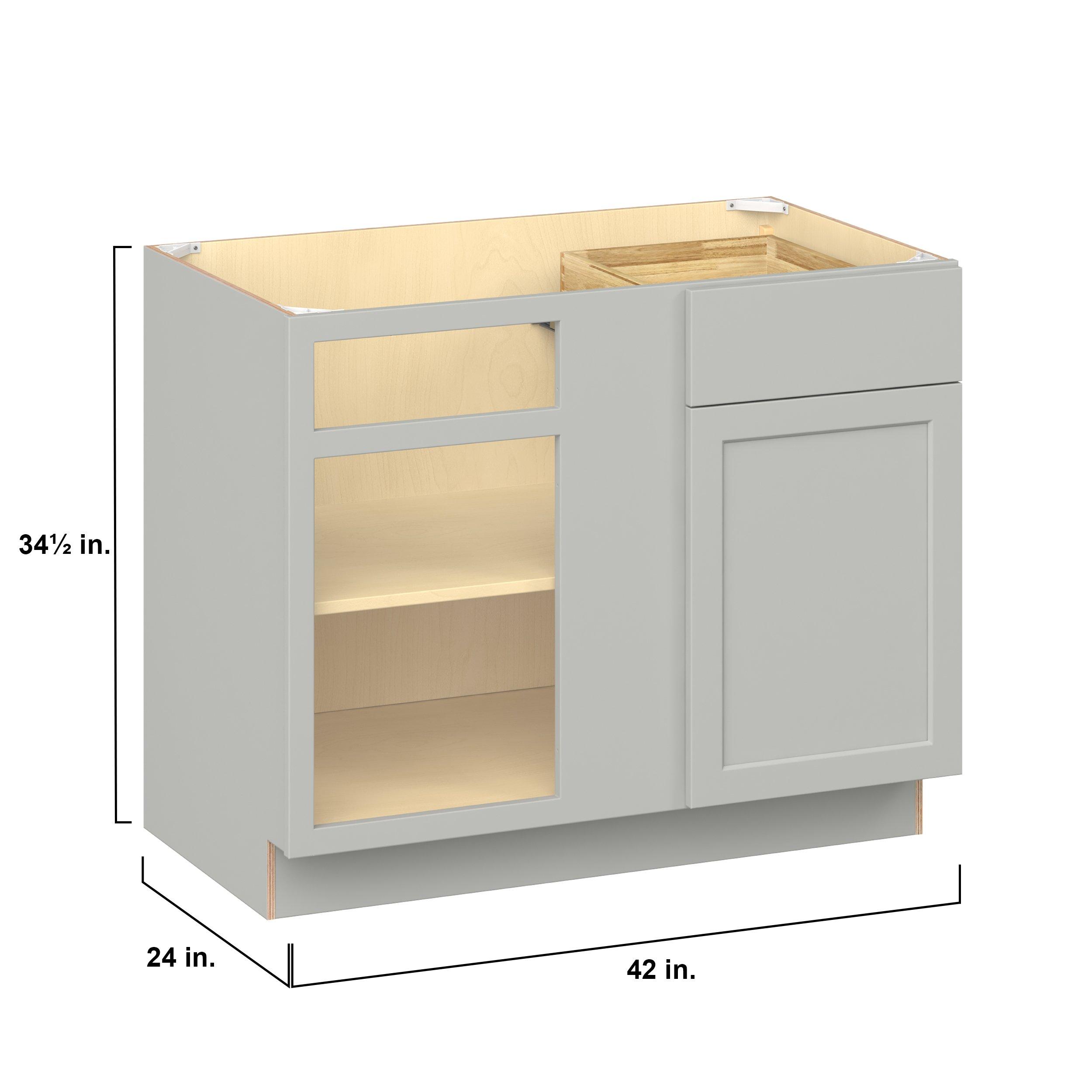 Embrace the timeless charm of the Baxley classic shaker door style. Studio Design Collection Baxley 42 in. Painted Whisper Gray Left Blind Corner Base Cabinet features all plywood construction, offering both superior strength and sophistication to your space. Featuring 5-piece MDF doors and dovetail drawer joints, these cabinets offer durability and elegance. Baxley classic shaker door style is designed to retain its stunning appearance and withstand the test of time.