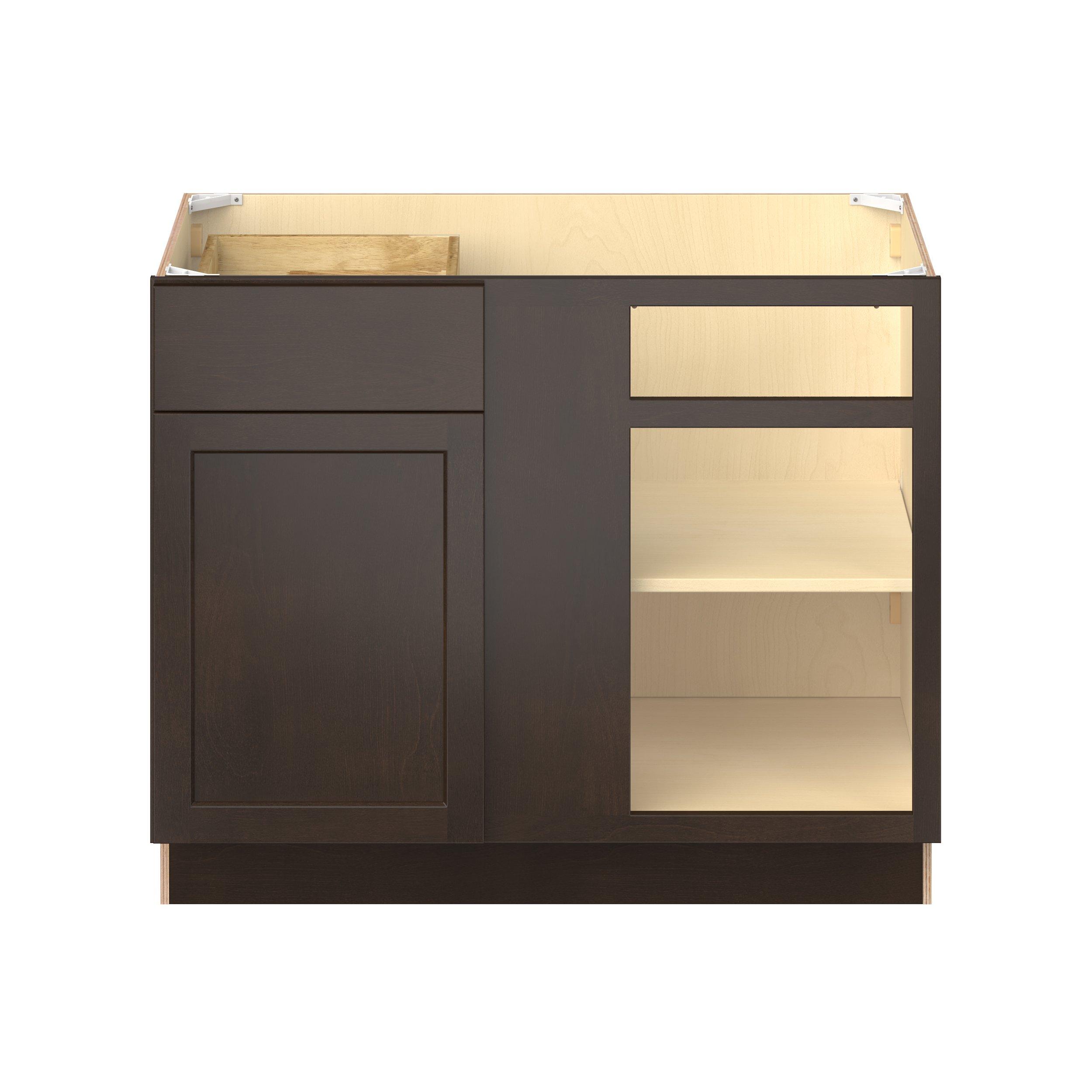 Embrace the timeless charm of the Baxley classic shaker door style. Studio Design Collection Baxley 42 in. Stained Cocoa Blind Corner Base Cabinet features all plywood construction, offering both superior strength and sophistication to your space. Featuring 5-piece solid wood doors and dovetail drawer joints, these cabinets offer durability and elegance. Baxley classic shaker door style is designed to retain its stunning appearance and withstand the test of time.