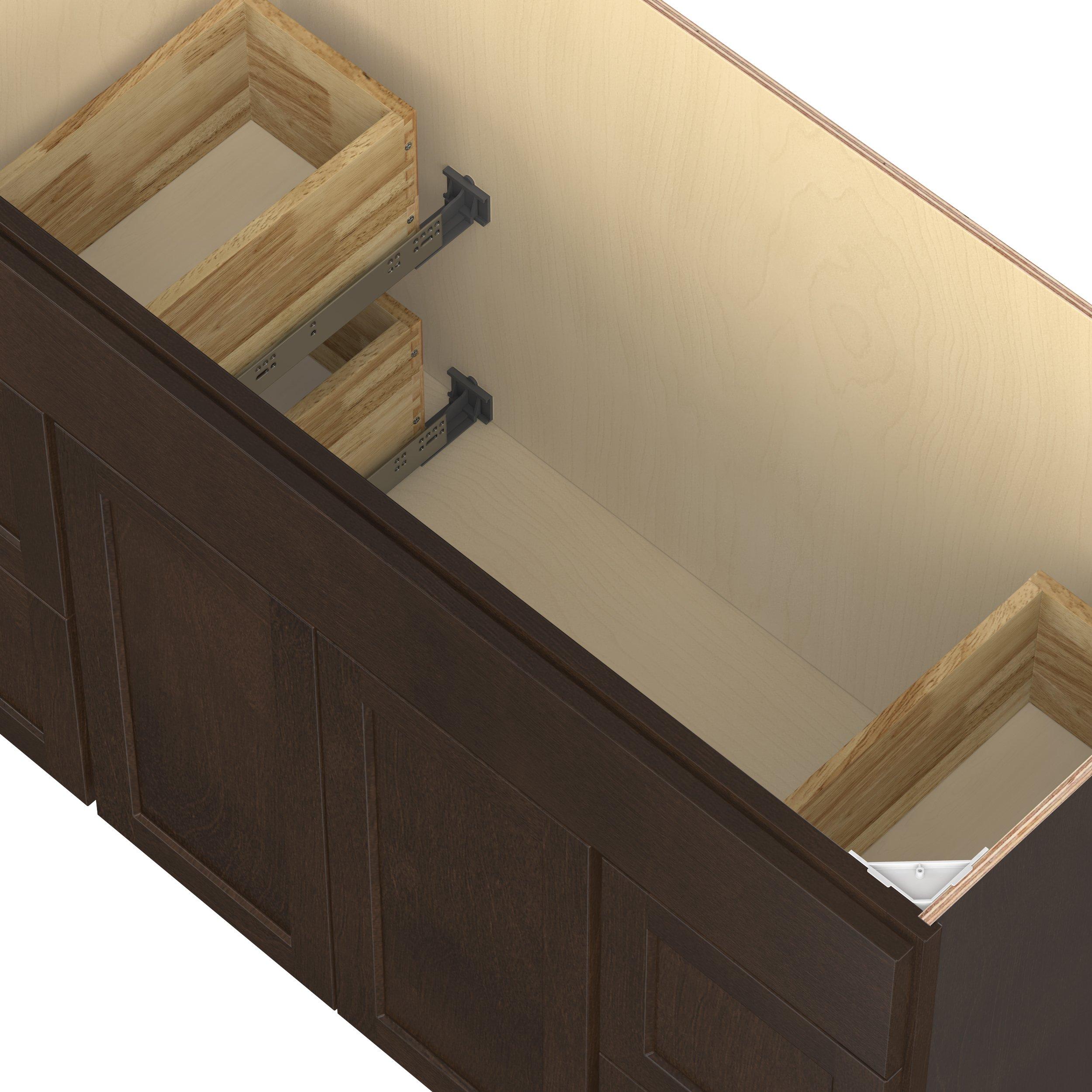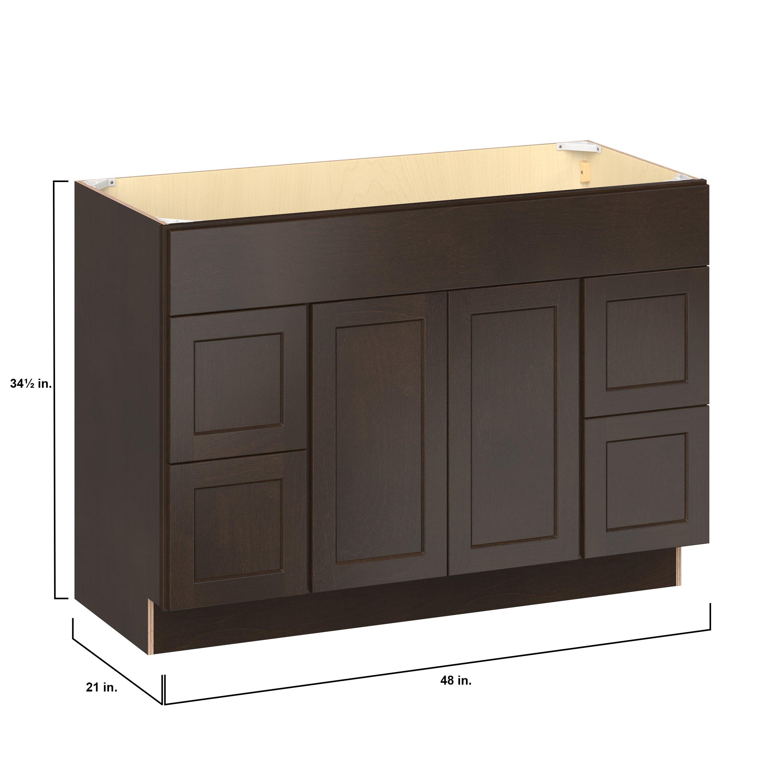 Embrace the timeless charm of the Baxley classic shaker door style. Studio Design Collection Baxley 48 in. Stained Cocoa Vanity Sink Door and Drawer Base Cabinet features all plywood construction, offering both superior strength and sophistication to your space. Featuring 5-piece solid wood doors and dovetail drawer joints, these cabinets offer durability and elegance. Baxley classic shaker door style is designed to retain its stunning appearance and withstand the test of time.