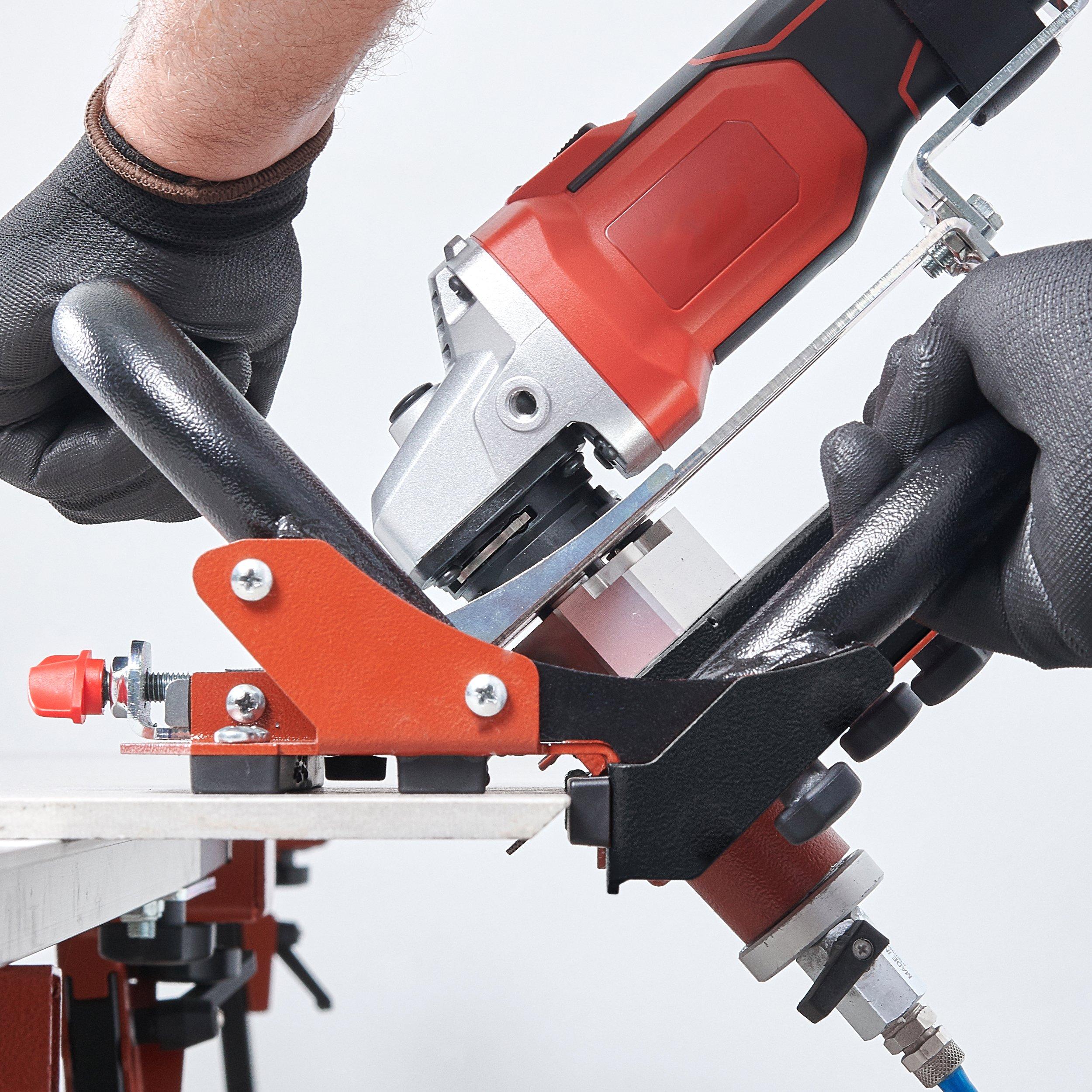 - The two handles are designed to easily allow the necessary pressure during the entire length of the miter cut (entrance, slab side, exit) to guarantee both optimal results and maximum ergonomics.