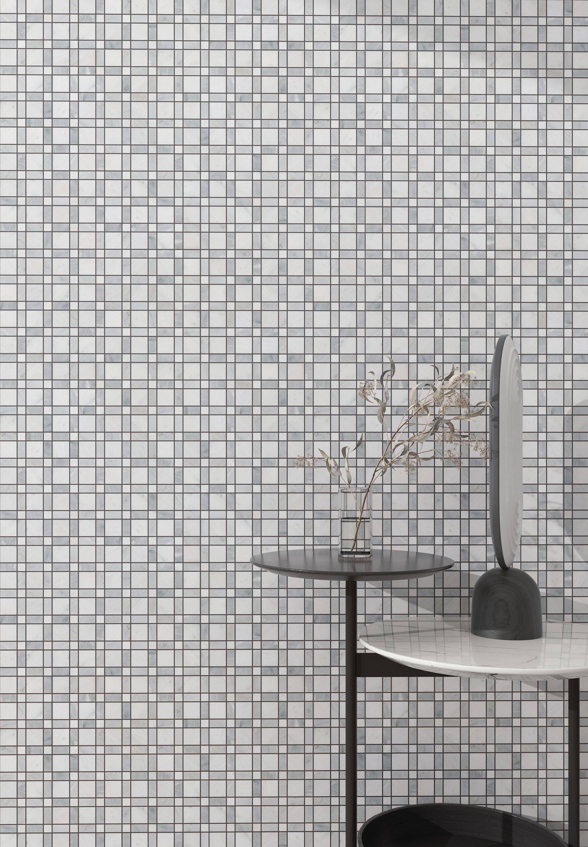 The Manchester Plaid Polished Marble Mosaic in white is as timeless as it is versatile. Its durability and easy maintenance make it a practical and attractive addition to almost any room, and you’ll have an effortlessly elegant aesthetic.