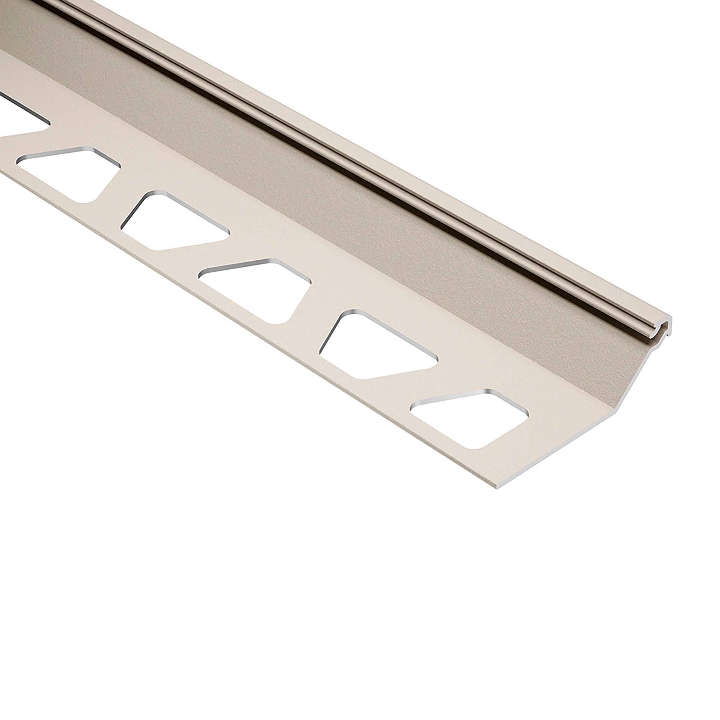Schluter Finec-SQ Trim 1/2in. Aluminum Cream is a finishing and edge-protection profile for the outside corners of tiled surfaces on walls. The vertical wall section of the profile provides a decorative finish and protects adjacent tiles. Other applications include transitions for dado coverings such as carpet, natural stone, or cold-cured resin coatings.