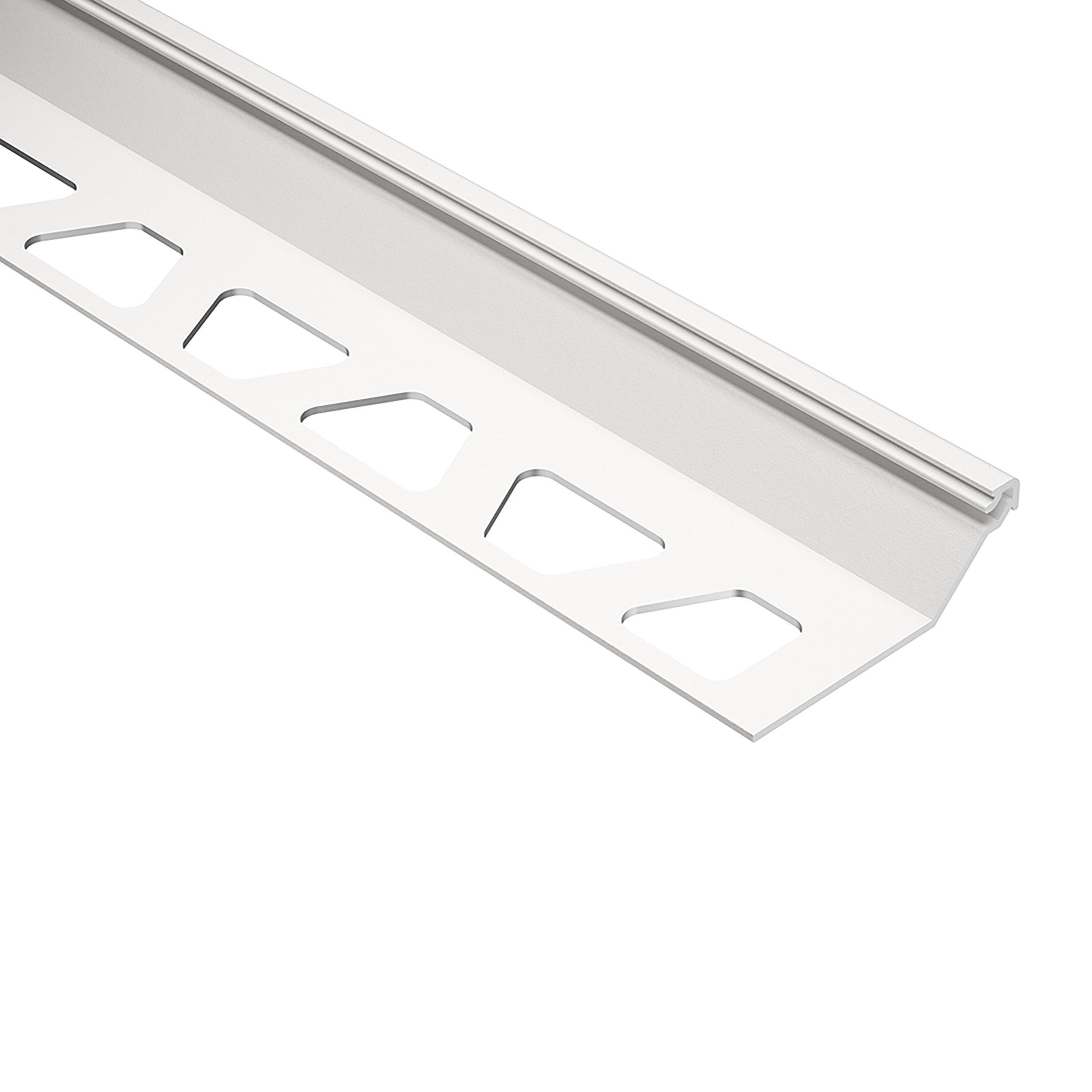 Schluter Finec-SQ Trim 1/2in. Aluminum White is a finishing and edge-protection profile for the outside corners of tiled surfaces on walls. The vertical wall section of the profile provides a decorative finish and protects adjacent tiles. Other applications include transitions for dado coverings such as carpet, natural stone, or cold-cured resin coatings.