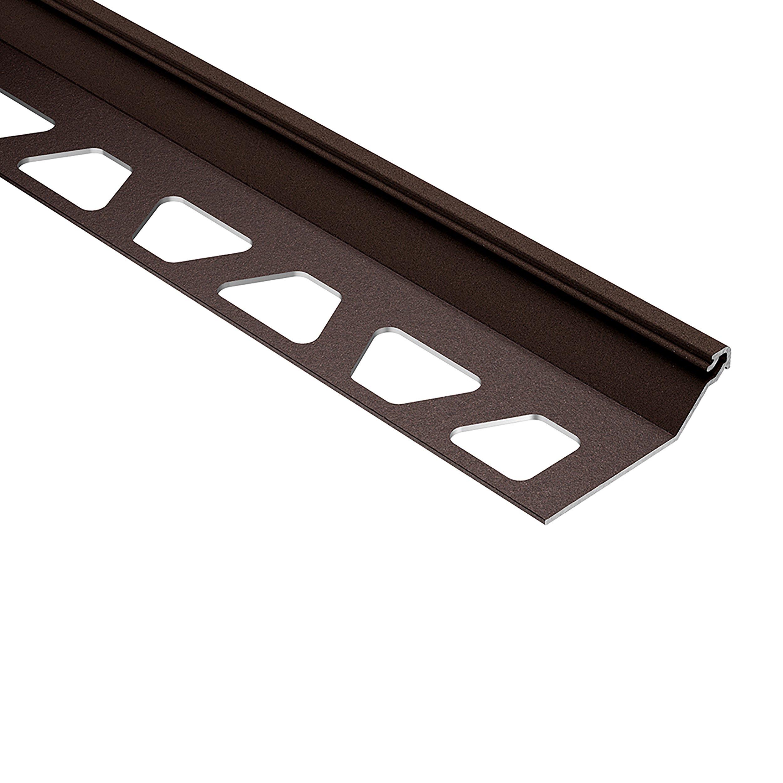 5 Year LimitedSchluter Finec-SQ Trim 7/16in. Aluminum Bronze is a finishing and edge-protection profile for the outside corners of tiled surfaces on walls. The vertical wall section of the profile provides a decorative finish and protects adjacent tiles. Other applications include transitions for dado coverings such as carpet, natural stone, or cold-cured resin coatings.