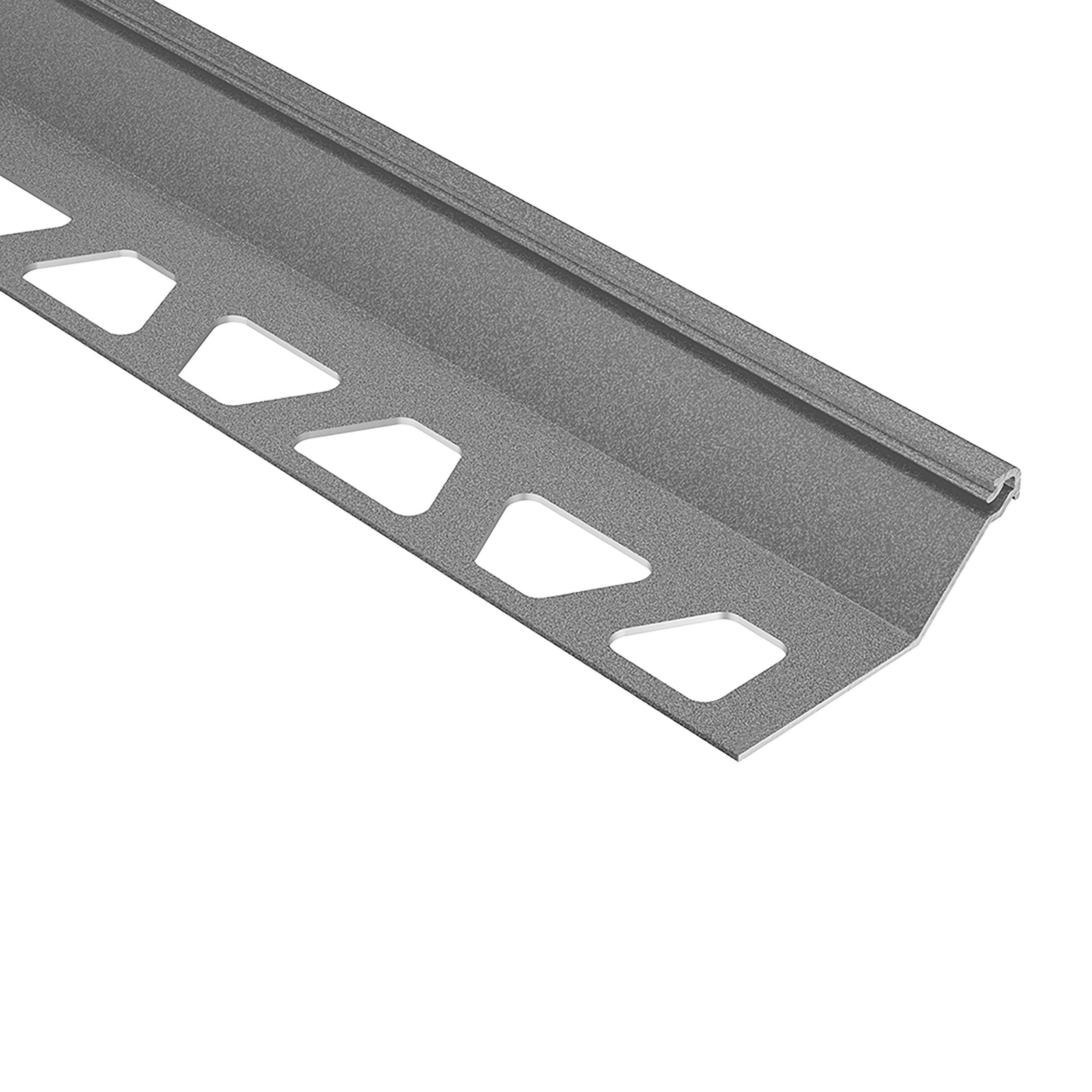 5 Year LimitedSchluter Finec-SQ Trim 9/16in. Aluminum Pewter is a finishing and edge-protection profile for the outside corners of tiled surfaces on walls. The vertical wall section of the profile provides a decorative finish and protects adjacent tiles. Other applications include transitions for dado coverings such as carpet, natural stone, or cold-cured resin coatings.
