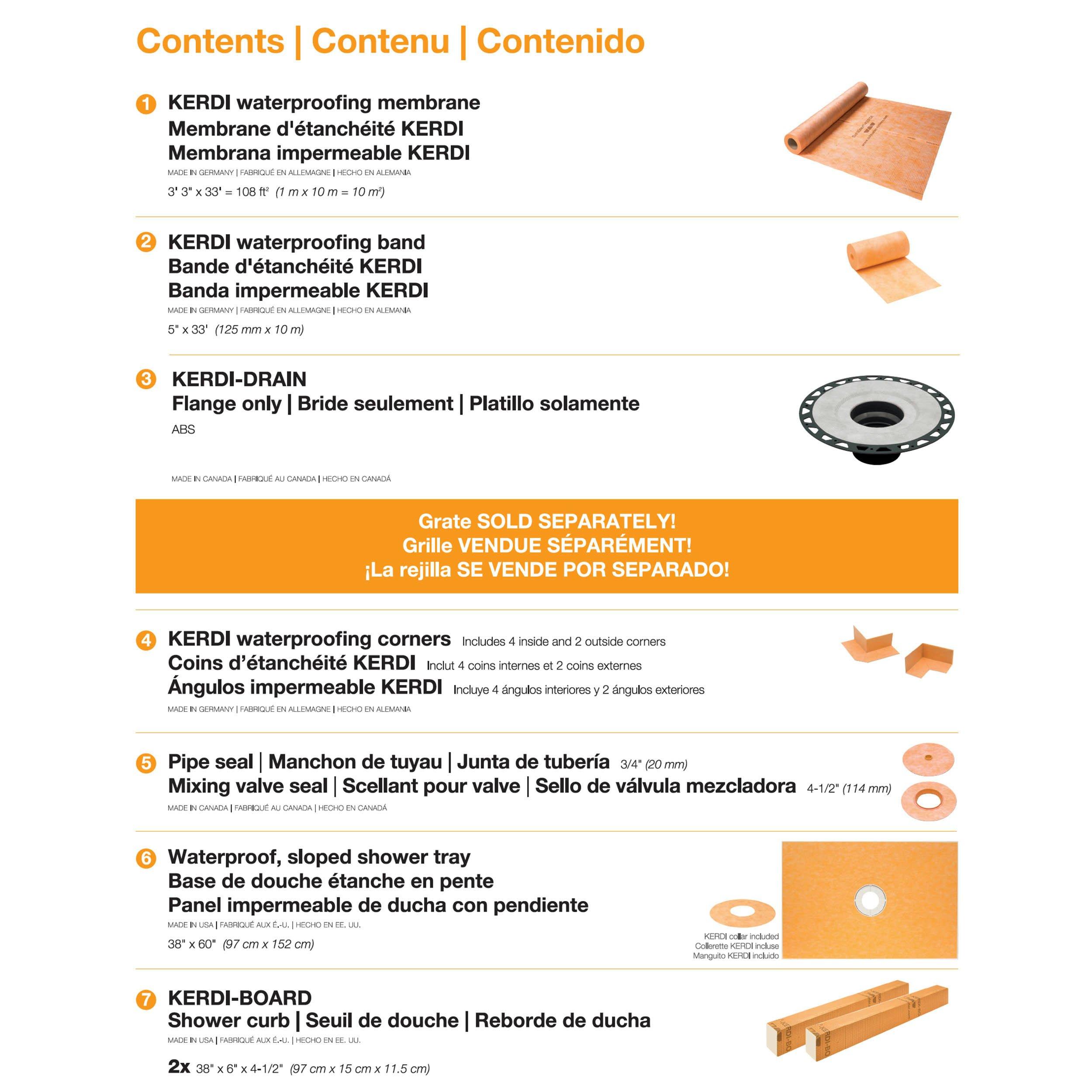 LifetimeSchluter Kerdi-Shower Kit 38in. x 60in. ABS Flange 2 is a complete solution for creating a watertight shower assembly without the need for a mortar bed. This kit includes all essential components for a fully waterproof and vapor-tight tiled shower enclosure, designed for use with a KERDI-DRAIN grate sold separately.