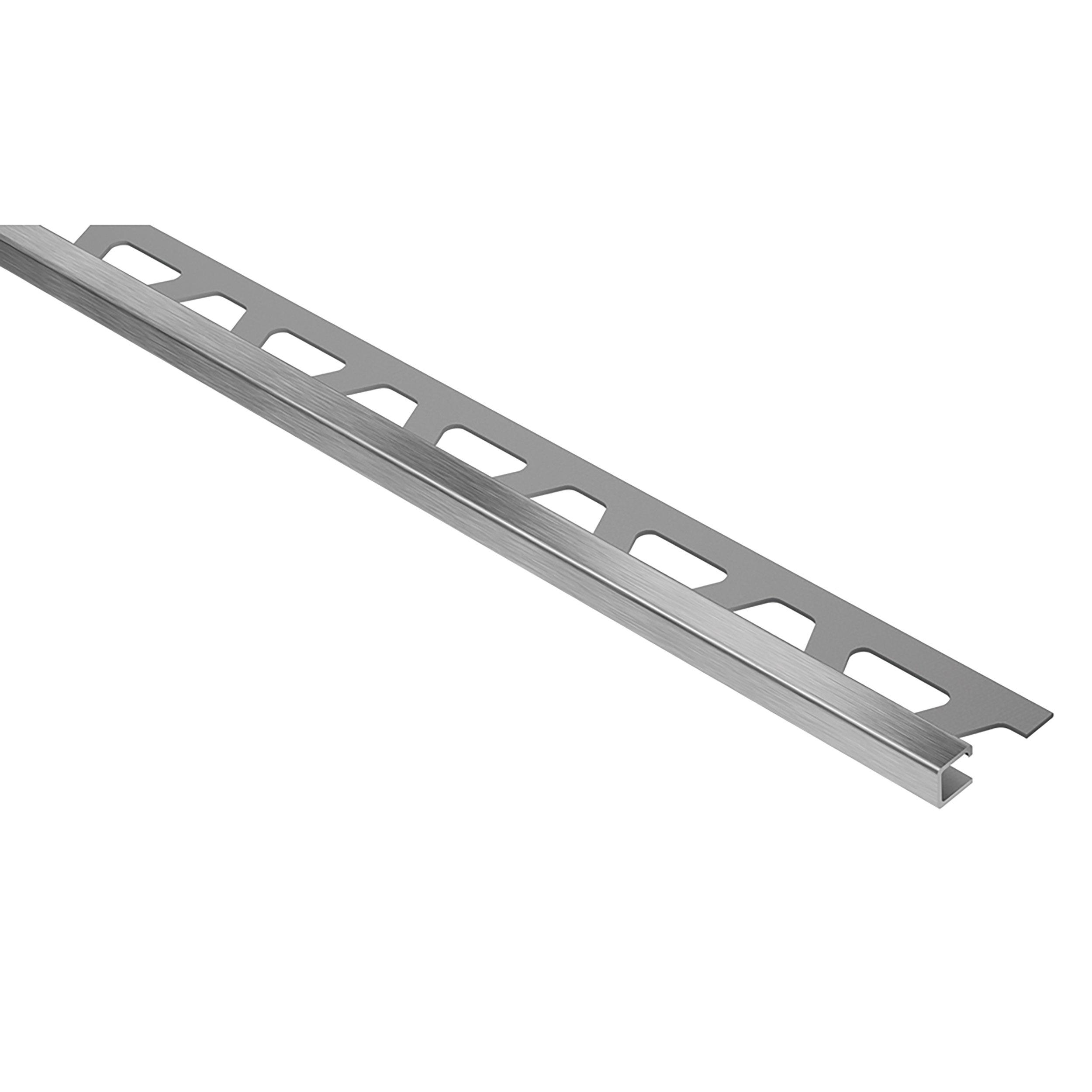 Schluter Quadec Square Edge Trim 11/32in. Brush Stainless Steel is a finishing and edge-protection profile for the outside corners of tiled surfaces on walls. The vertical wall section of the profile provides a decorative finish and protects adjacent tiles. Other applications include transitions for dado coverings such as carpet, natural stone, or cold-cured resin coatings.