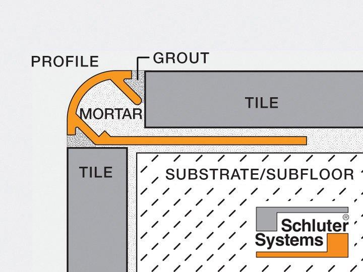 Schluter Rondec Bullnose Trim 1/4in. Aluminum Satin Nickel is a finishing and edge-protection profile for the outside corners of tiled surfaces on walls. The vertical wall section of the profile provides a decorative finish and protects adjacent tiles. Other applications include transitions for dado coverings such as carpet, natural stone, or cold-cured resin coatings.