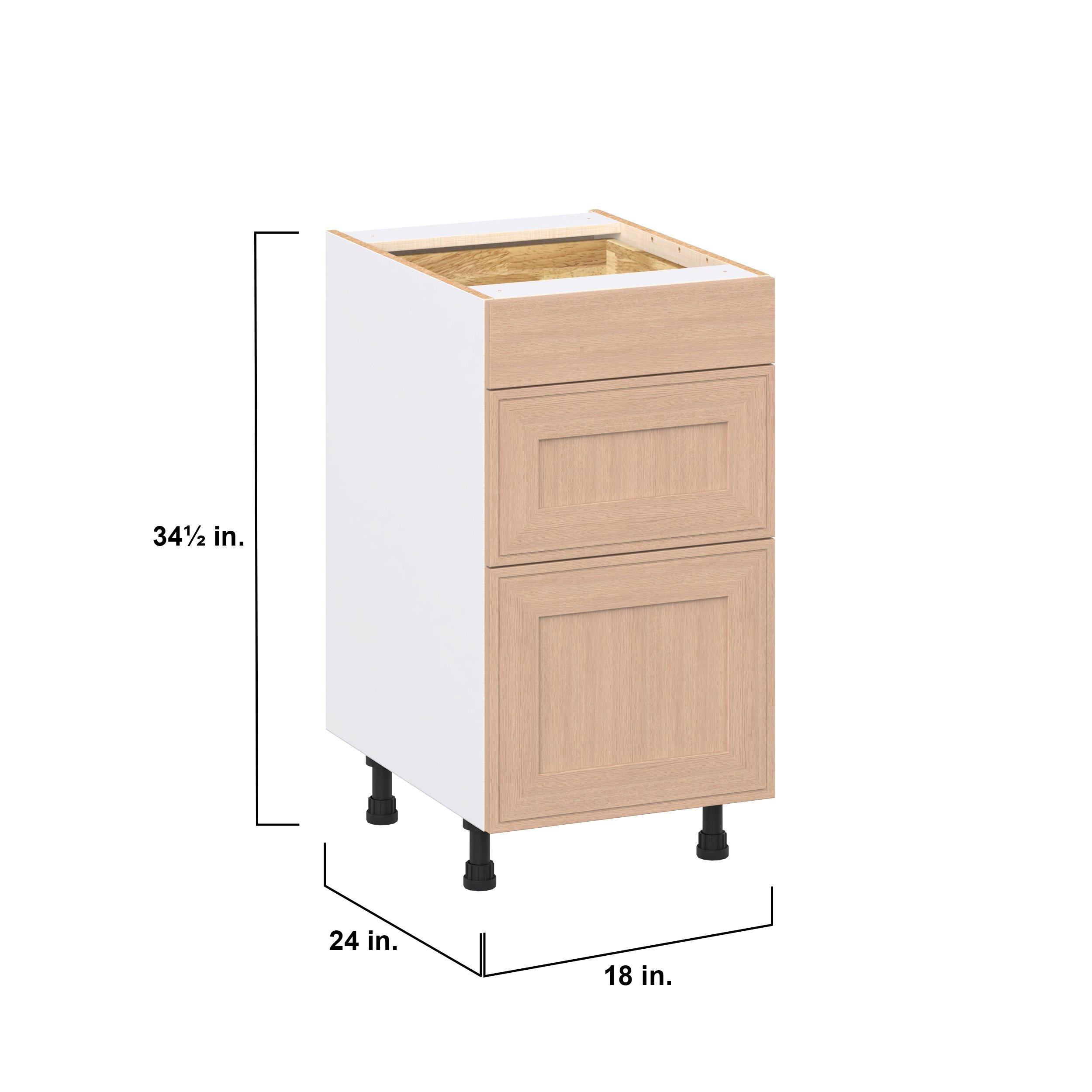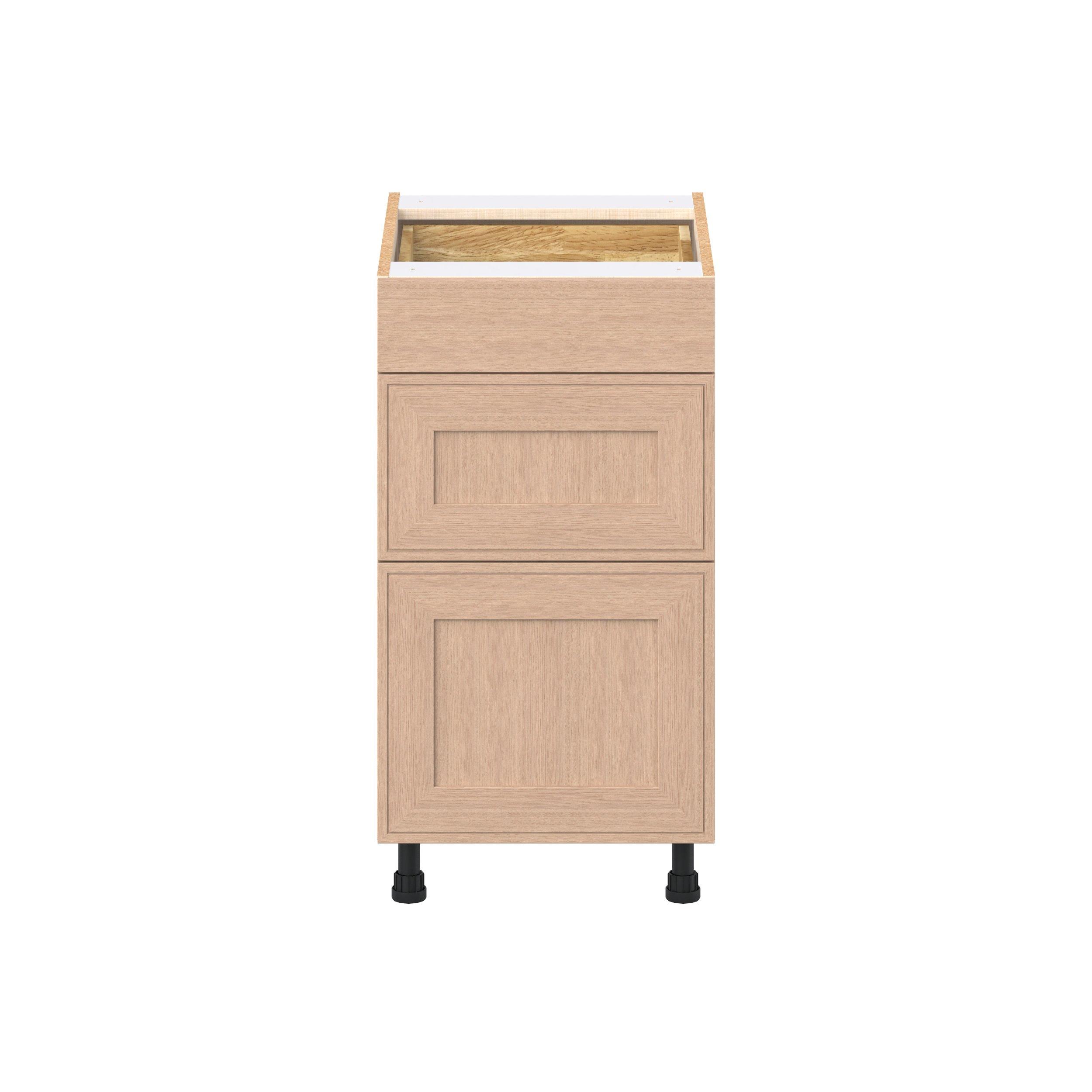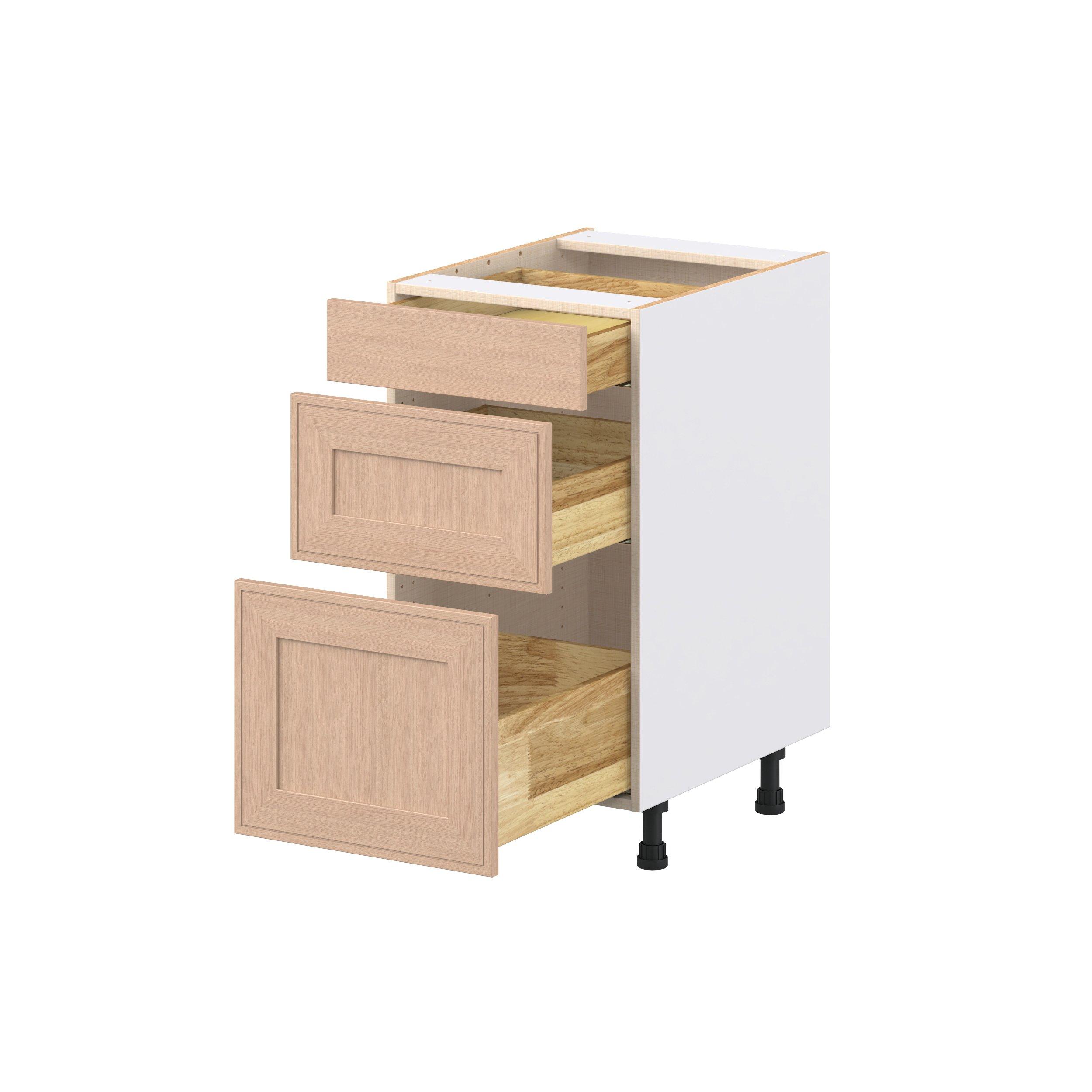 Crafted from natural rift-cut oak, Ambrose shaker-inspired cabinets deliver a modern take on timeless style. Designed to emulate the look of inset framed cabinetry while offering the full-access advantages of frameless construction, Studio Design Collection Ambrose 18 in. Stained Sandbar Rift-Cut Oak Drawer Base Cabinet blends classic appeal with smart functionality. With 5-piece mitered doors, soft-close hardware, solid wood dovetail drawers, and a designer linen interior, every detail is built for lasting performance. A robust selection of interior accessories—from pull-outs to organizers—ensures the inside works as beautifully as the outside looks.