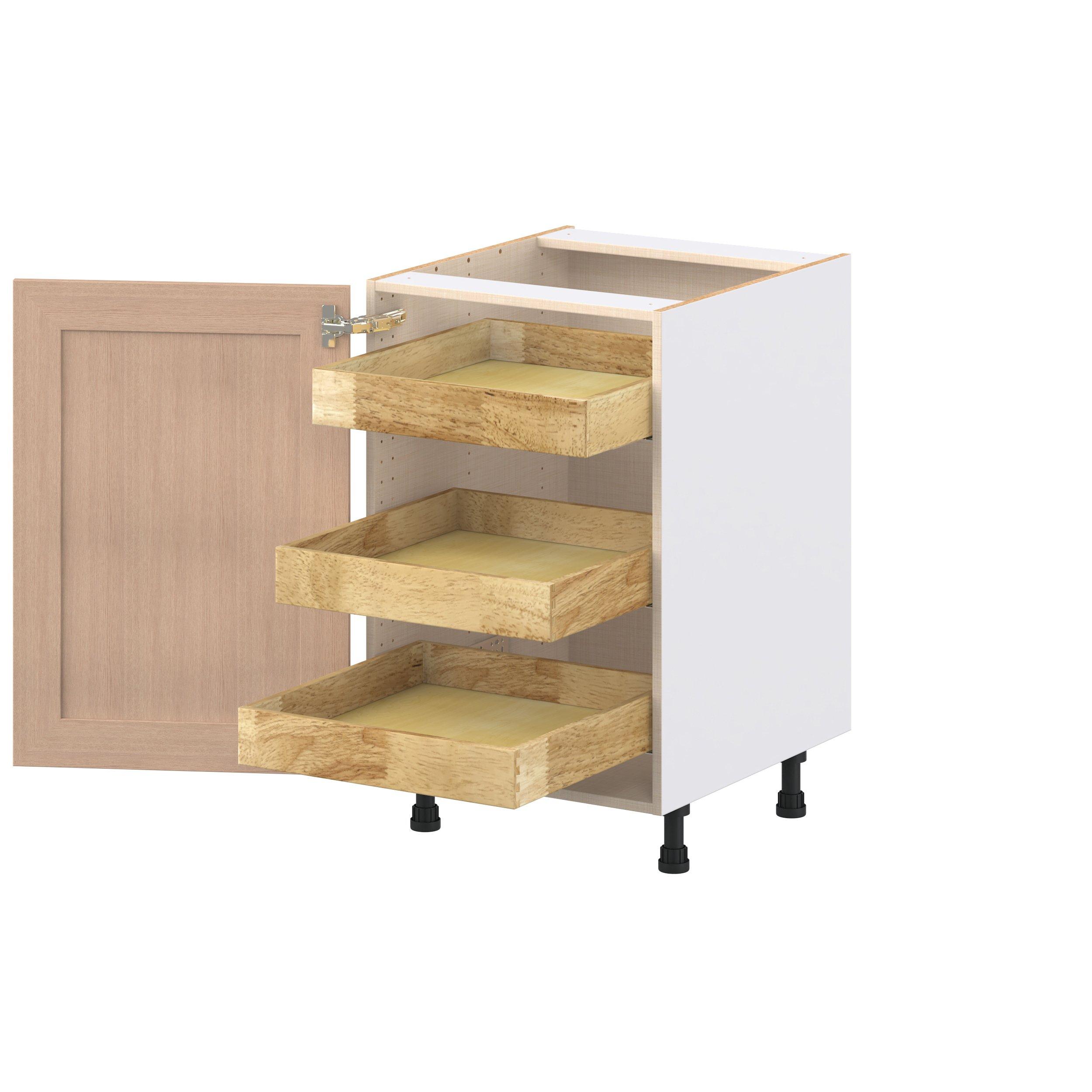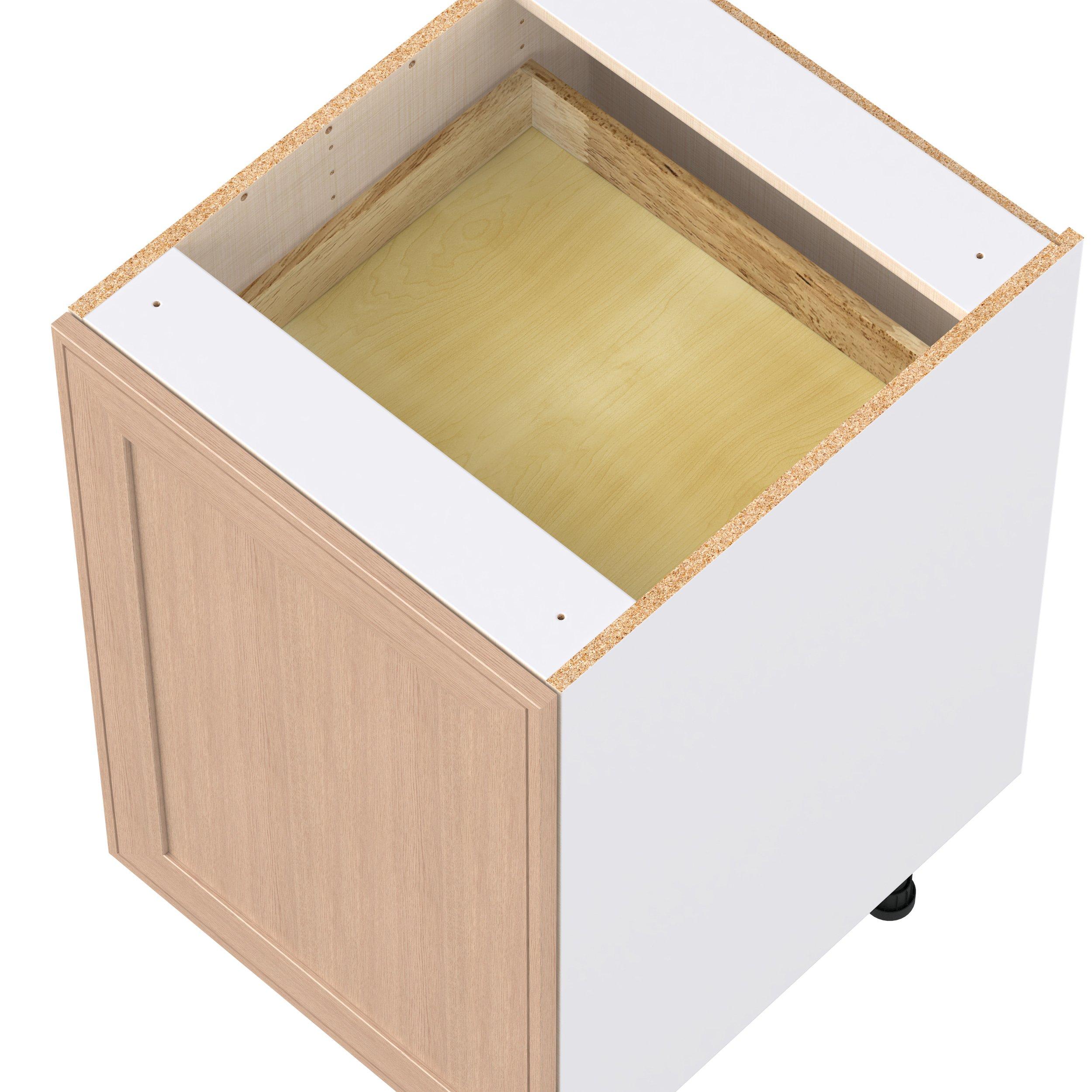 Crafted from natural rift-cut oak, Ambrose shaker-inspired cabinets deliver a modern take on timeless style. Designed to emulate the look of inset framed cabinetry while offering the full-access advantages of frameless construction, Studio Design Collection Ambrose 21 in. Stained Sandbar Rift-Cut Oak Base Cabinet with Inner Pull-Out Drawer blends classic appeal with smart functionality. With 5-piece mitered doors, soft-close hardware, solid wood dovetail drawers, and a designer linen interior, every detail is built for lasting performance. A robust selection of interior accessories—from pull-outs to organizers—ensures the inside works as beautifully as the outside looks.