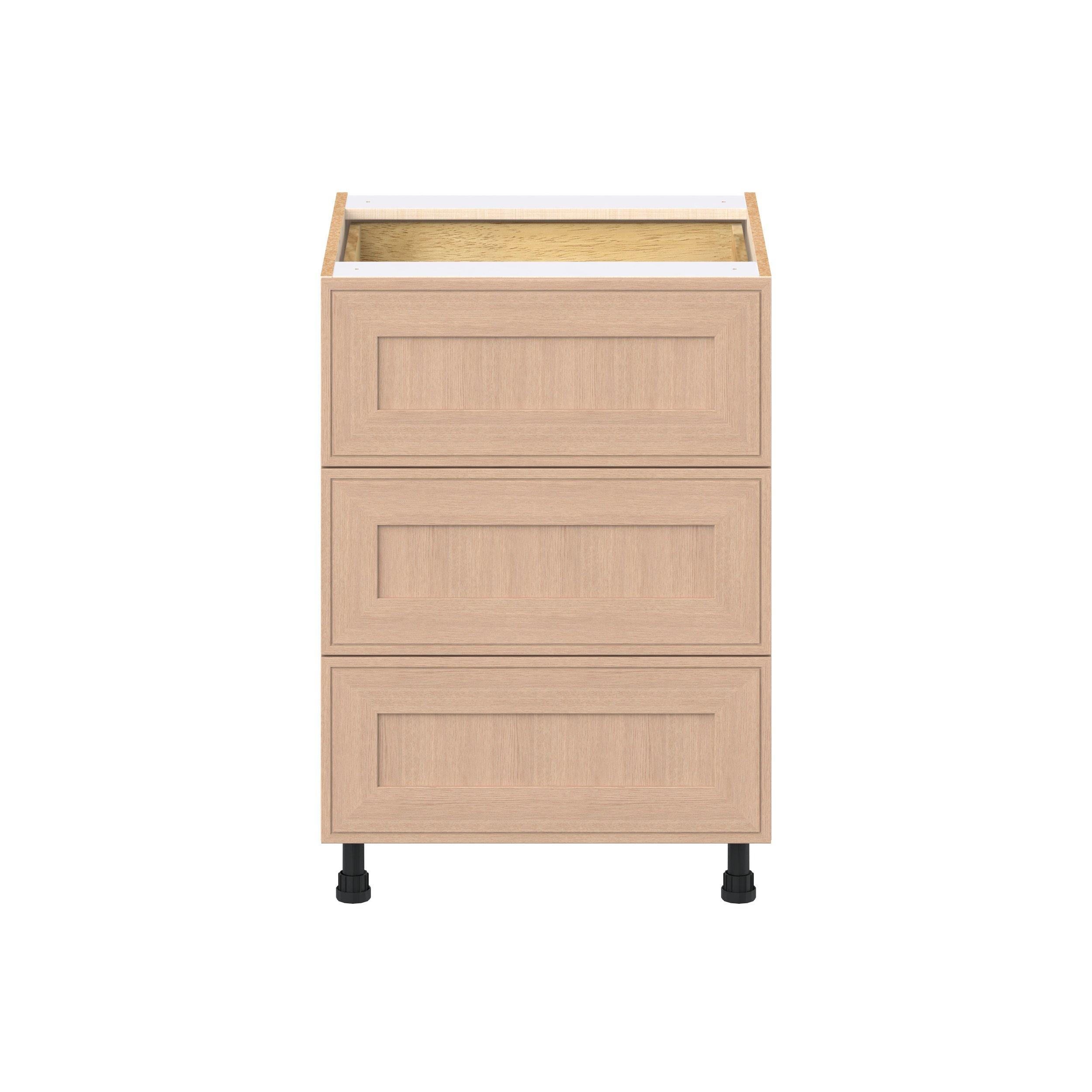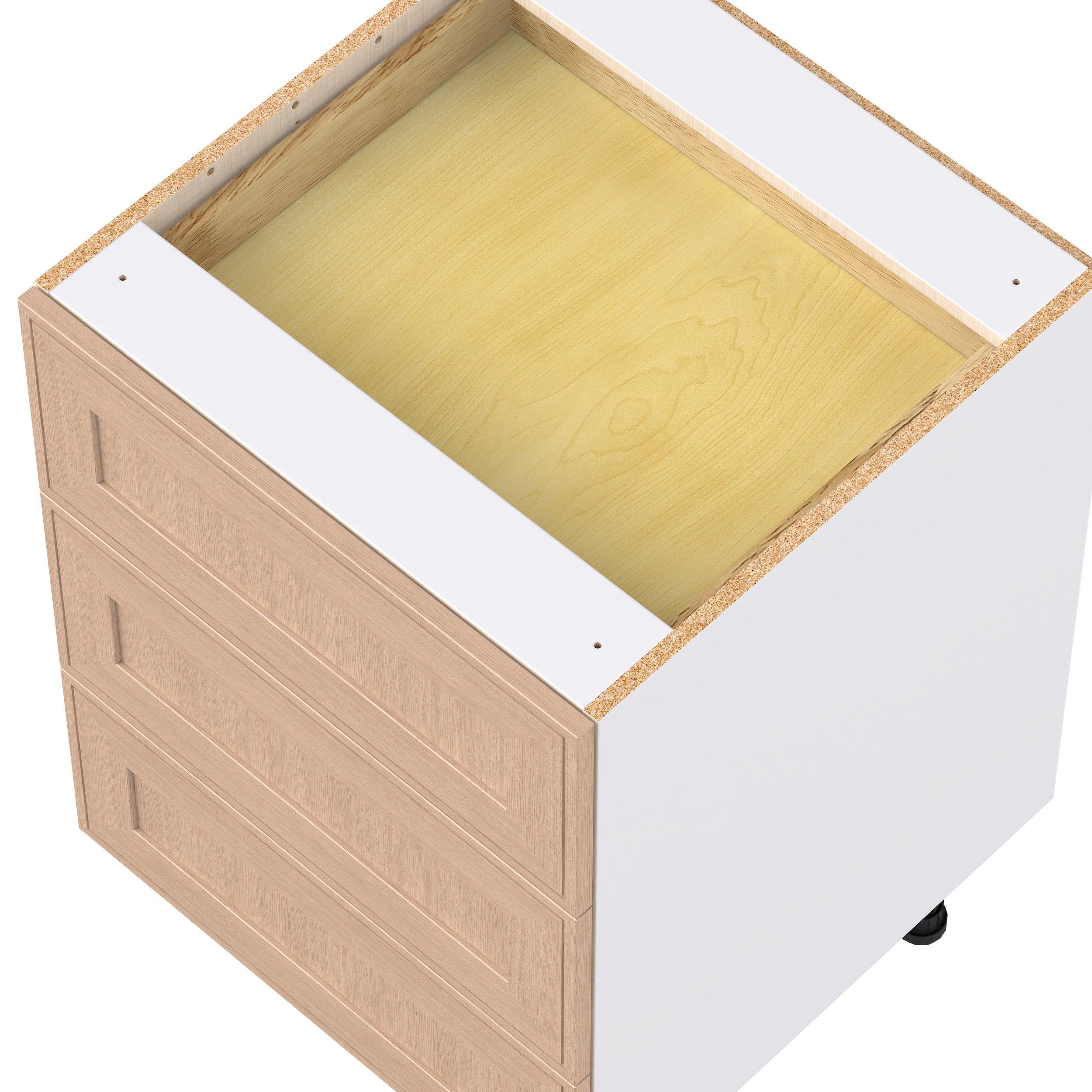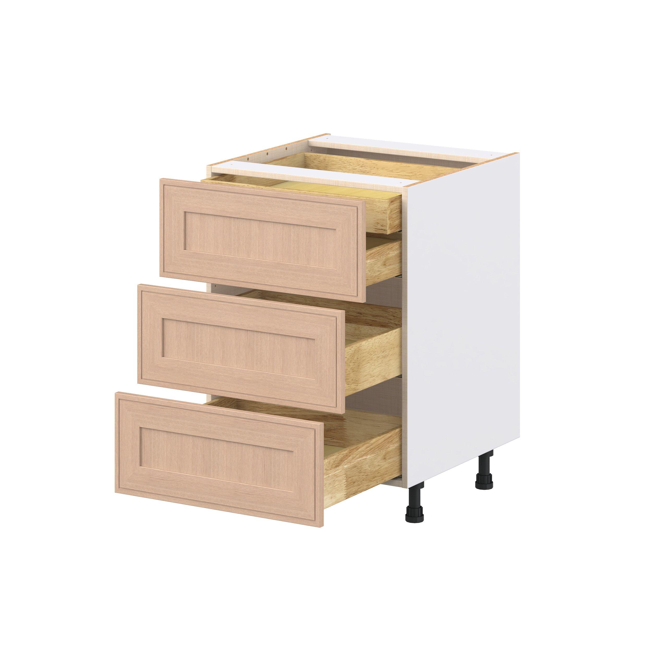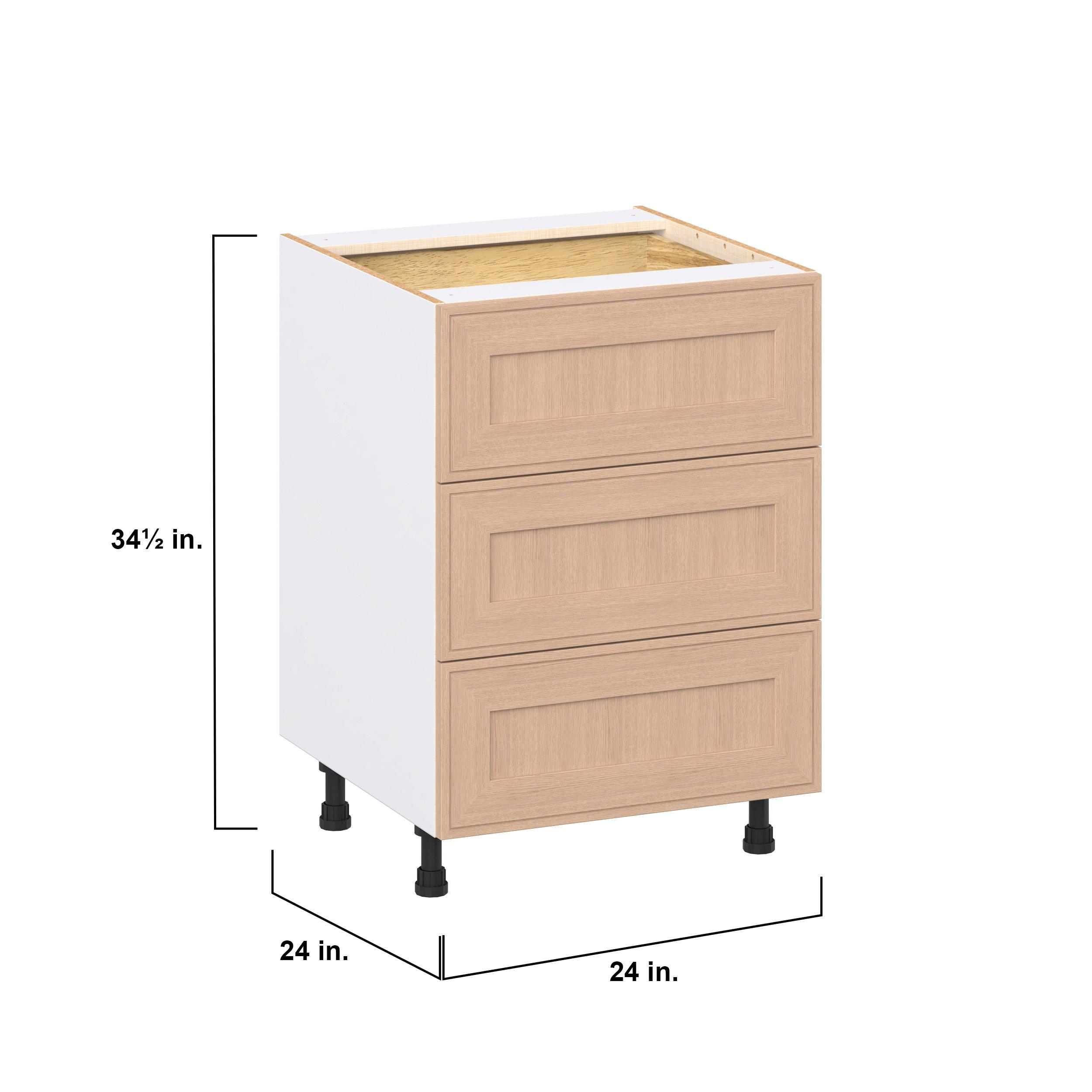 Crafted from natural rift-cut oak, Ambrose shaker-inspired cabinets deliver a modern take on timeless style. Designed to emulate the look of inset framed cabinetry while offering the full-access advantages of frameless construction, Studio Design Collection Ambrose 24 in. Stained Sandbar Rift-Cut Oak Base Cabinet with Inner Pull-Out Drawer blends classic appeal with smart functionality. With 5-piece mitered doors, soft-close hardware, solid wood dovetail drawers, and a designer linen interior, every detail is built for lasting performance. A robust selection of interior accessories—from pull-outs to organizers—ensures the inside works as beautifully as the outside looks.