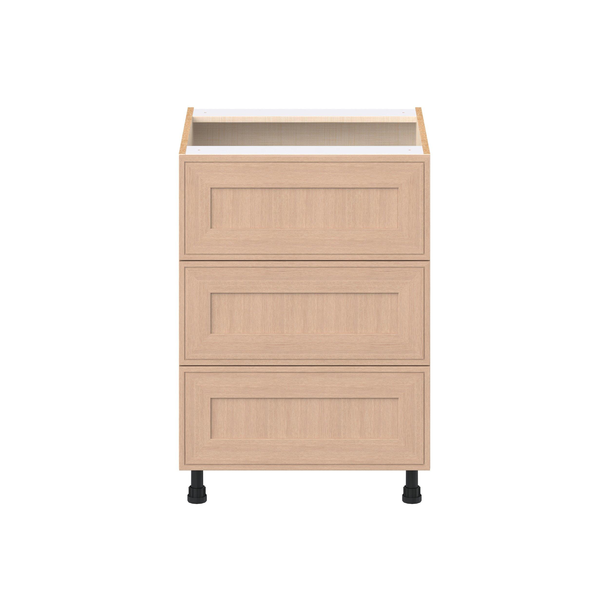 Crafted from natural rift-cut oak, Ambrose shaker-inspired cabinets deliver a modern take on timeless style. Designed to emulate the look of inset framed cabinetry while offering the full-access advantages of frameless construction, Studio Design Collection Ambrose 24 in. Stained Sandbar Rift-Cut Oak Drawer Base Cabinet blends classic appeal with smart functionality. With 5-piece mitered doors, soft-close hardware, solid wood dovetail drawers, and a designer linen interior, every detail is built for lasting performance. A robust selection of interior accessories—from pull-outs to organizers—ensures the inside works as beautifully as the outside looks.