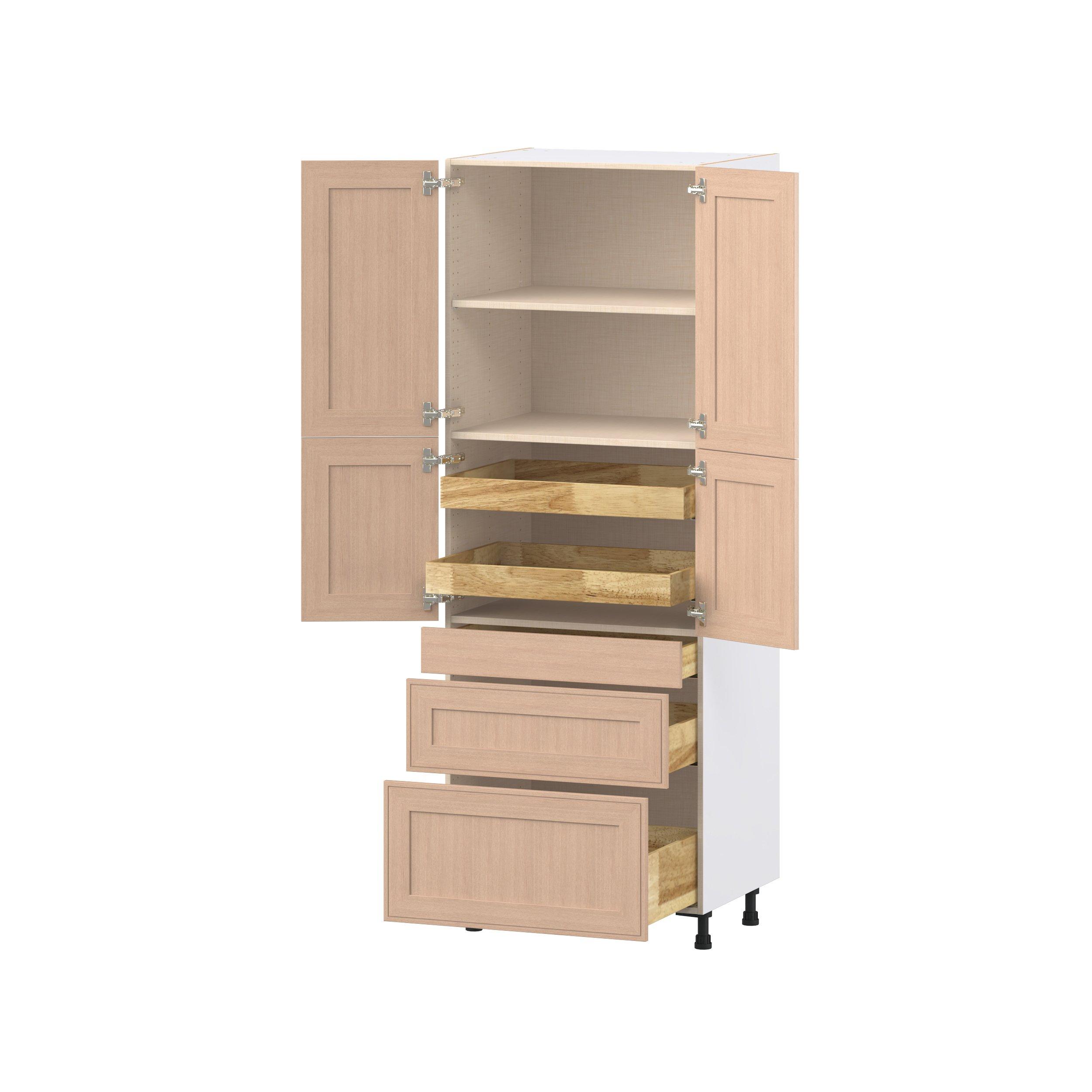 Crafted from natural rift-cut oak, Ambrose shaker-inspired cabinets deliver a modern take on timeless style. Designed to emulate the look of inset framed cabinetry while offering the full-access advantages of frameless construction, Studio Design Collection Ambrose 30 in. Stained Sandbar Rift-Cut Oak Door and Drawer Pantry Cabinet with Inner Pull-Out blends classic appeal with smart functionality. With 5-piece mitered doors, soft-close hardware, solid wood dovetail drawers, and a designer linen interior, every detail is built for lasting performance. A robust selection of interior accessories—from pull-outs to organizers—ensures the inside works as beautifully as the outside looks.