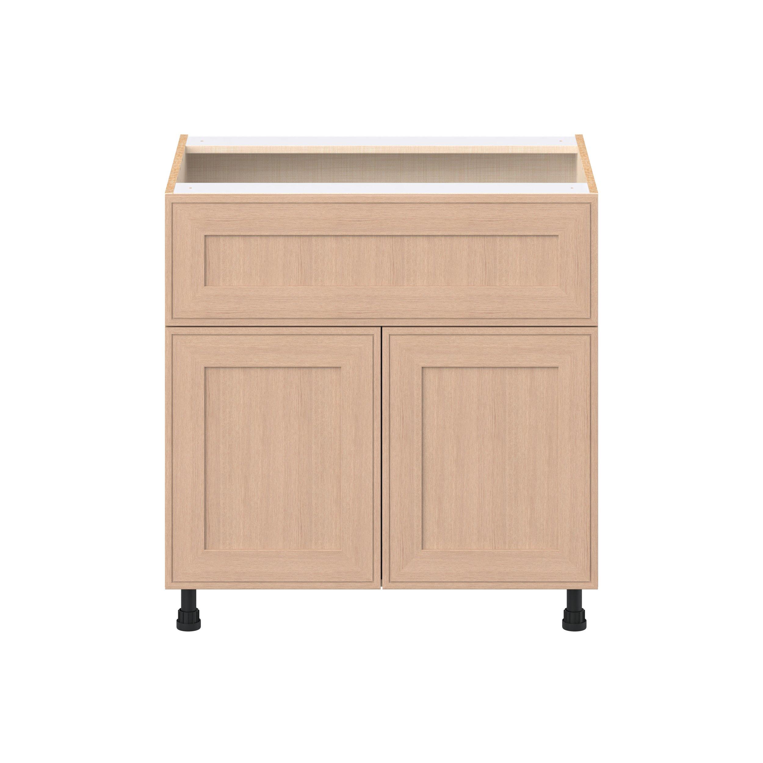 Crafted from natural rift-cut oak, Ambrose shaker-inspired cabinets deliver a modern take on timeless style. Designed to emulate the look of inset framed cabinetry while offering the full-access advantages of frameless construction, Studio Design Collection Ambrose 33 in. Stained Sandbar Rift-Cut Oak Door and Drawer Base Cabinet blends classic appeal with smart functionality. With 5-piece mitered doors, soft-close hardware, solid wood dovetail drawers, and a designer linen interior, every detail is built for lasting performance. A robust selection of interior accessories—from pull-outs to organizers—ensures the inside works as beautifully as the outside looks.