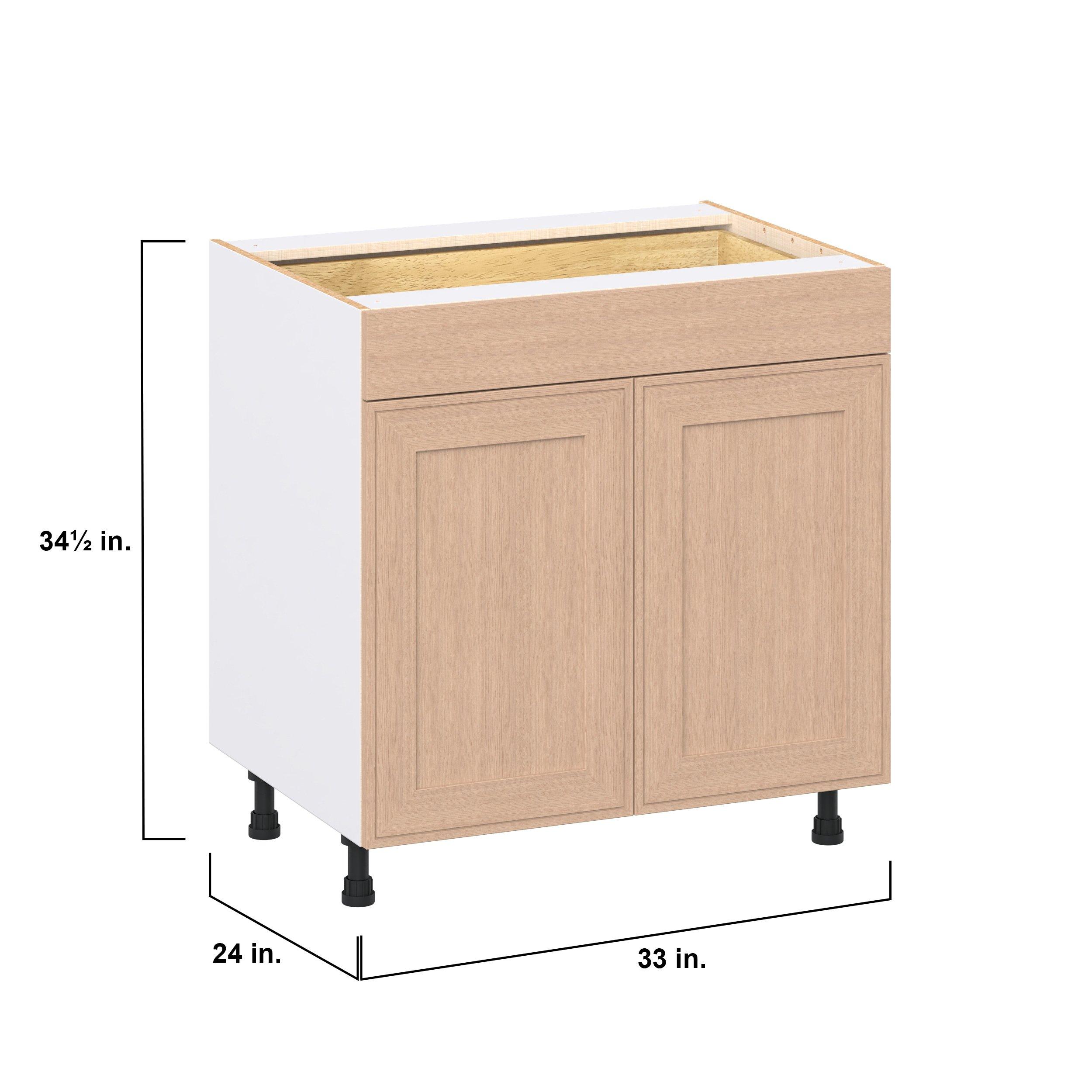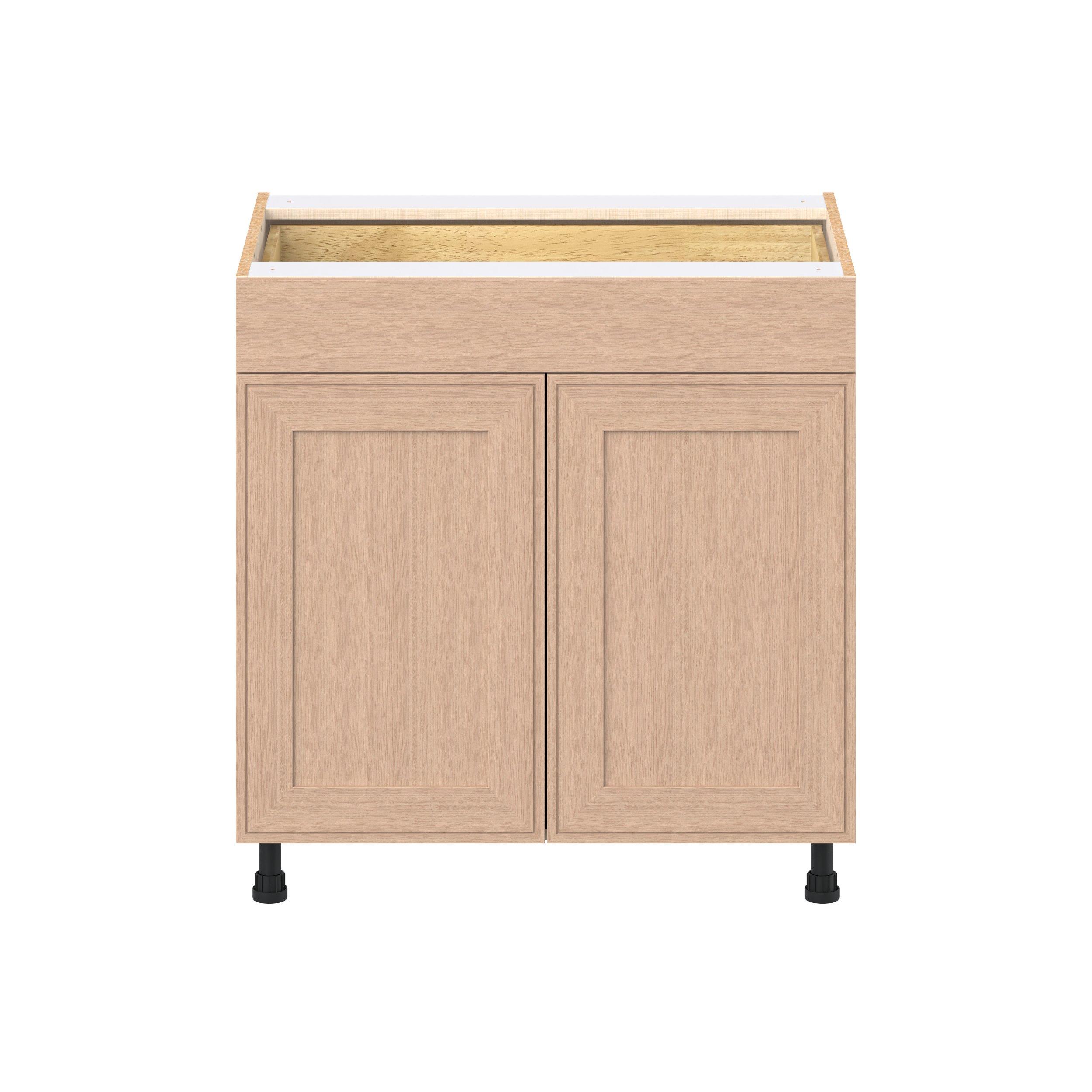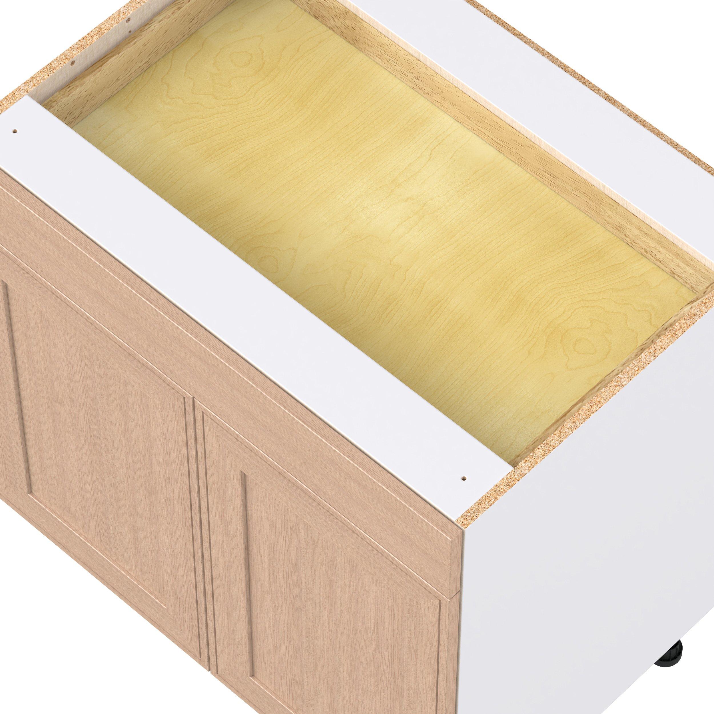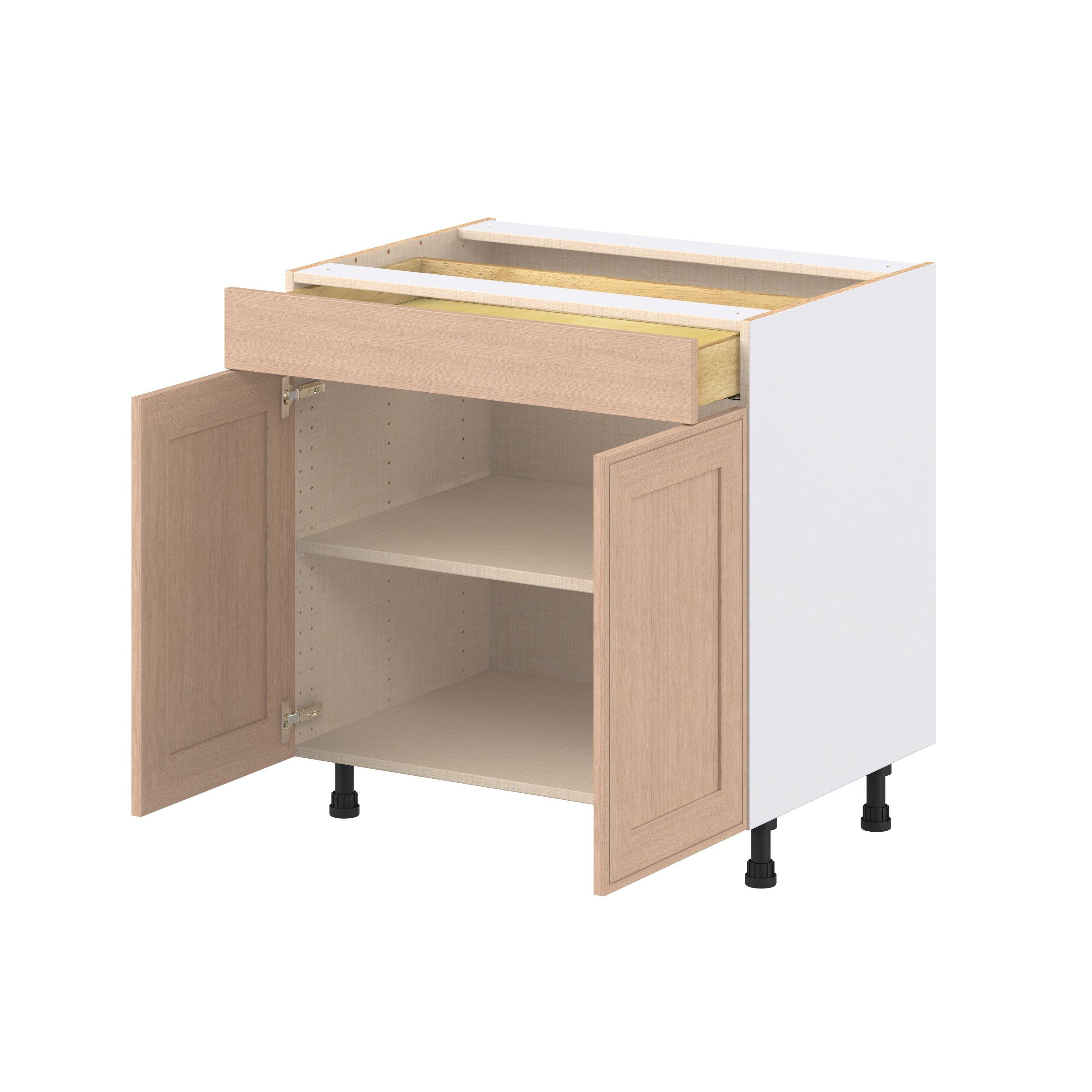 Crafted from natural rift-cut oak, Ambrose shaker-inspired cabinets deliver a modern take on timeless style. Designed to emulate the look of inset framed cabinetry while offering the full-access advantages of frameless construction, Studio Design Collection Ambrose 33 in. Stained Sandbar Rift-Cut Oak Door and Drawer Base Cabinet blends classic appeal with smart functionality. With 5-piece mitered doors, soft-close hardware, solid wood dovetail drawers, and a designer linen interior, every detail is built for lasting performance. A robust selection of interior accessories—from pull-outs to organizers—ensures the inside works as beautifully as the outside looks.