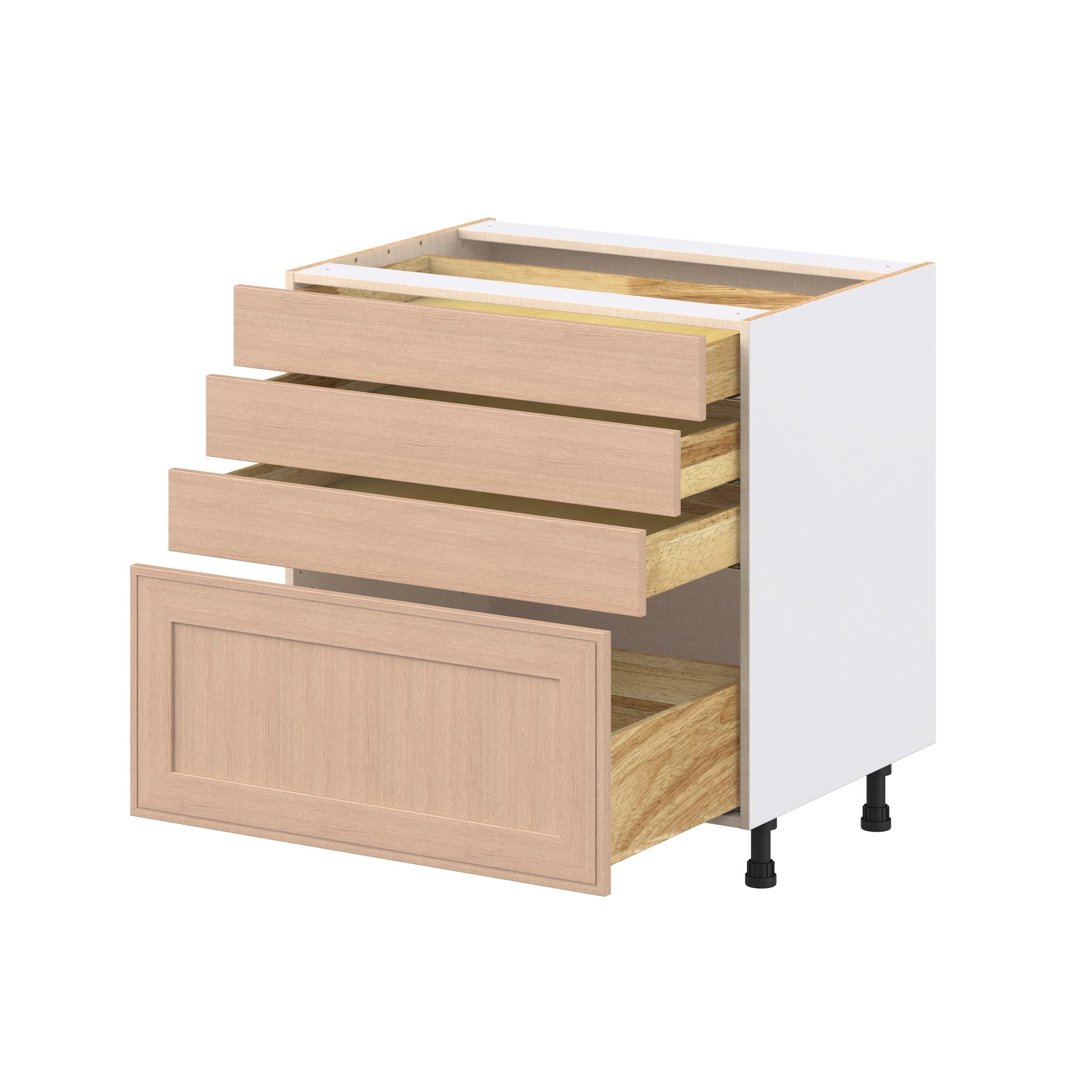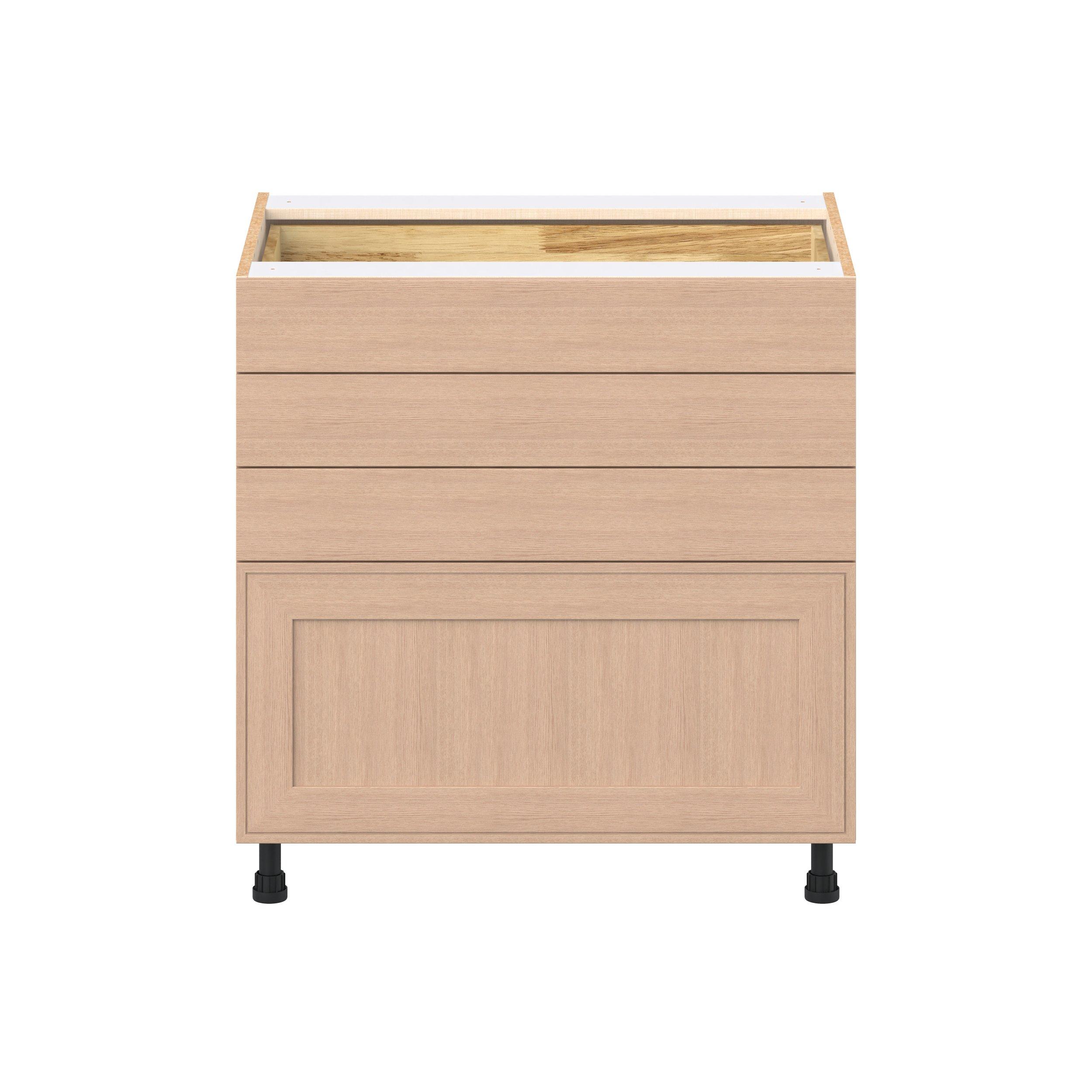 Crafted from natural rift-cut oak, Ambrose shaker-inspired cabinets deliver a modern take on timeless style. Designed to emulate the look of inset framed cabinetry while offering the full-access advantages of frameless construction, Studio Design Collection Ambrose 33 in. Stained Sandbar Rift-Cut Oak Drawer Base Cabinet blends classic appeal with smart functionality. With 5-piece mitered doors, soft-close hardware, solid wood dovetail drawers, and a designer linen interior, every detail is built for lasting performance. A robust selection of interior accessories—from pull-outs to organizers—ensures the inside works as beautifully as the outside looks.
