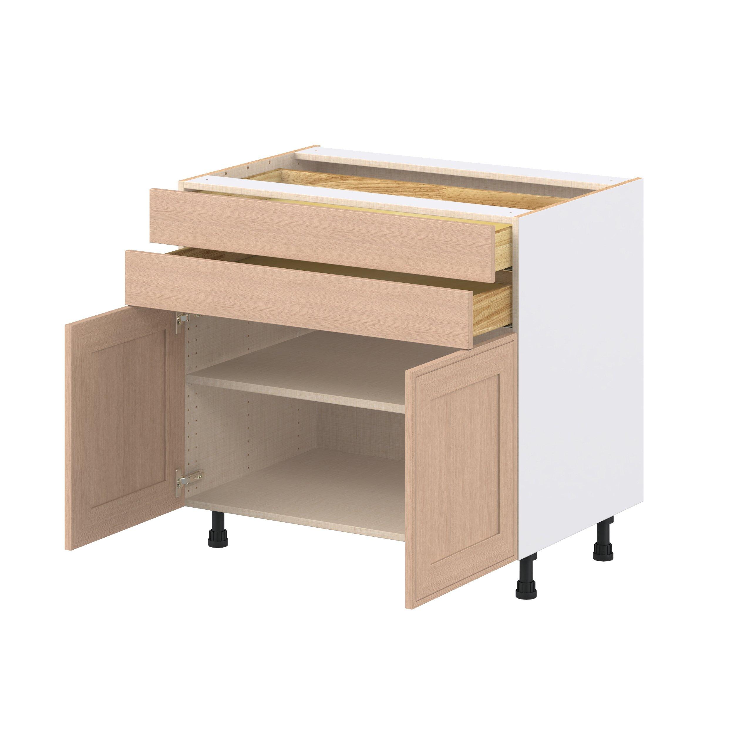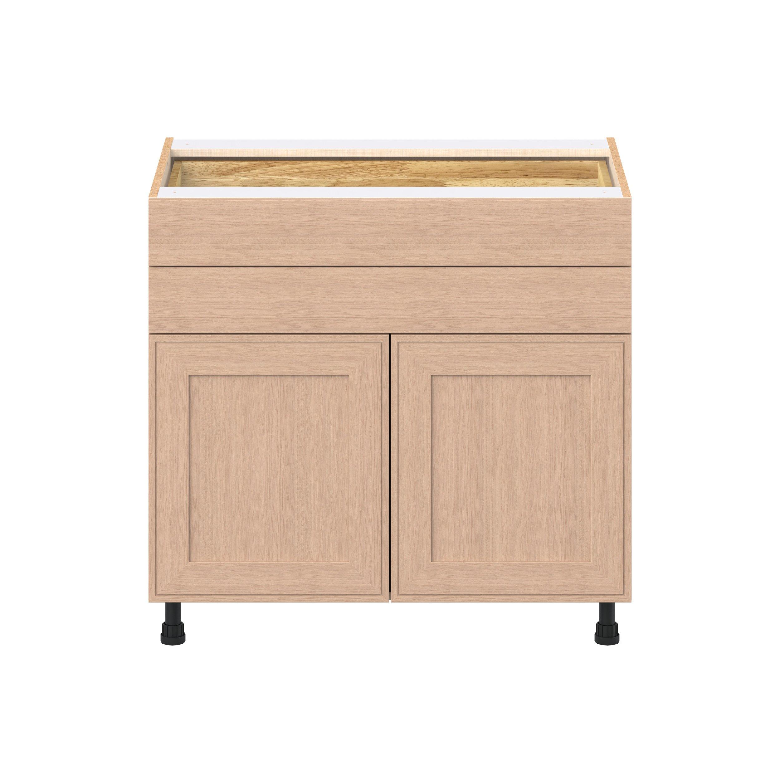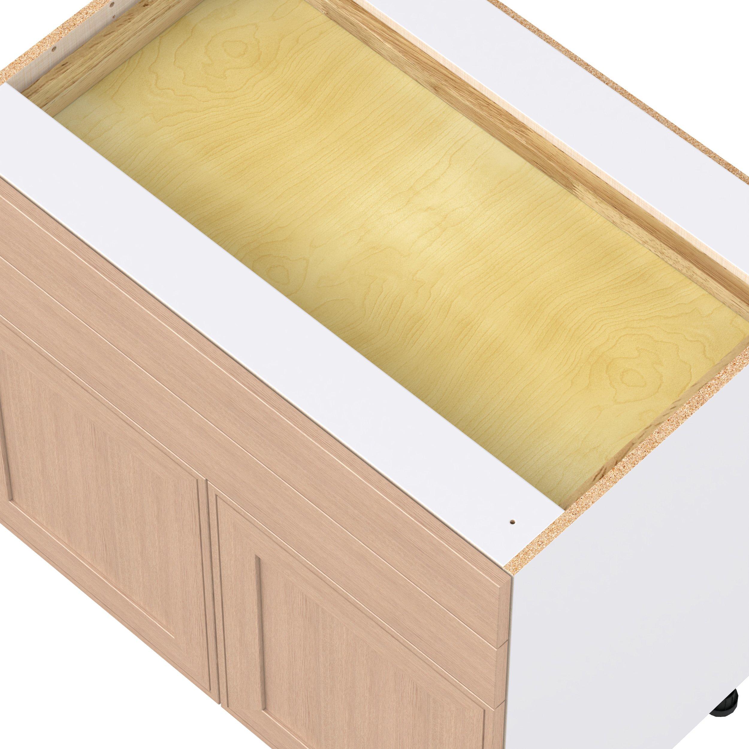 Crafted from natural rift-cut oak, Ambrose shaker-inspired cabinets deliver a modern take on timeless style. Designed to emulate the look of inset framed cabinetry while offering the full-access advantages of frameless construction, Studio Design Collection Ambrose 36 in. Stained Sandbar Rift-Cut Oak Door and Drawer Base Cabinet blends classic appeal with smart functionality. With 5-piece mitered doors, soft-close hardware, solid wood dovetail drawers, and a designer linen interior, every detail is built for lasting performance. A robust selection of interior accessories—from pull-outs to organizers—ensures the inside works as beautifully as the outside looks.