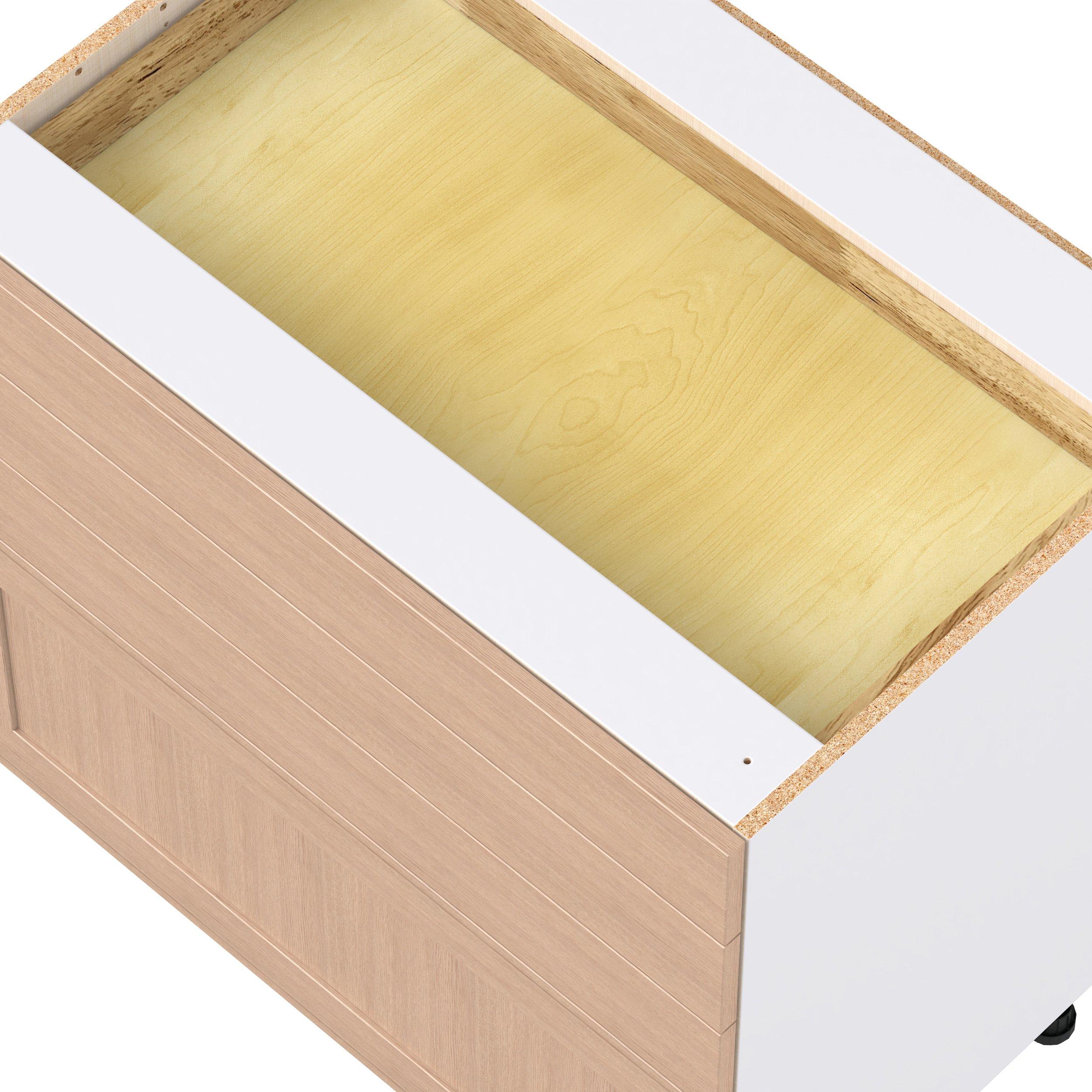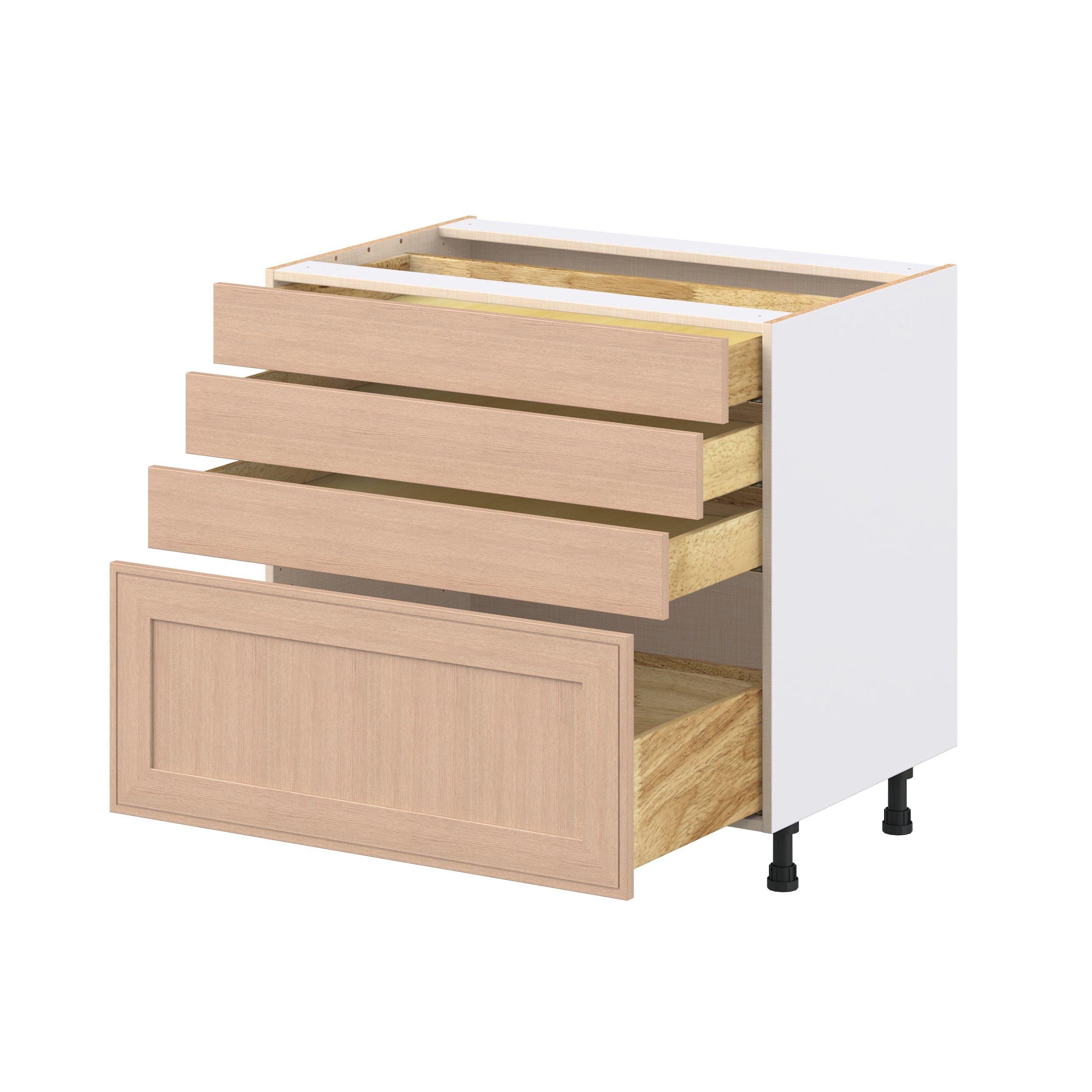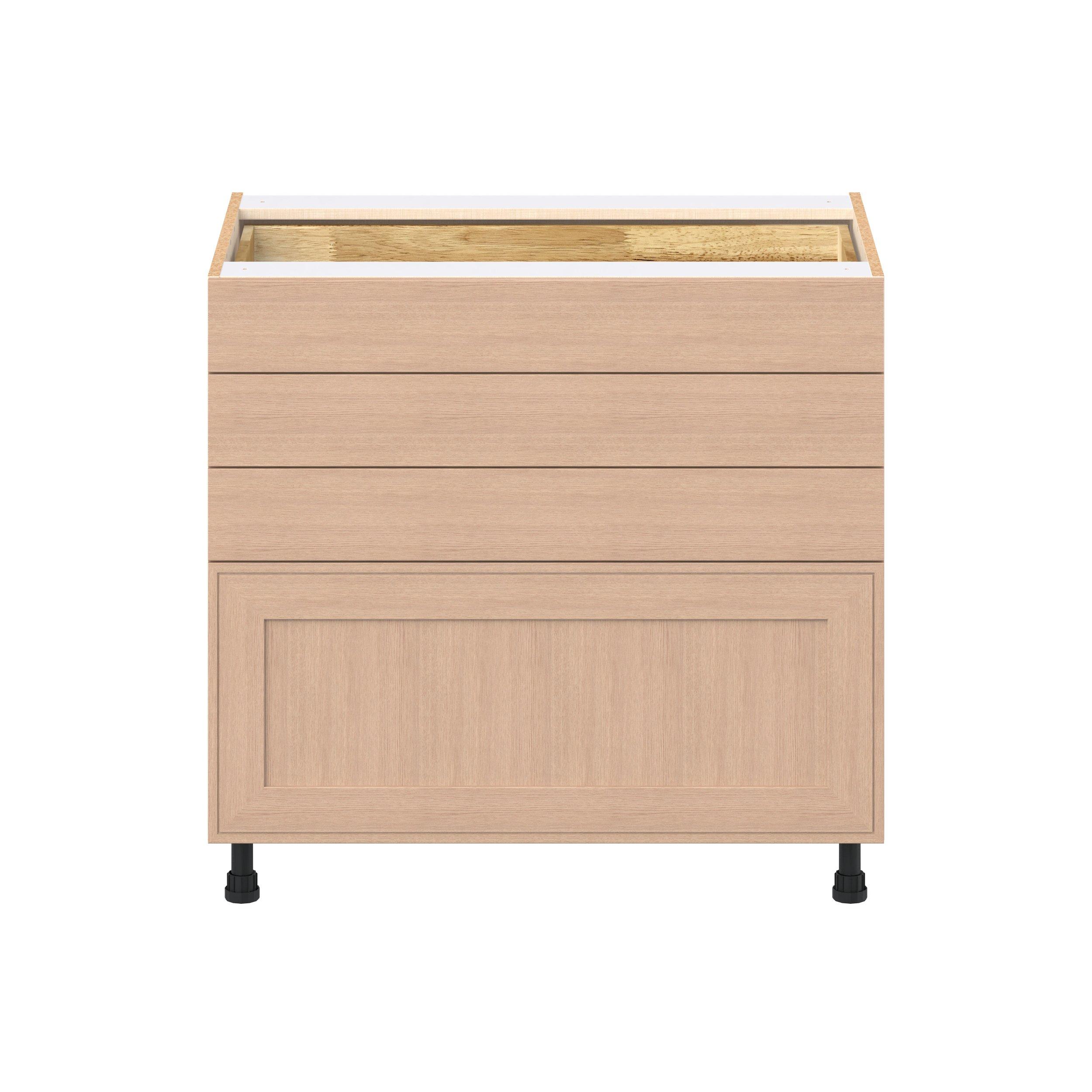 Crafted from natural rift-cut oak, Ambrose shaker-inspired cabinets deliver a modern take on timeless style. Designed to emulate the look of inset framed cabinetry while offering the full-access advantages of frameless construction, Studio Design Collection Ambrose 36 in. Stained Sandbar Rift-Cut Oak Drawer Base Cabinet blends classic appeal with smart functionality. With 5-piece mitered doors, soft-close hardware, solid wood dovetail drawers, and a designer linen interior, every detail is built for lasting performance. A robust selection of interior accessories—from pull-outs to organizers—ensures the inside works as beautifully as the outside looks.