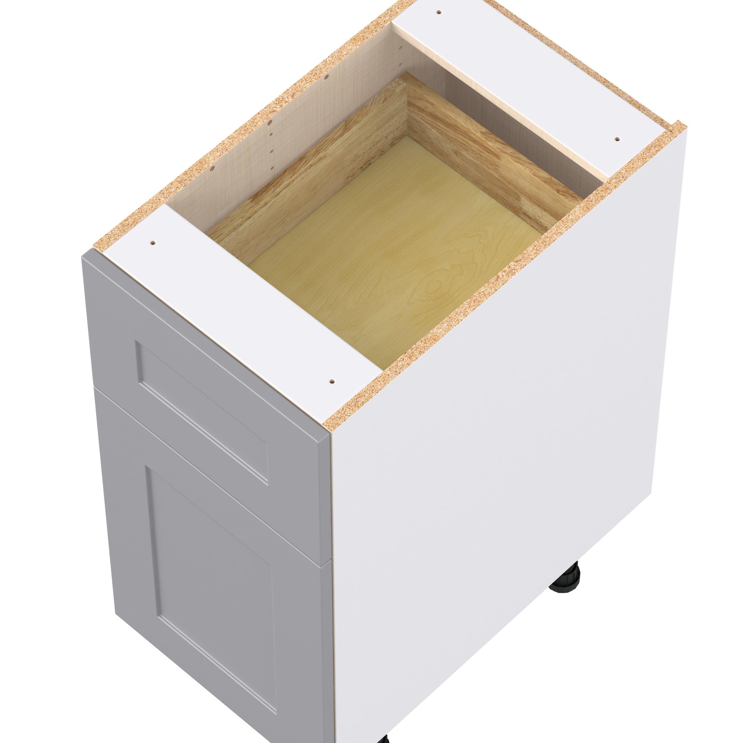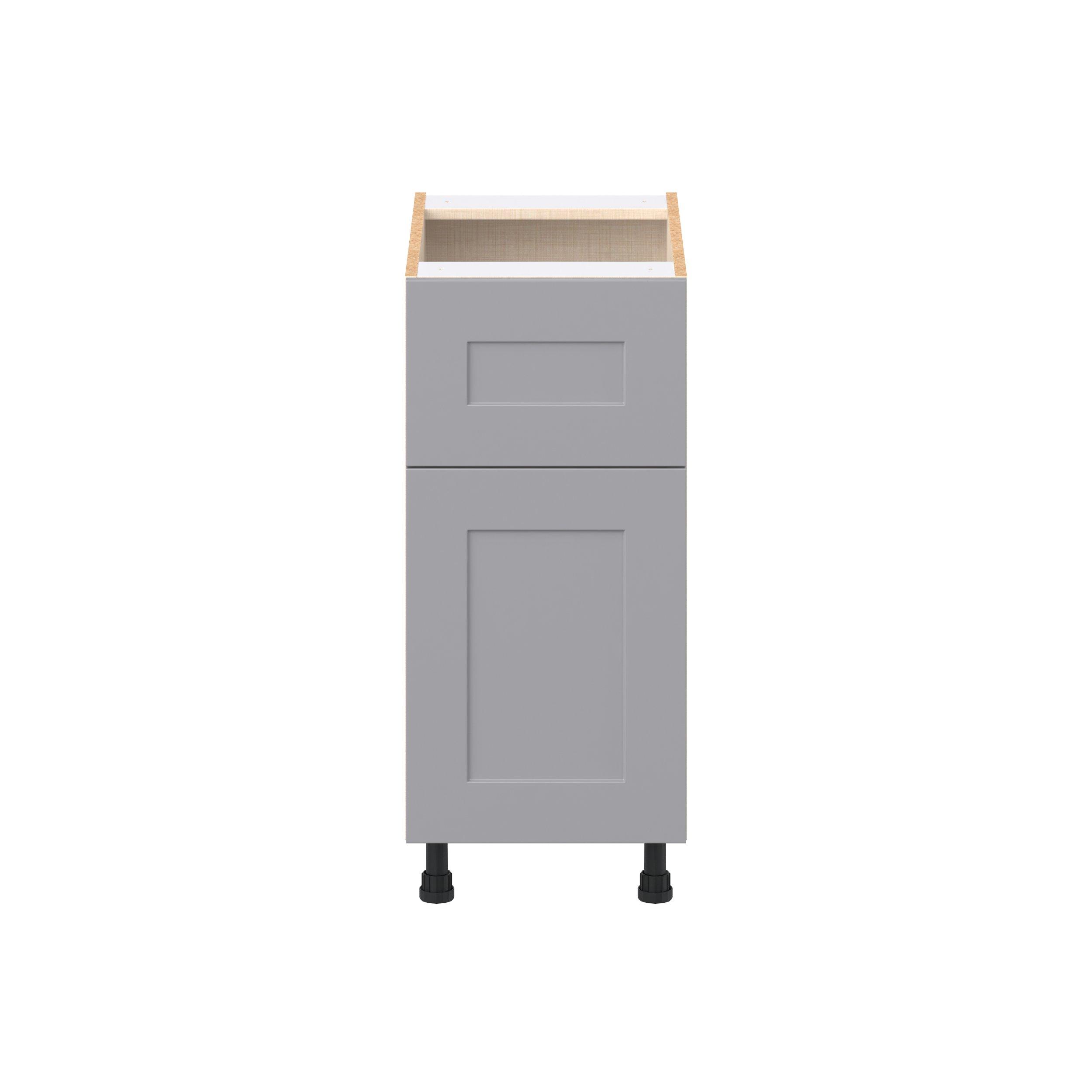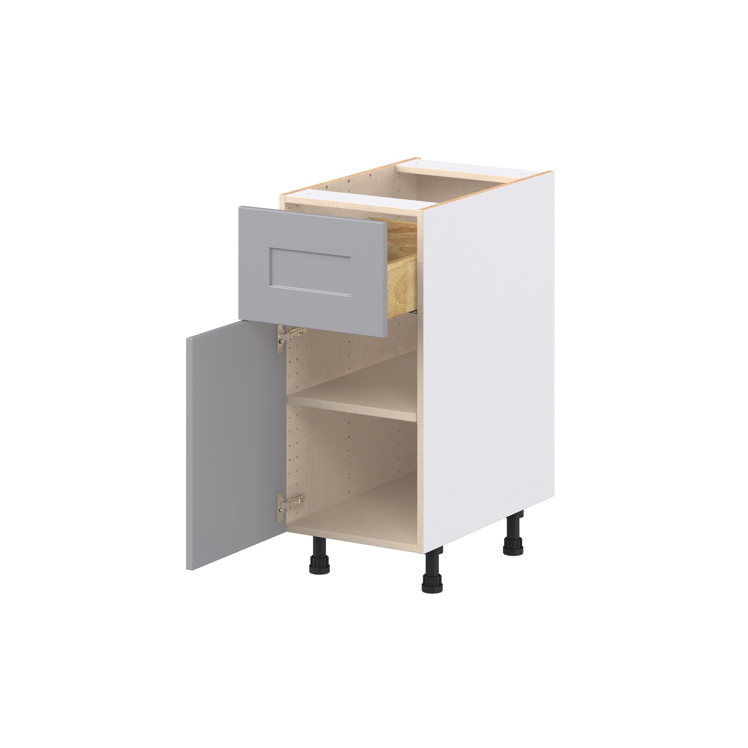 Transform your space with the elegance of Candler wide-rail shaker styles. Both the warm white and slate gray options create a rich transitional backdrop to complement any decor. Crafted from one-piece MDF Studio Design Collection Candler 15 in. Painted Slate Gray Door and Drawer Base Cabinet is designed to resist hairline cracks while the easy-to-clean finish stands up to stains and moisture. Featuring 5-piece doors and dovetail drawer joints, these cabinets offer durability and elegance. This collection combines style with everyday storage solutions.