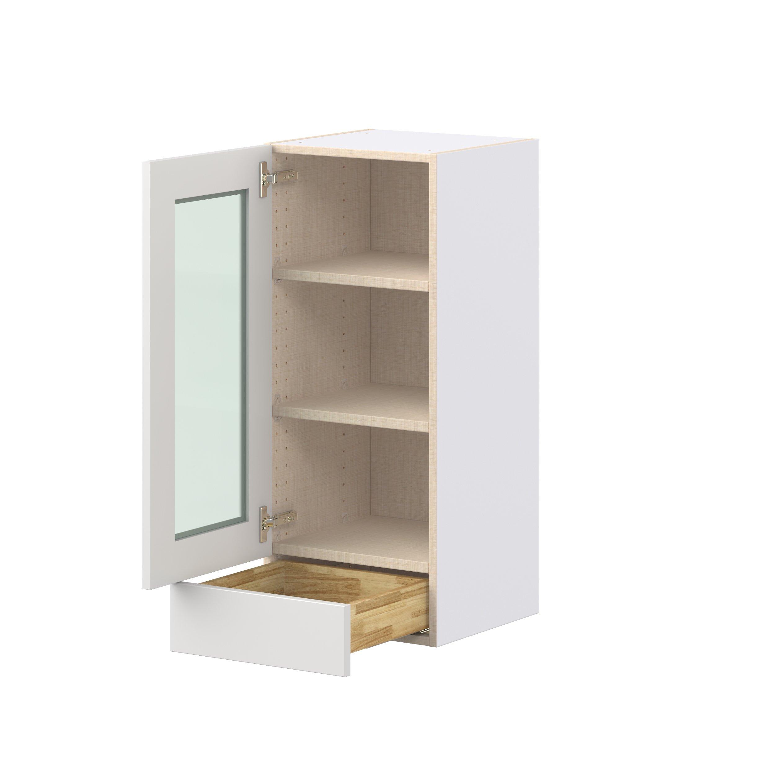 Transform your space with the elegance of Candler wide-rail shaker styles. Both the warm white and slate gray options create a rich transitional backdrop to complement any decor. Crafted from one-piece MDF Studio Design Collection Candler 15 in. Painted Warm White Drawer Wall Cabinet with Glass Door is designed to resist hairline cracks while the easy-to-clean finish stands up to stains and moisture. Featuring 5-piece doors and dovetail drawer joints, these cabinets offer durability and elegance. This collection combines style with everyday storage solutions.