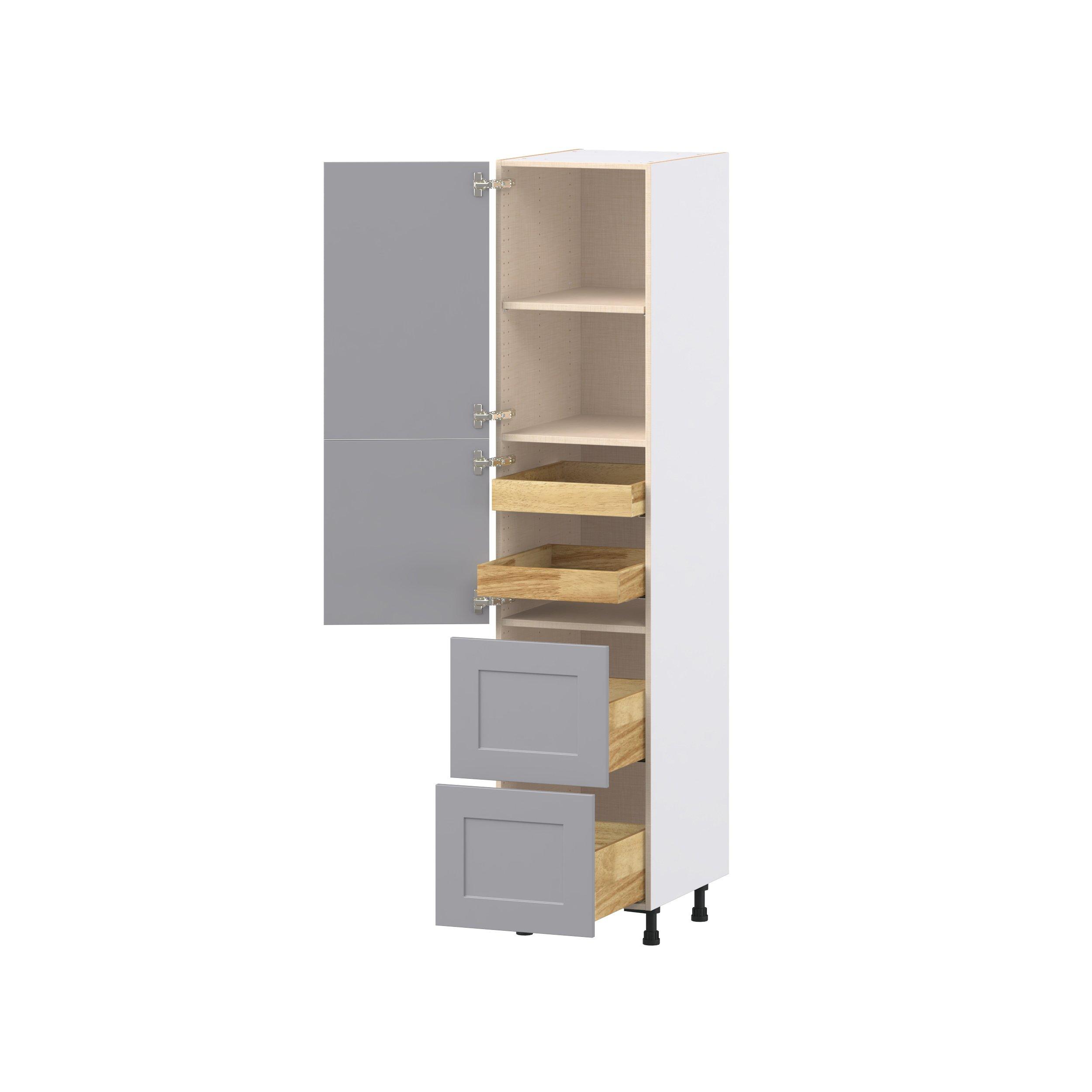 Transform your space with the elegance of Candler wide-rail shaker styles. Both the warm white and slate gray options create a rich transitional backdrop to complement any decor. Crafted from one-piece MDF Studio Design Collection Candler 18 in. Painted Slate Gray Door and Drawer Pantry Cabinet with Inner Pull-Out is designed to resist hairline cracks while the easy-to-clean finish stands up to stains and moisture. Featuring 5-piece doors and dovetail drawer joints, these cabinets offer durability and elegance. This collection combines style with everyday storage solutions.