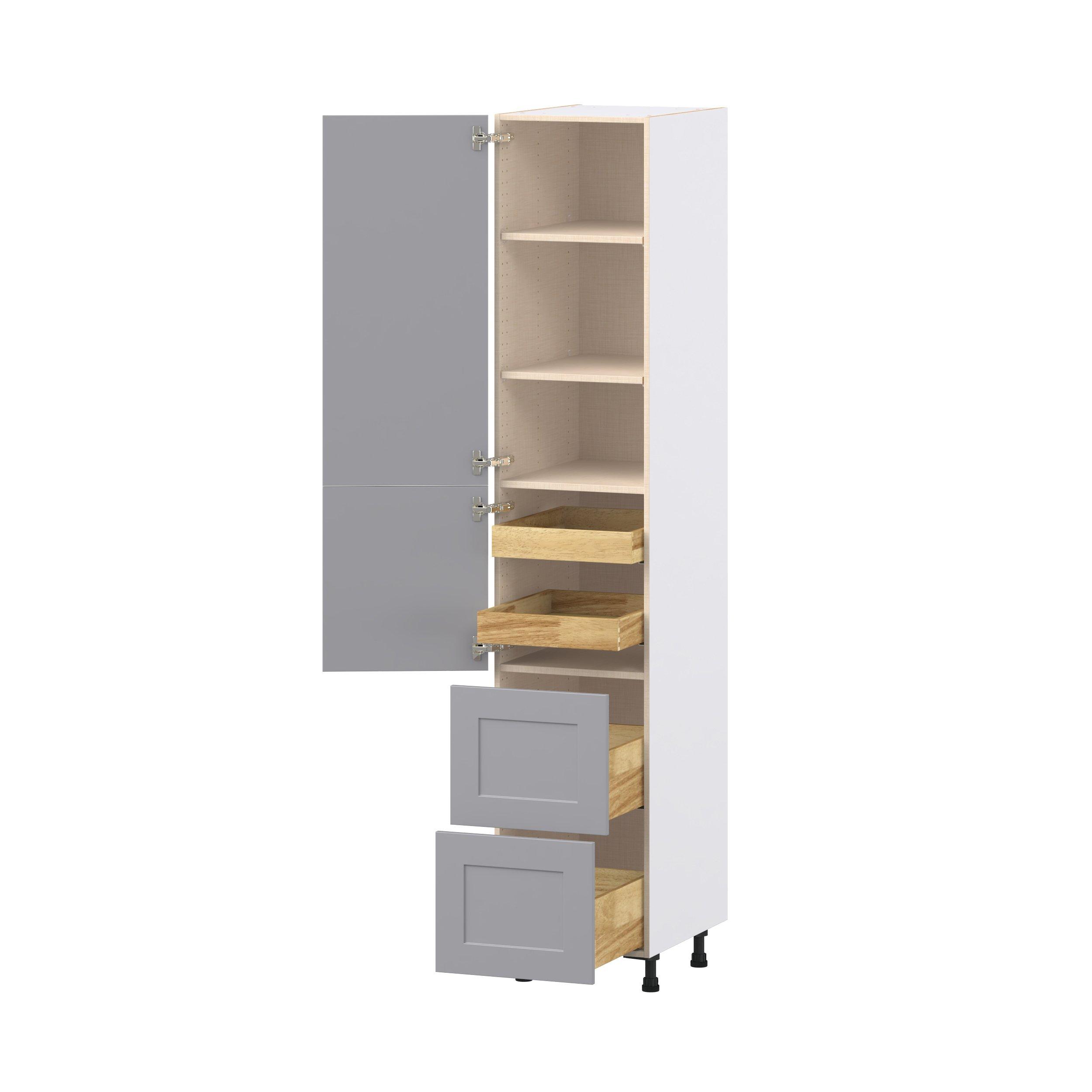 Transform your space with the elegance of Candler wide-rail shaker styles. Both the warm white and slate gray options create a rich transitional backdrop to complement any decor. Crafted from one-piece MDF Studio Design Collection Candler 18 in. Painted Slate Gray Door and Drawer Pantry Cabinet with Inner Pull-Out is designed to resist hairline cracks while the easy-to-clean finish stands up to stains and moisture. Featuring 5-piece doors and dovetail drawer joints, these cabinets offer durability and elegance. This collection combines style with everyday storage solutions.