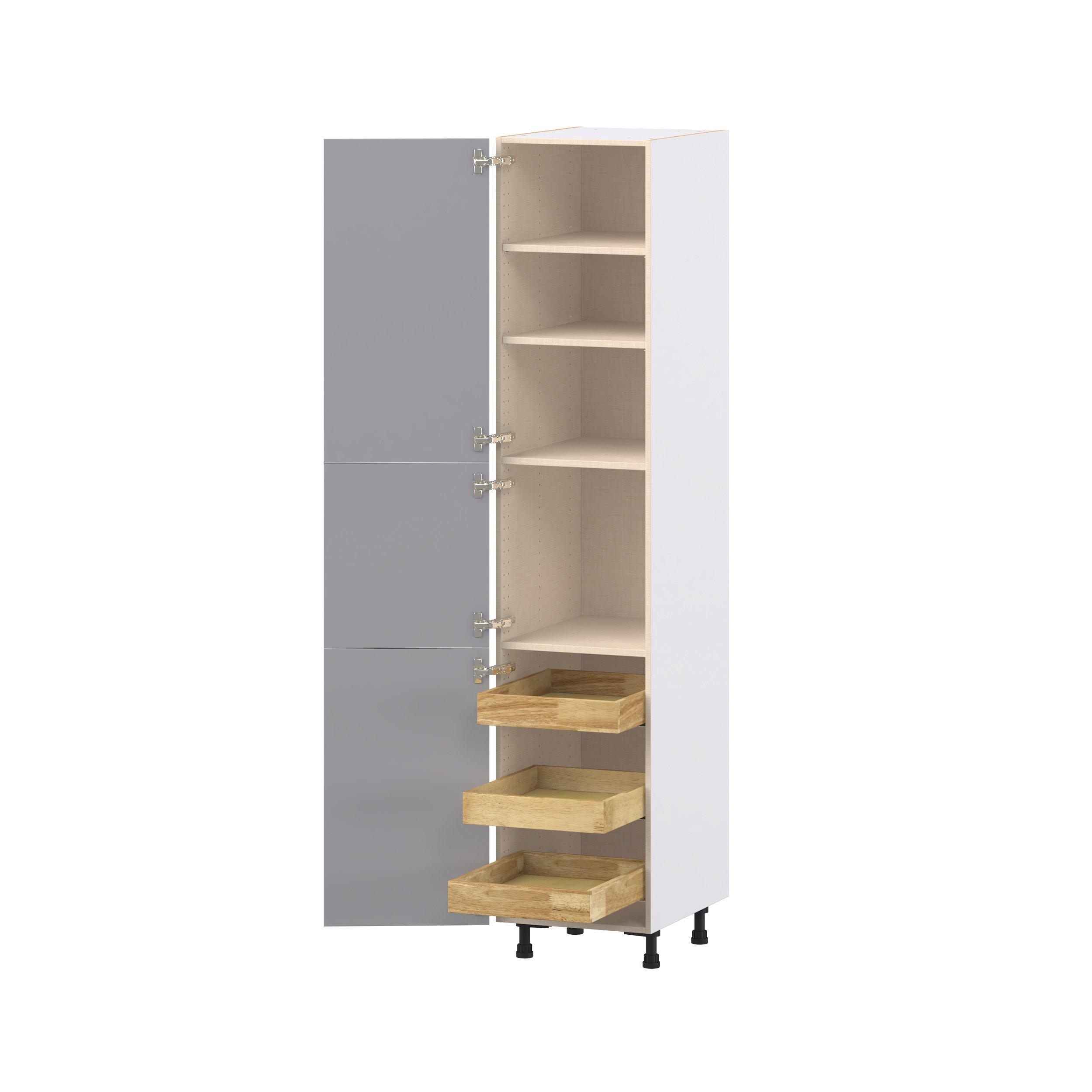 Transform your space with the elegance of Candler wide-rail shaker styles. Both the warm white and slate gray options create a rich transitional backdrop to complement any decor. Crafted from one-piece MDF Studio Design Collection Candler 18 in. Painted Slate Gray Pantry Cabinet with Inner Pull-Out Drawer is designed to resist hairline cracks while the easy-to-clean finish stands up to stains and moisture. Featuring 5-piece doors and dovetail drawer joints, these cabinets offer durability and elegance. This collection combines style with everyday storage solutions.
