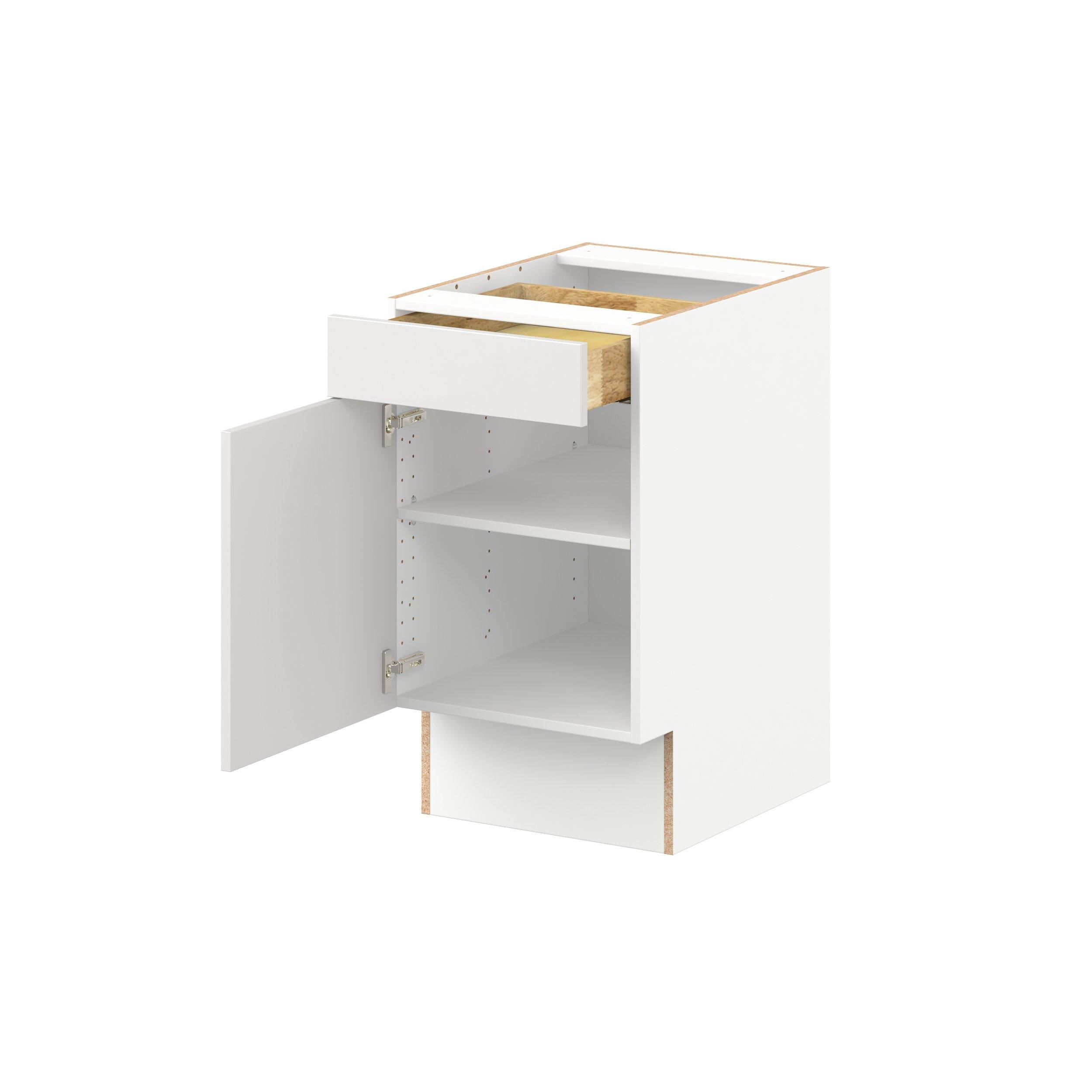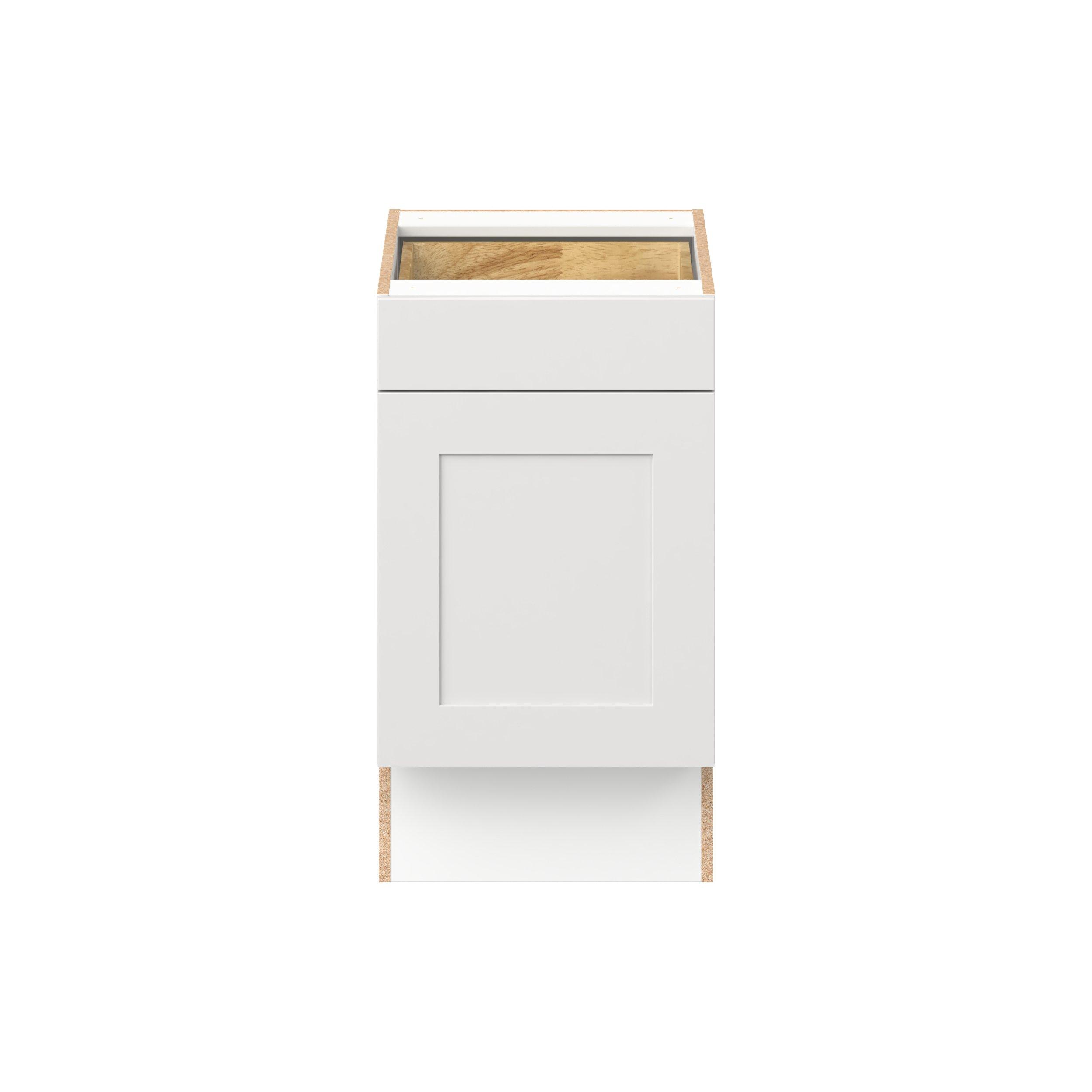 Transform your space with the elegance of Candler wide-rail shaker styles. Both the warm white and slate gray options create a rich transitional backdrop to complement any decor. Crafted from one-piece MDF Studio Design Collection Candler 18 in. Painted Warm White Door and Drawer Base Cabinet - ADA is designed to resist hairline cracks while the easy-to-clean finish stands up to stains and moisture. Featuring 5-piece doors and dovetail drawer joints, these cabinets offer durability and elegance. This collection combines style with everyday storage solutions.