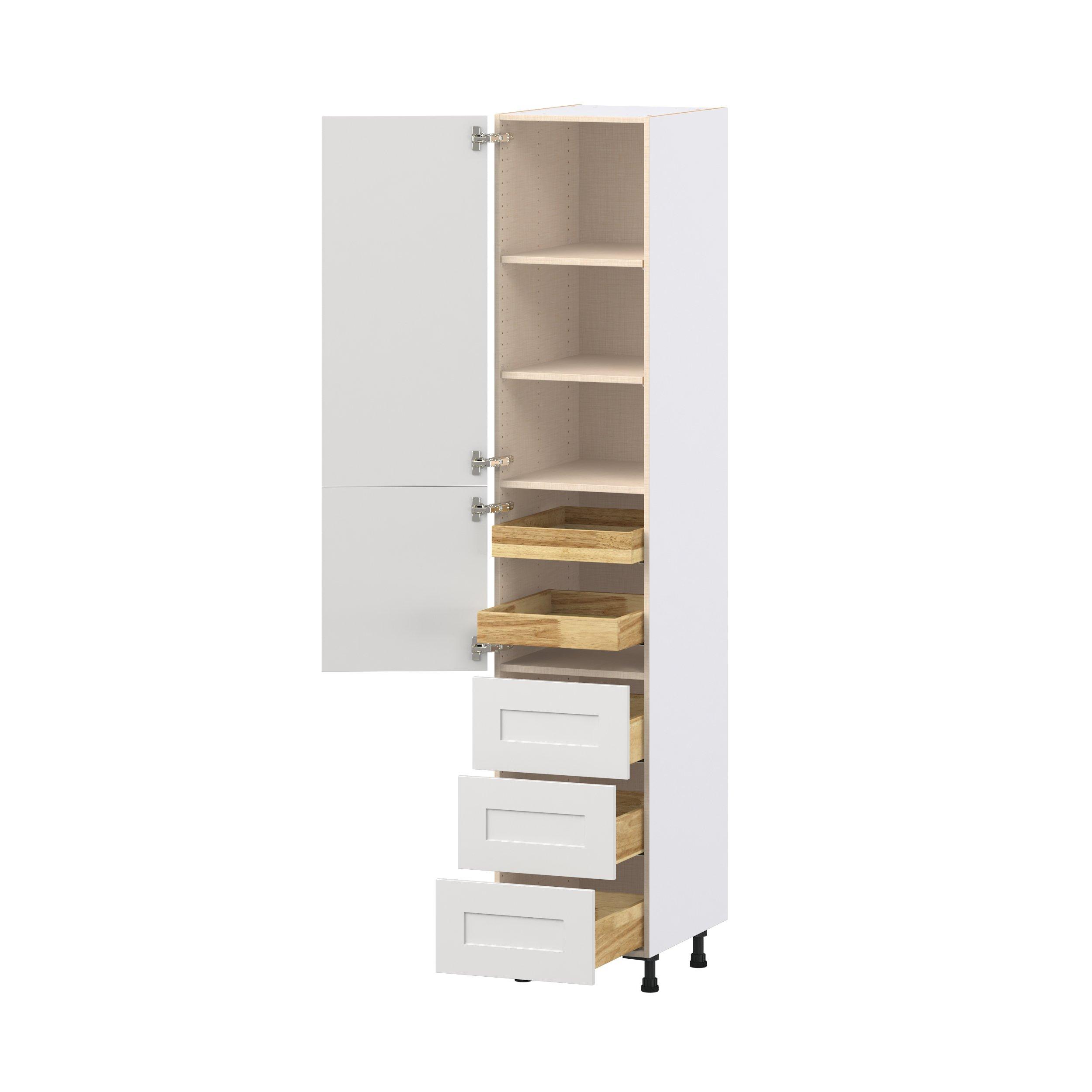 Transform your space with the elegance of Candler wide-rail shaker styles. Both the warm white and slate gray options create a rich transitional backdrop to complement any decor. Crafted from one-piece MDF Studio Design Collection Candler 18 in. Painted Warm White Door and Drawer Pantry Cabinet with Inner Pull-Out is designed to resist hairline cracks while the easy-to-clean finish stands up to stains and moisture. Featuring 5-piece doors and dovetail drawer joints, these cabinets offer durability and elegance. This collection combines style with everyday storage solutions.