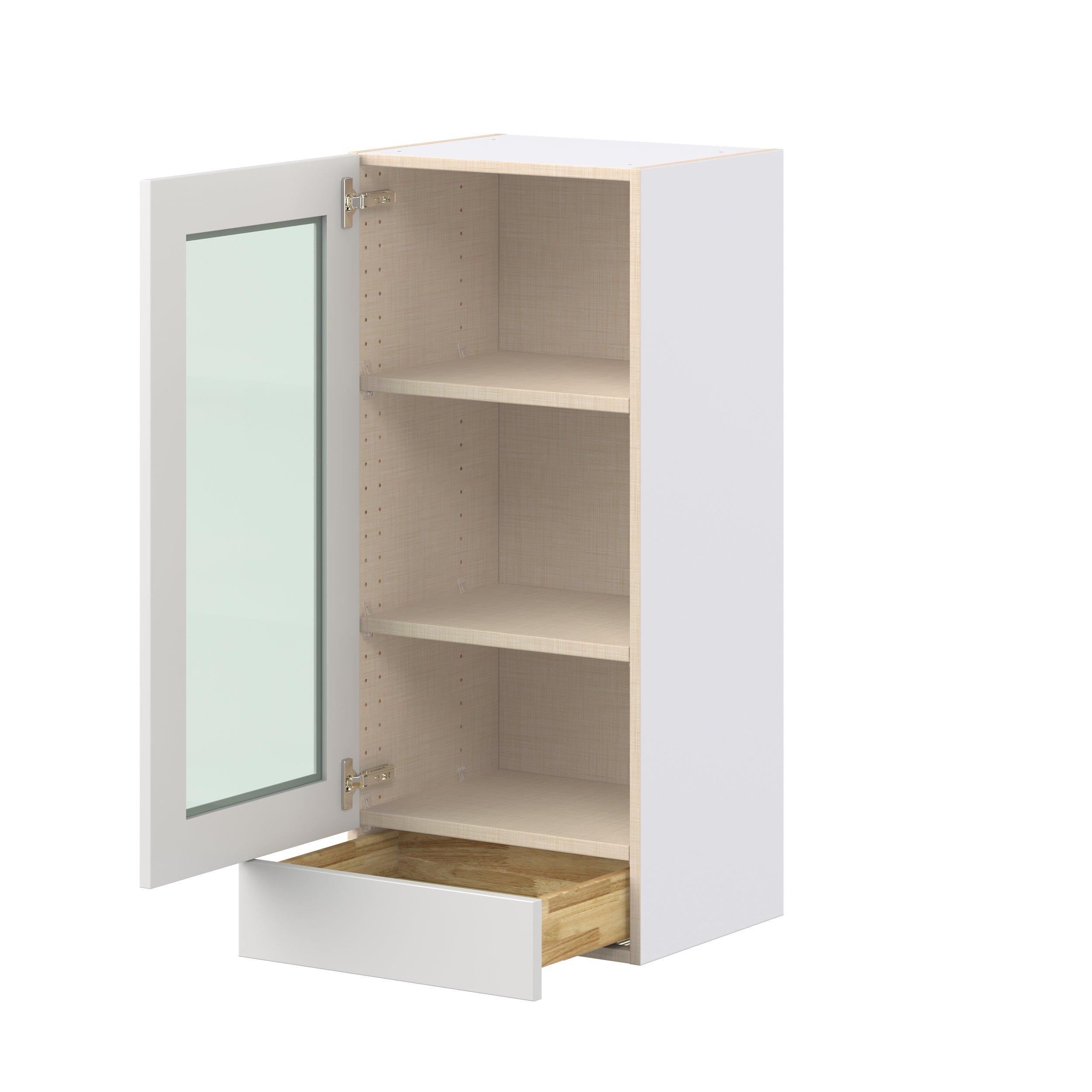 Transform your space with the elegance of Candler wide-rail shaker styles. Both the warm white and slate gray options create a rich transitional backdrop to complement any decor. Crafted from one-piece MDF Studio Design Collection Candler 18 in. Painted Warm White Drawer Wall Cabinet with Glass Door is designed to resist hairline cracks while the easy-to-clean finish stands up to stains and moisture. Featuring 5-piece doors and dovetail drawer joints, these cabinets offer durability and elegance. This collection combines style with everyday storage solutions.