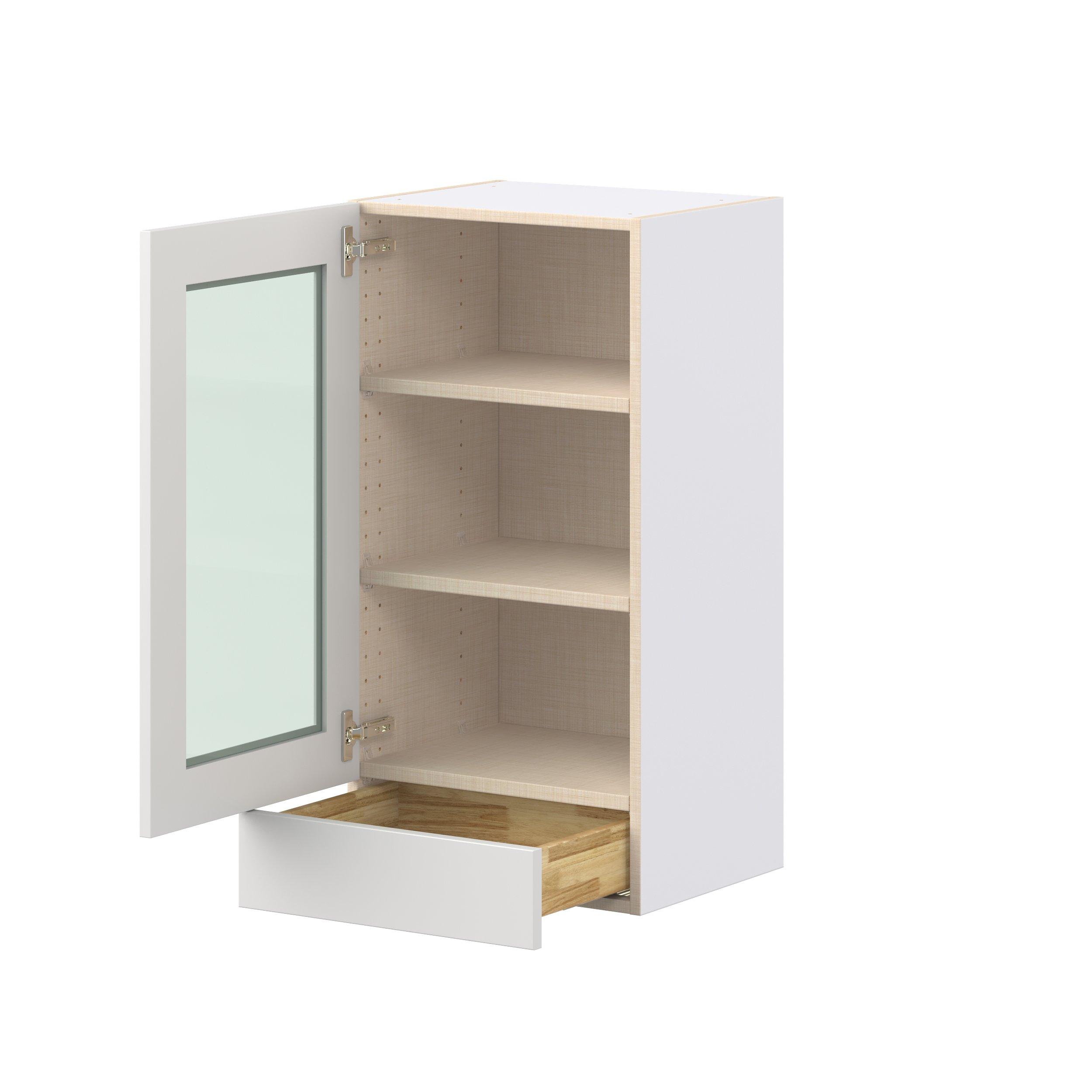 Transform your space with the elegance of Candler wide-rail shaker styles. Both the warm white and slate gray options create a rich transitional backdrop to complement any decor. Crafted from one-piece MDF Studio Design Collection Candler 18 in. Painted Warm White Drawer Wall Cabinet with Glass Door is designed to resist hairline cracks while the easy-to-clean finish stands up to stains and moisture. Featuring 5-piece doors and dovetail drawer joints, these cabinets offer durability and elegance. This collection combines style with everyday storage solutions.