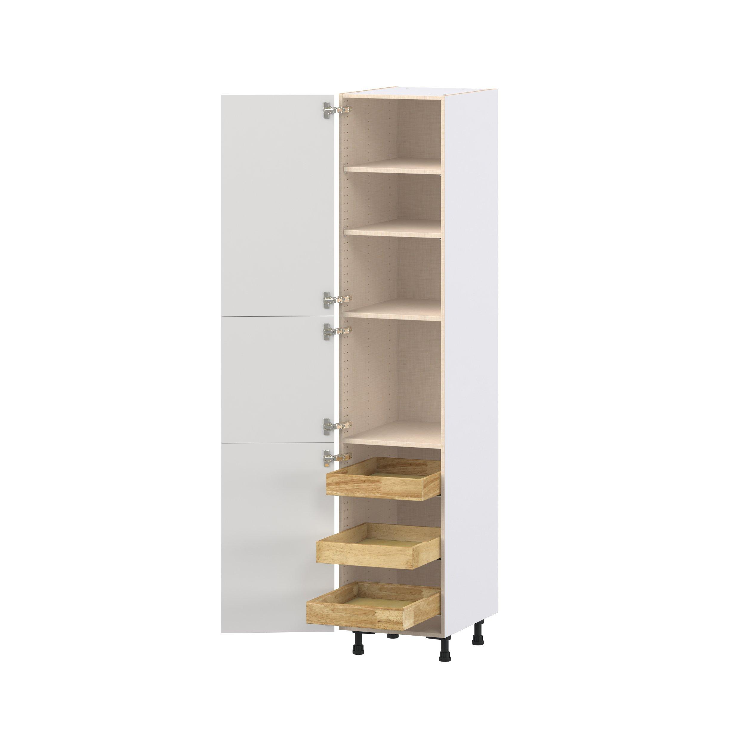 Transform your space with the elegance of Candler wide-rail shaker styles. Both the warm white and slate gray options create a rich transitional backdrop to complement any decor. Crafted from one-piece MDF Studio Design Collection Candler 18 in. Painted Warm White Pantry Cabinet with Inner Pull-Out Drawer is designed to resist hairline cracks while the easy-to-clean finish stands up to stains and moisture. Featuring 5-piece doors and dovetail drawer joints, these cabinets offer durability and elegance. This collection combines style with everyday storage solutions.