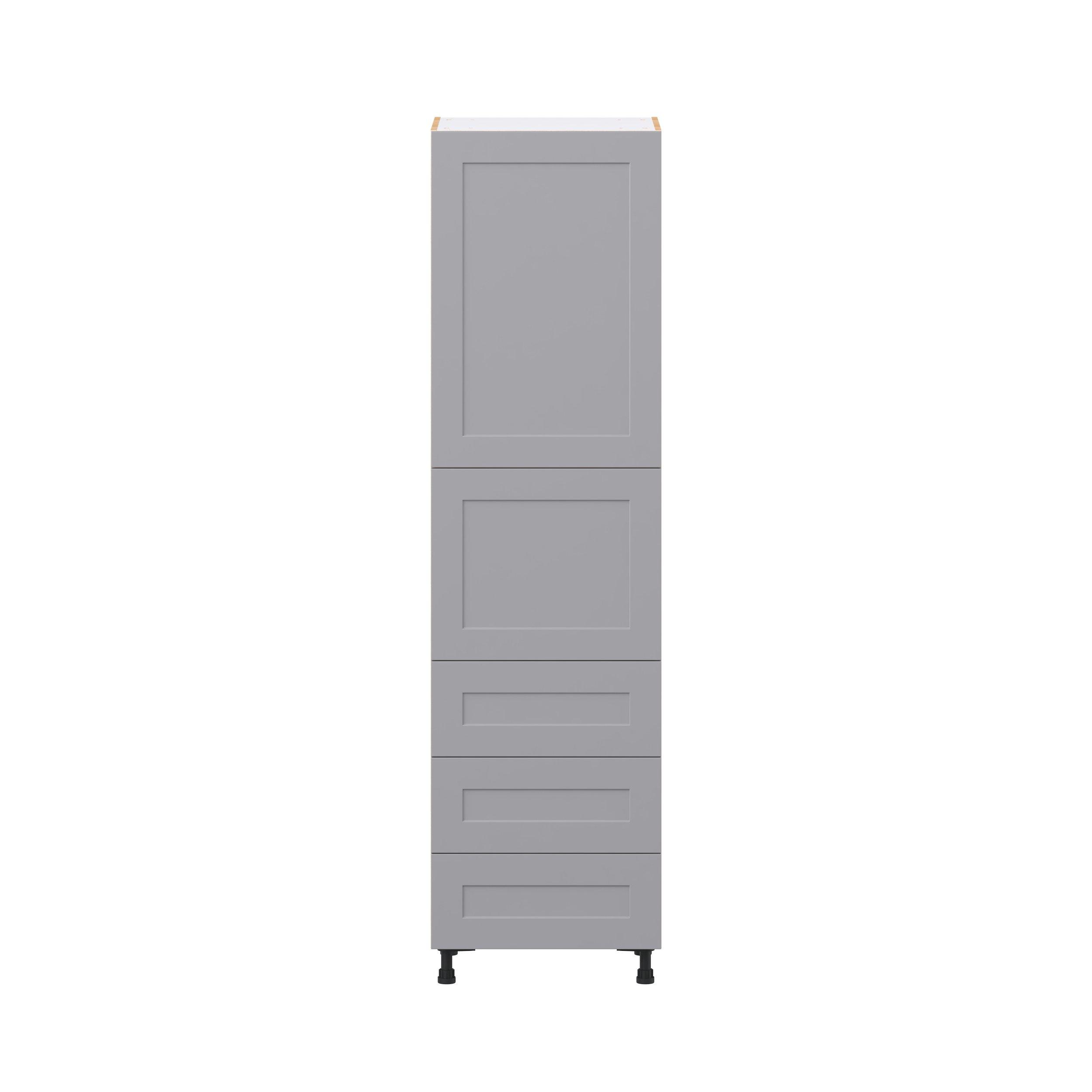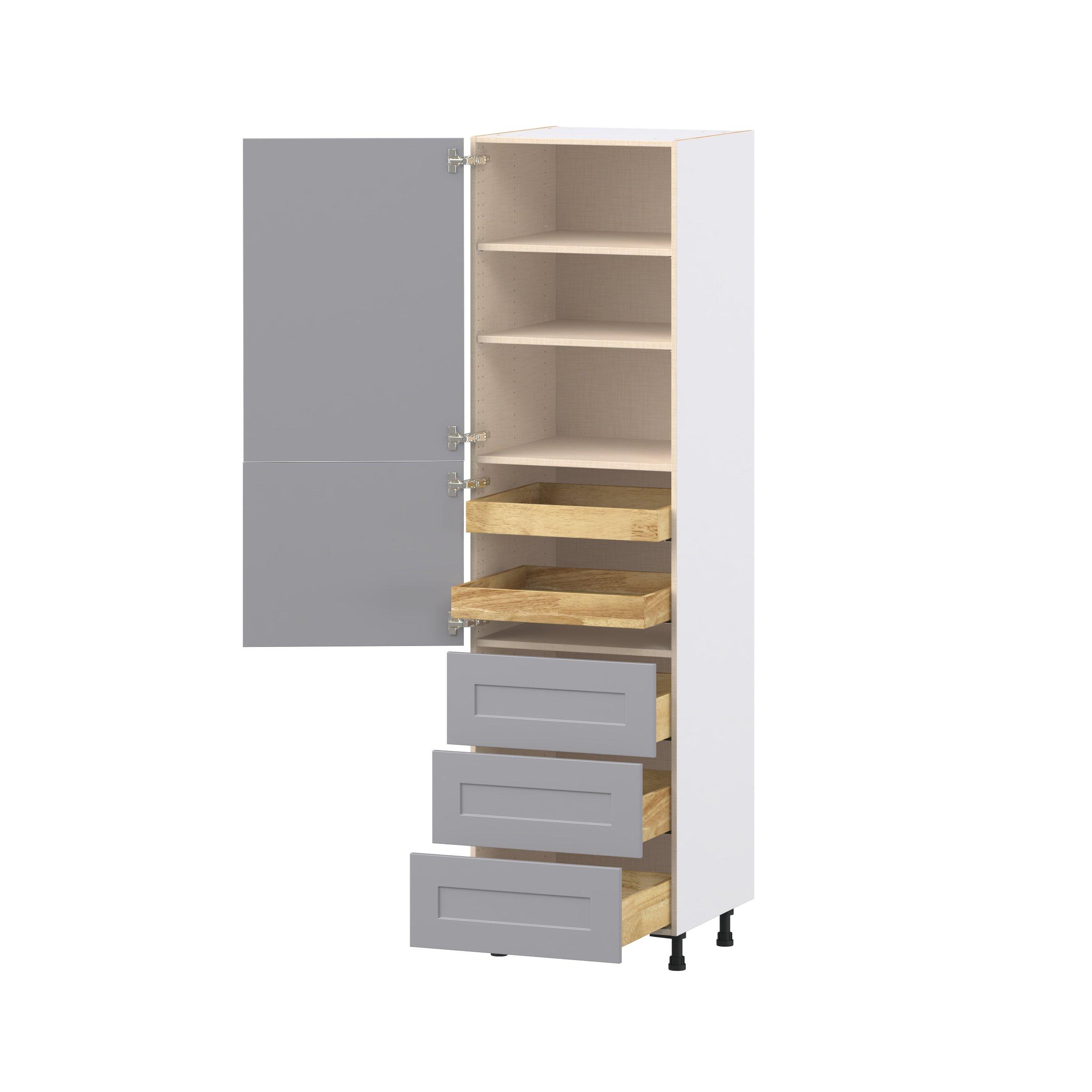Transform your space with the elegance of Candler wide-rail shaker styles. Both the warm white and slate gray options create a rich transitional backdrop to complement any decor. Crafted from one-piece MDF Studio Design Collection Candler 24 in. Painted Slate Gray Door and Drawer Pantry Cabinet with Inner Pull-Out is designed to resist hairline cracks while the easy-to-clean finish stands up to stains and moisture. Featuring 5-piece doors and dovetail drawer joints, these cabinets offer durability and elegance. This collection combines style with everyday storage solutions.