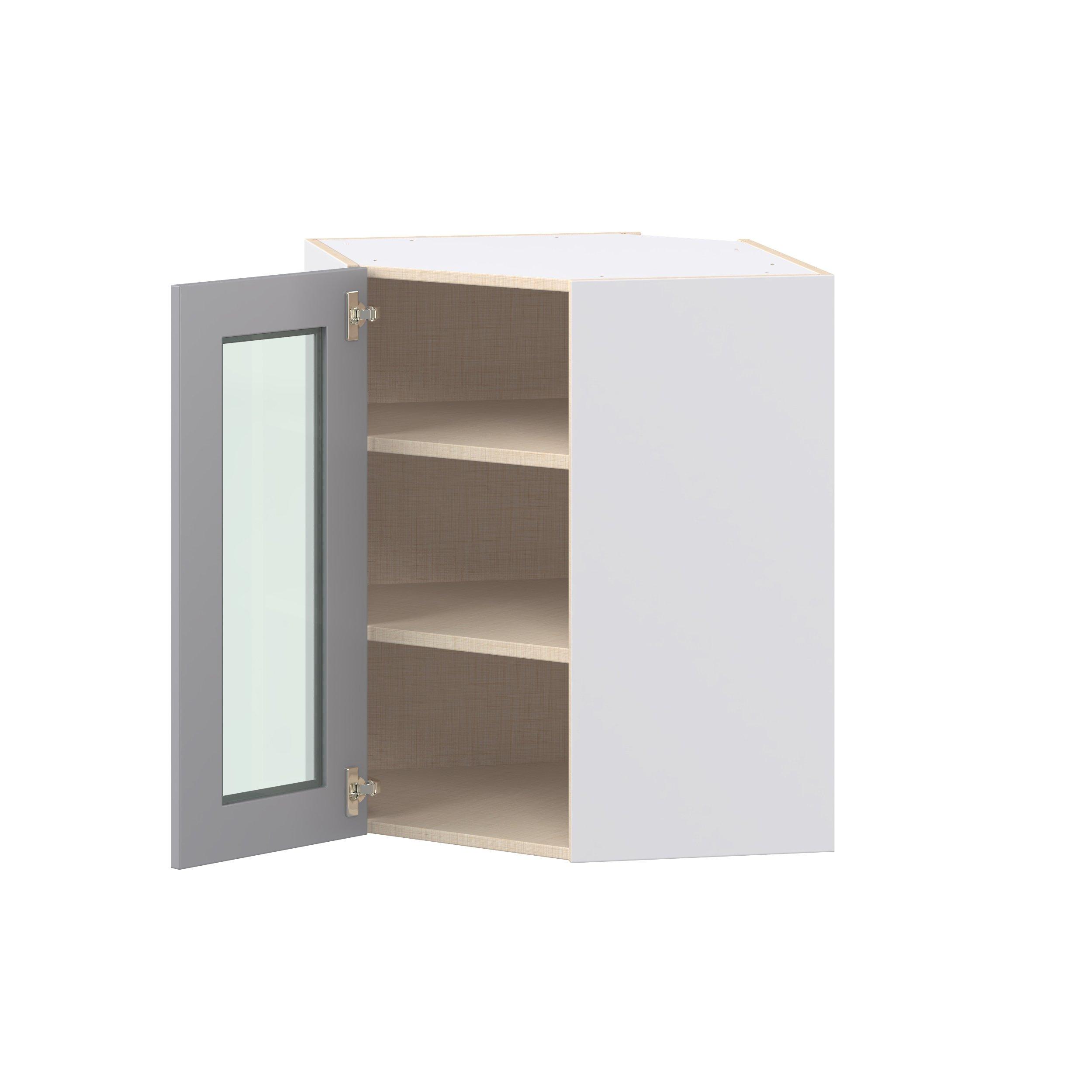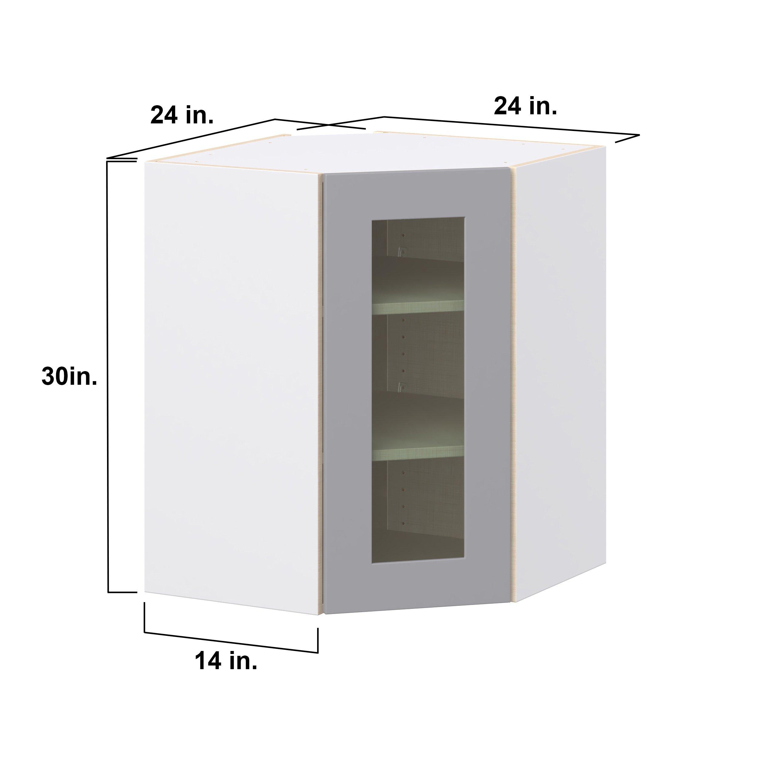 Transform your space with the elegance of Candler wide-rail shaker styles. Both the warm white and slate gray options create a rich transitional backdrop to complement any decor. Crafted from one-piece MDF Studio Design Collection Candler 24 in. Painted Slate Gray Wall Angle Corner Cabinet with Glass Door is designed to resist hairline cracks while the easy-to-clean finish stands up to stains and moisture. Featuring 5-piece doors and dovetail drawer joints, these cabinets offer durability and elegance. This collection combines style with everyday storage solutions.