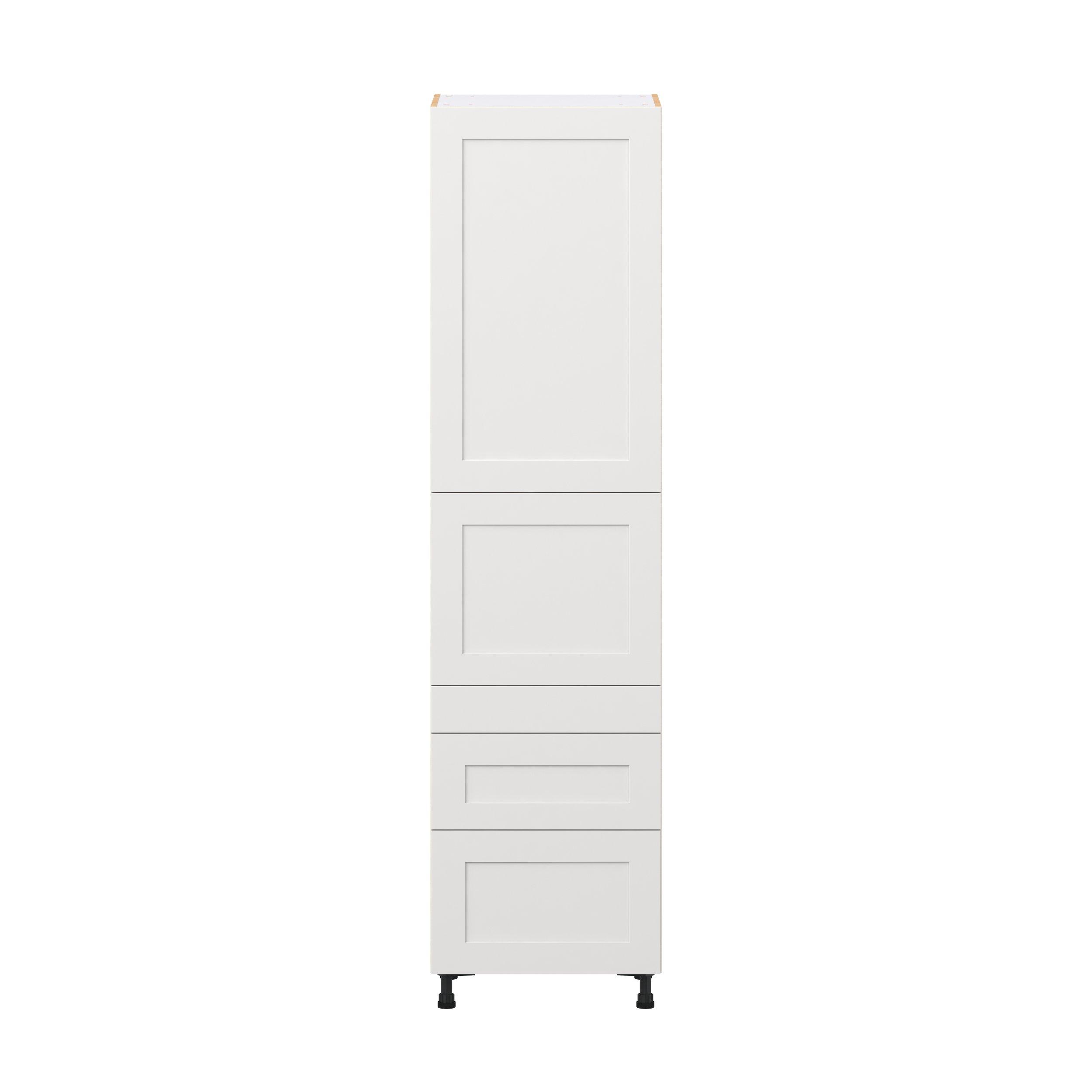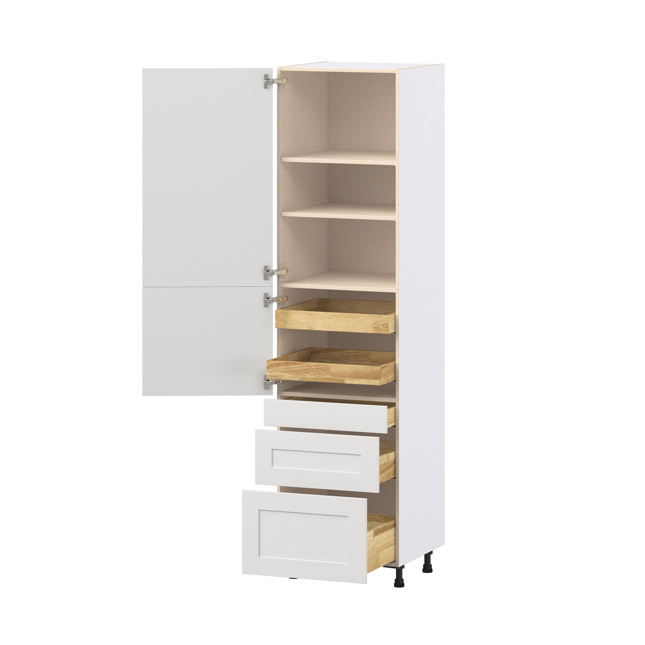 Transform your space with the elegance of Candler wide-rail shaker styles. Both the warm white and slate gray options create a rich transitional backdrop to complement any decor. Crafted from one-piece MDF Studio Design Collection Candler 24 in. Painted Warm White Door and Drawer Pantry Cabinet with Inner Pull-Out is designed to resist hairline cracks while the easy-to-clean finish stands up to stains and moisture. Featuring 5-piece doors and dovetail drawer joints, these cabinets offer durability and elegance. This collection combines style with everyday storage solutions.