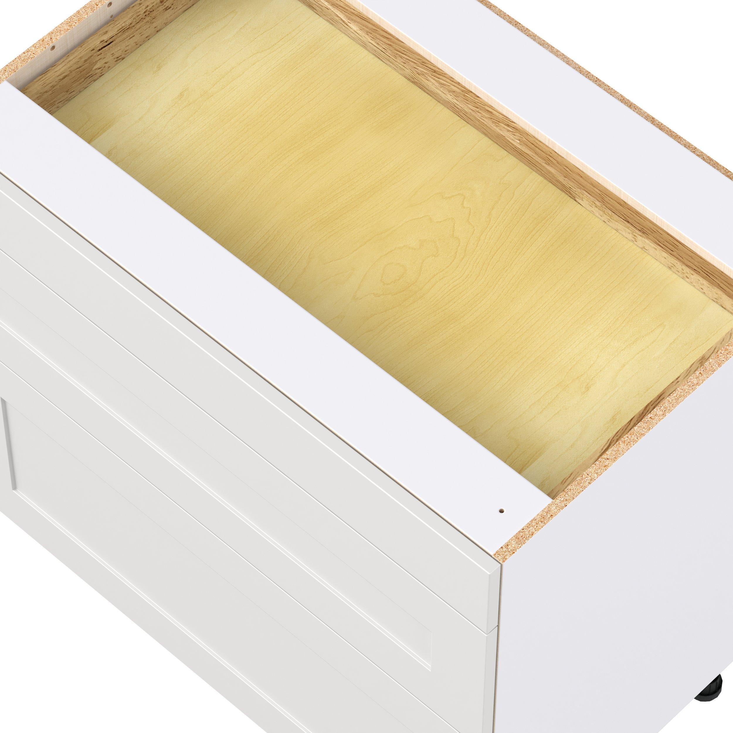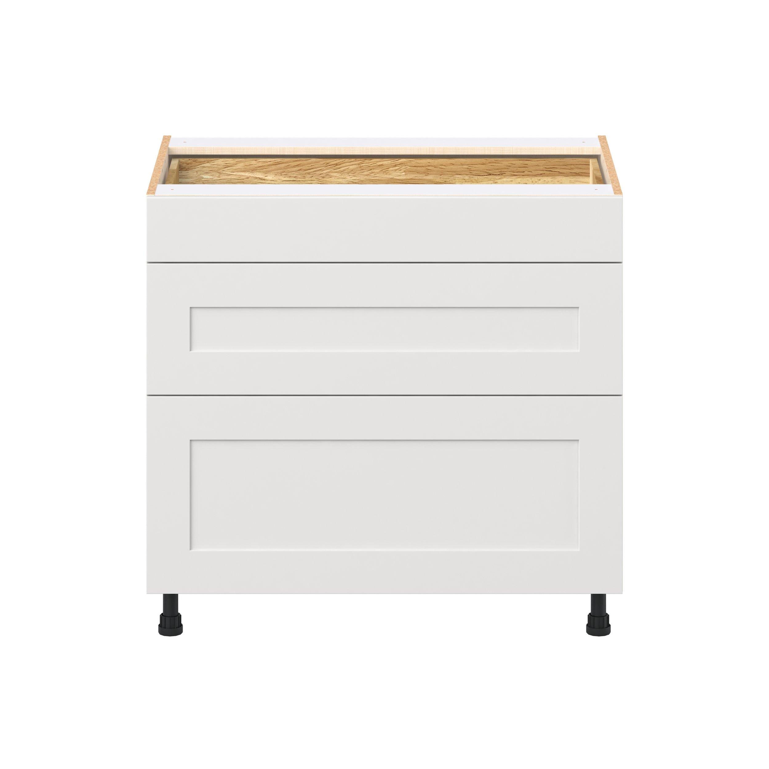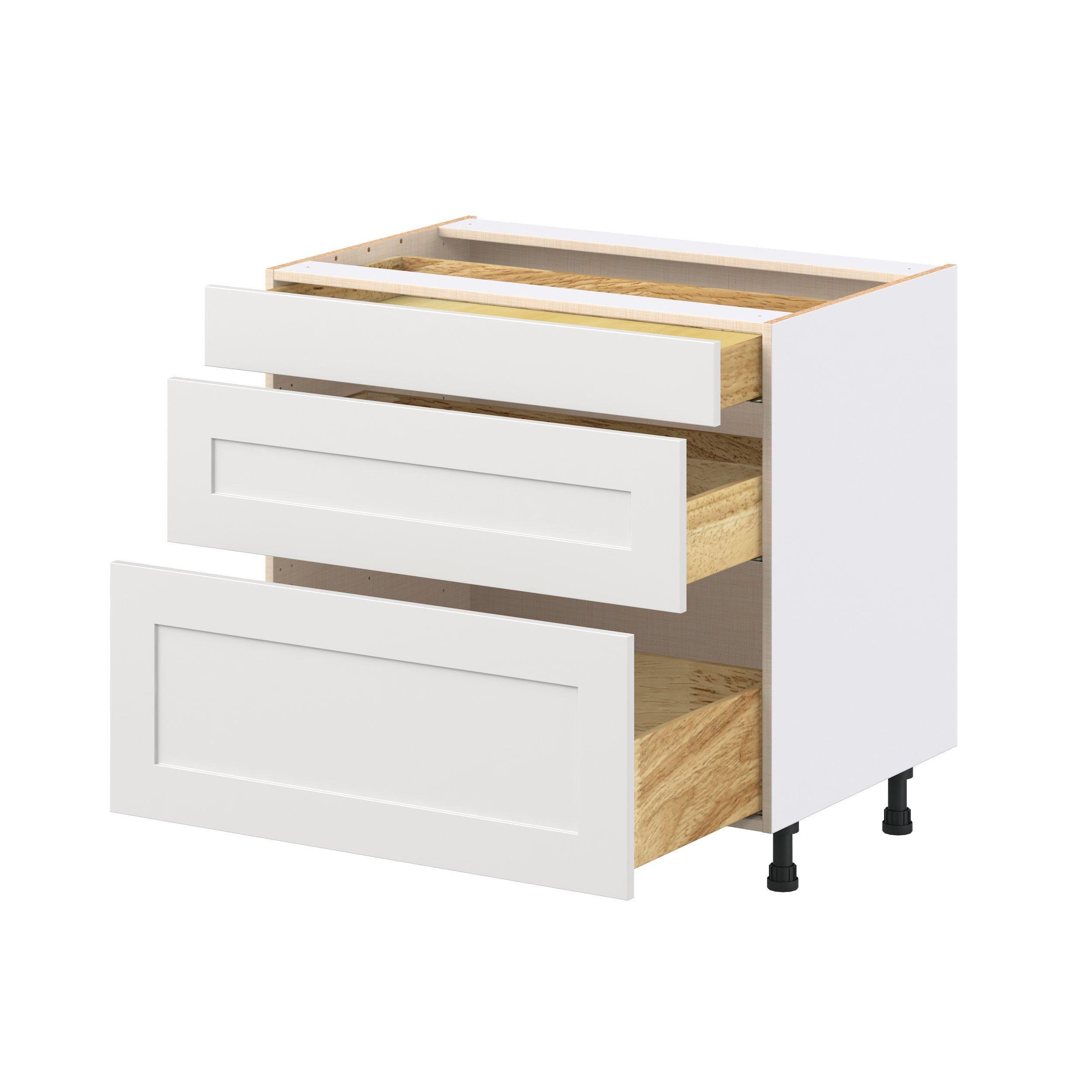 Transform your space with the elegance of Candler wide-rail shaker styles. Both the warm white and slate gray options create a rich transitional backdrop to complement any decor. Crafted from one-piece MDF Studio Design Collection Candler 36 in. Painted Warm White Drawer Base Cabinet is designed to resist hairline cracks while the easy-to-clean finish stands up to stains and moisture. Featuring 5-piece doors and dovetail drawer joints, these cabinets offer durability and elegance. This collection combines style with everyday storage solutions.