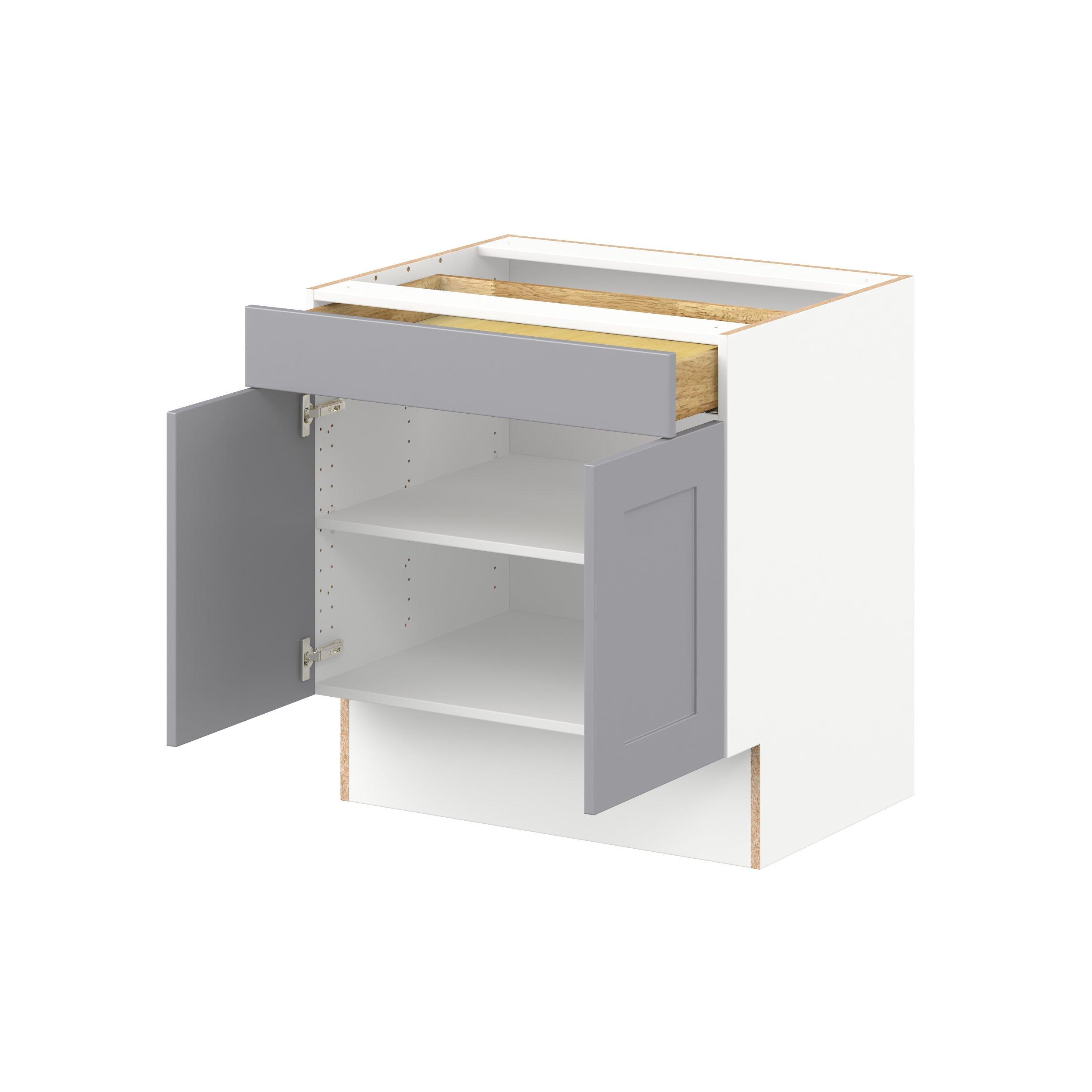 Transform your space with the elegance of Candler wide-rail shaker styles. Both the warm white and slate gray options create a rich transitional backdrop to complement any decor. Crafted from one-piece MDF Studio Design Collection Candler 30 in. Painted Slate Gray Door and Drawer Base Cabinet - ADA is designed to resist hairline cracks while the easy-to-clean finish stands up to stains and moisture. Featuring 5-piece doors and dovetail drawer joints, these cabinets offer durability and elegance. This collection combines style with everyday storage solutions.