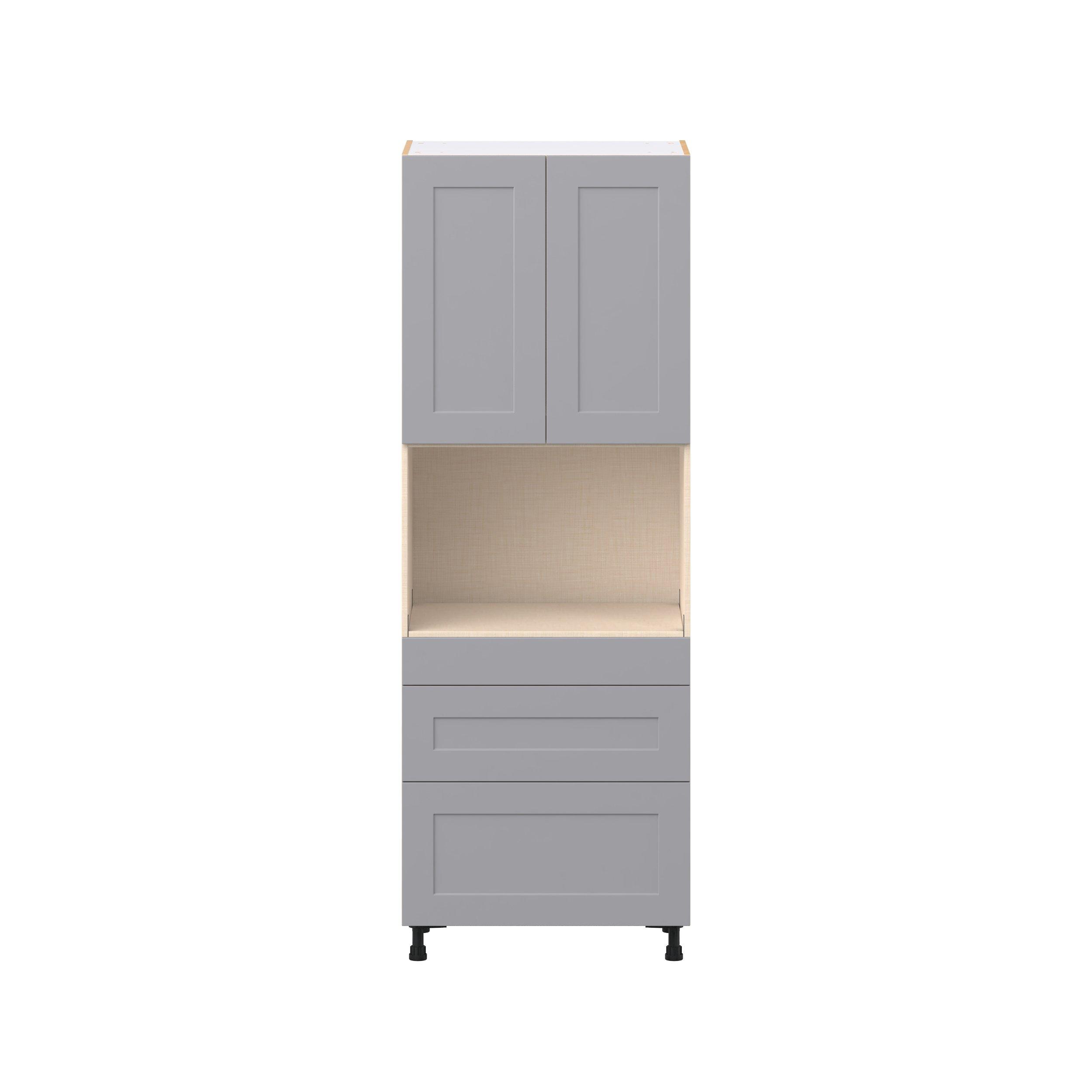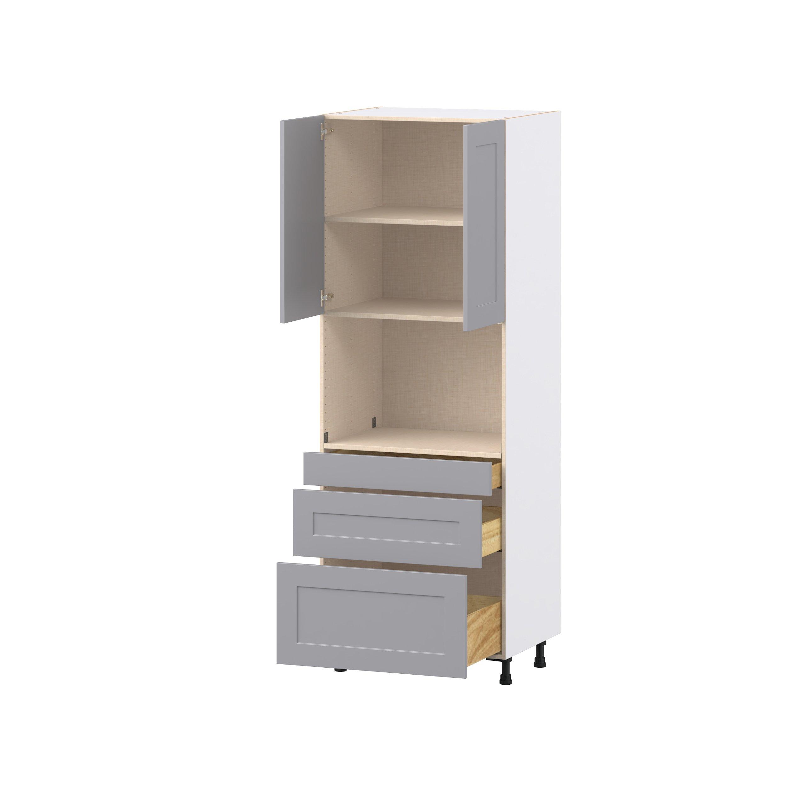 Transform your space with the elegance of Candler wide-rail shaker styles. Both the warm white and slate gray options create a rich transitional backdrop to complement any decor. Crafted from one-piece MDF Studio Design Collection Candler 30 in. Painted Slate Gray Door and Drawer Microwave Pantry Cabinet is designed to resist hairline cracks while the easy-to-clean finish stands up to stains and moisture. Featuring 5-piece doors and dovetail drawer joints, these cabinets offer durability and elegance. This collection combines style with everyday storage solutions.