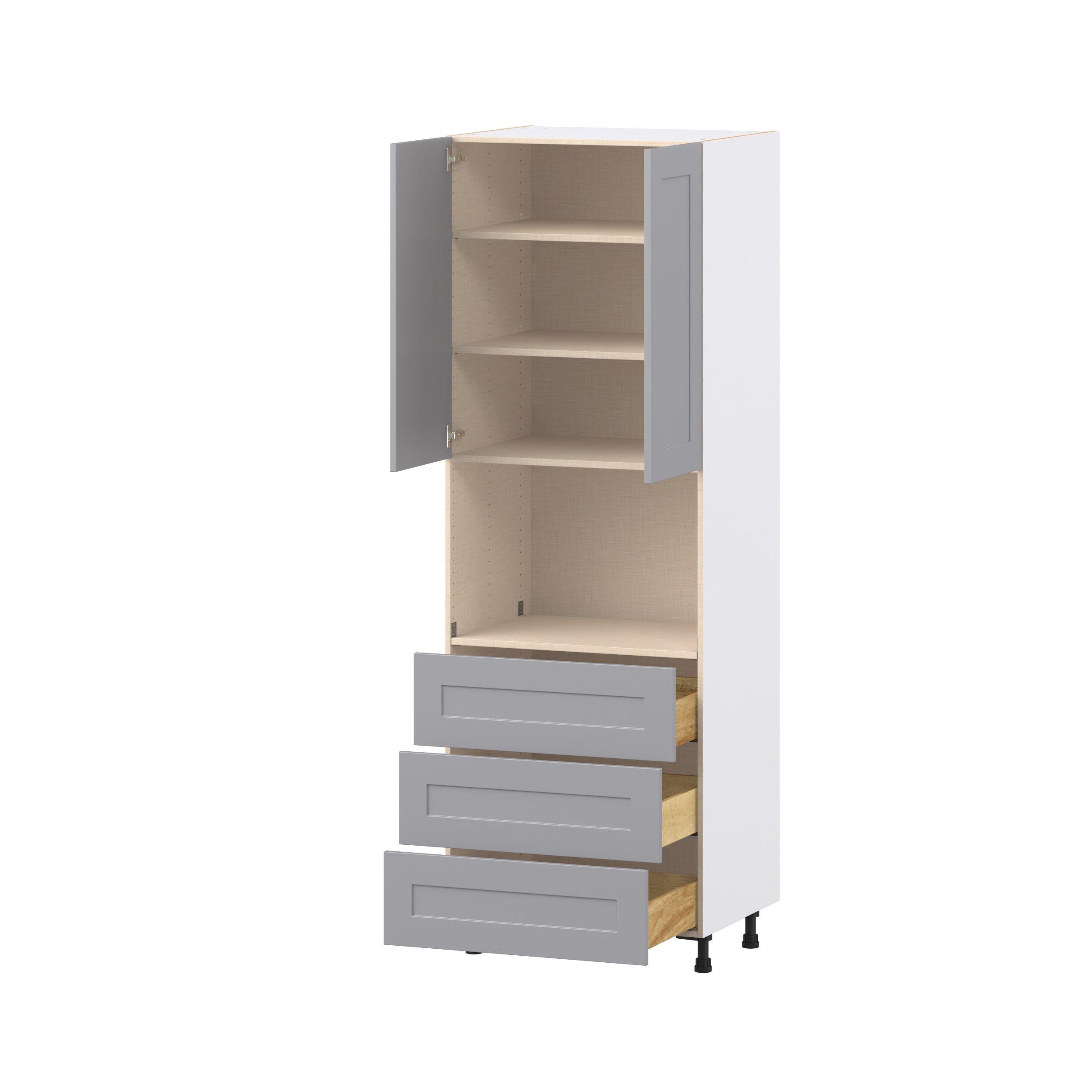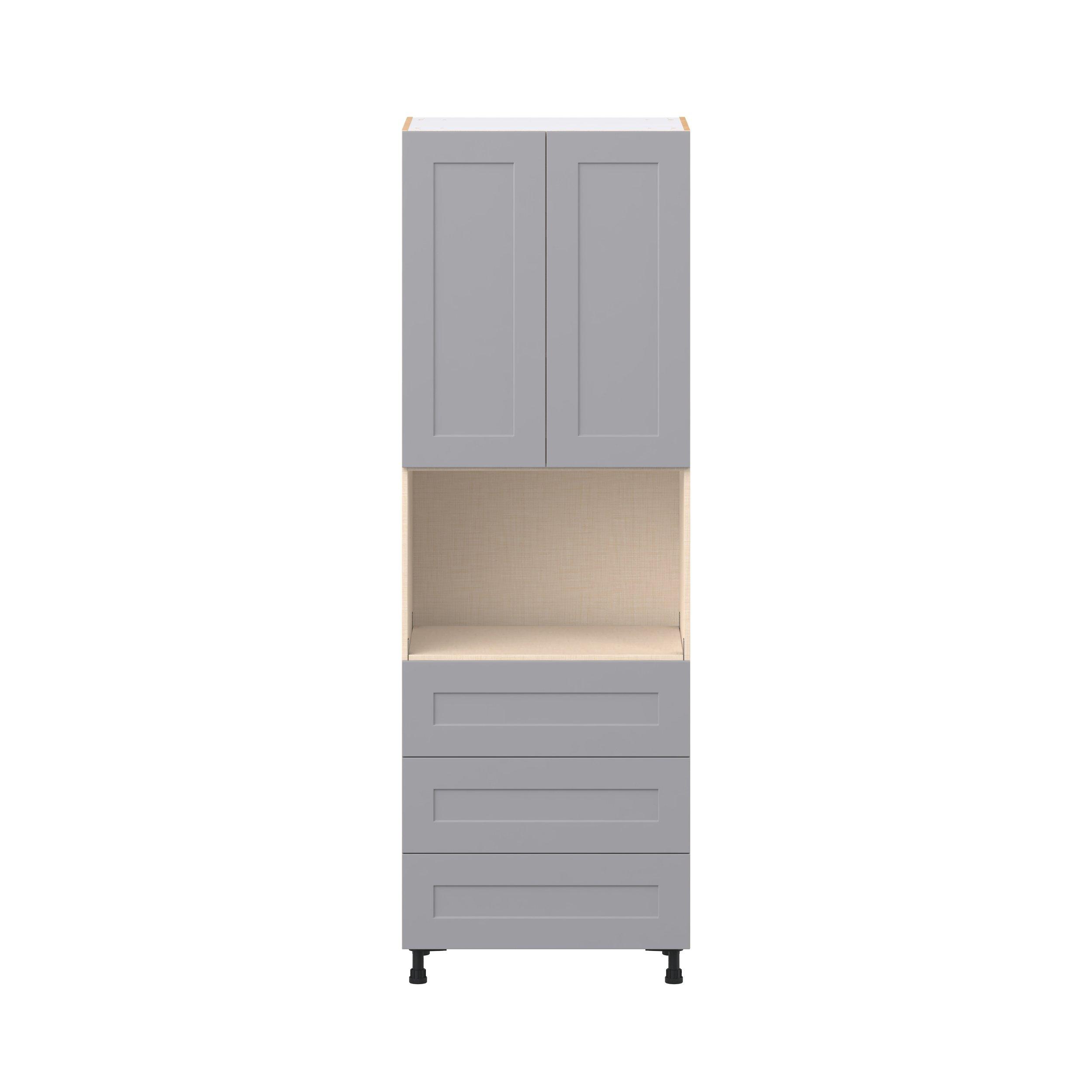 Transform your space with the elegance of Candler wide-rail shaker styles. Both the warm white and slate gray options create a rich transitional backdrop to complement any decor. Crafted from one-piece MDF Studio Design Collection Candler 30 in. Painted Slate Gray Door and Drawer Microwave Pantry Cabinet is designed to resist hairline cracks while the easy-to-clean finish stands up to stains and moisture. Featuring 5-piece doors and dovetail drawer joints, these cabinets offer durability and elegance. This collection combines style with everyday storage solutions.