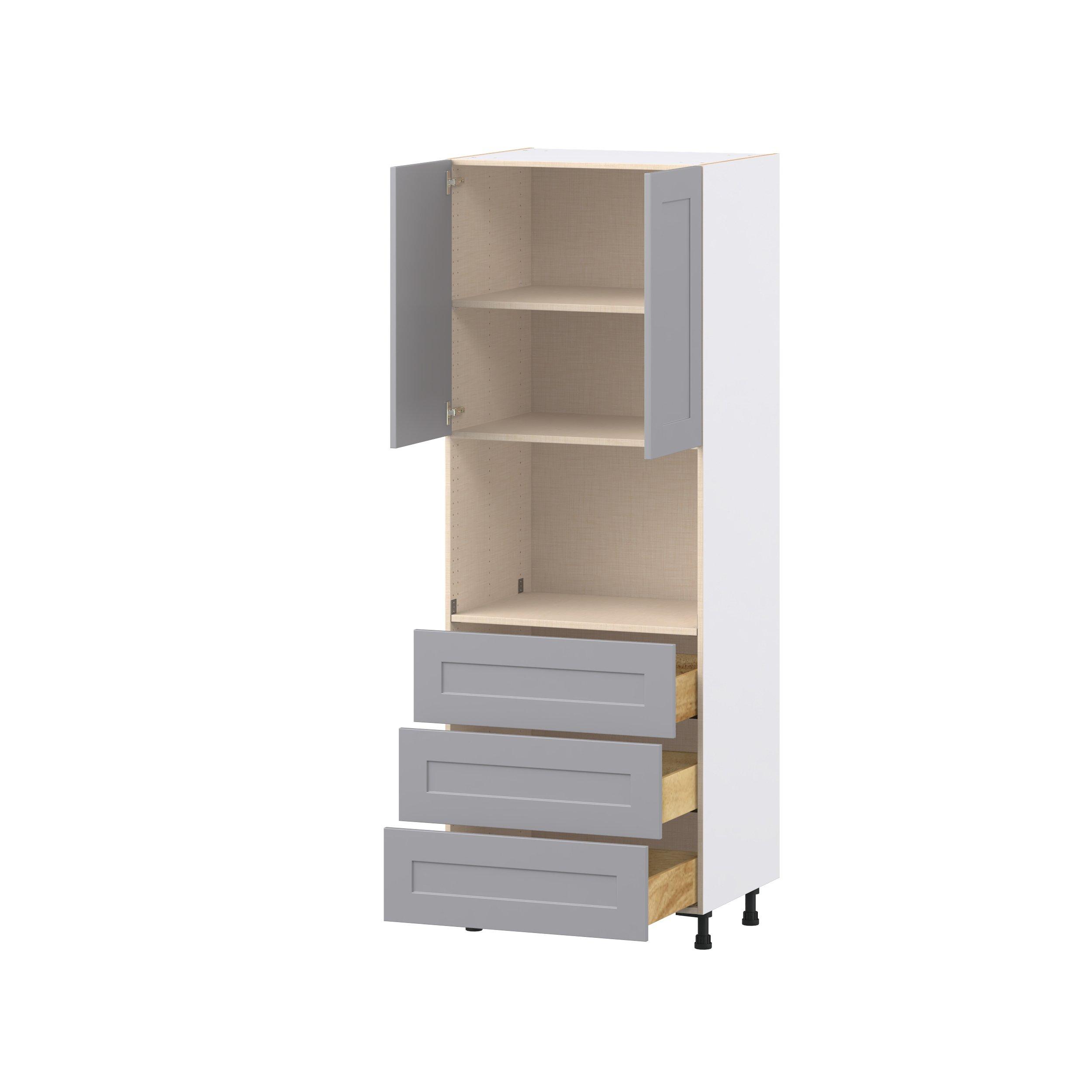 Transform your space with the elegance of Candler wide-rail shaker styles. Both the warm white and slate gray options create a rich transitional backdrop to complement any decor. Crafted from one-piece MDF Studio Design Collection Candler 30 in. Painted Slate Gray Door and Drawer Microwave Pantry Cabinet is designed to resist hairline cracks while the easy-to-clean finish stands up to stains and moisture. Featuring 5-piece doors and dovetail drawer joints, these cabinets offer durability and elegance. This collection combines style with everyday storage solutions.